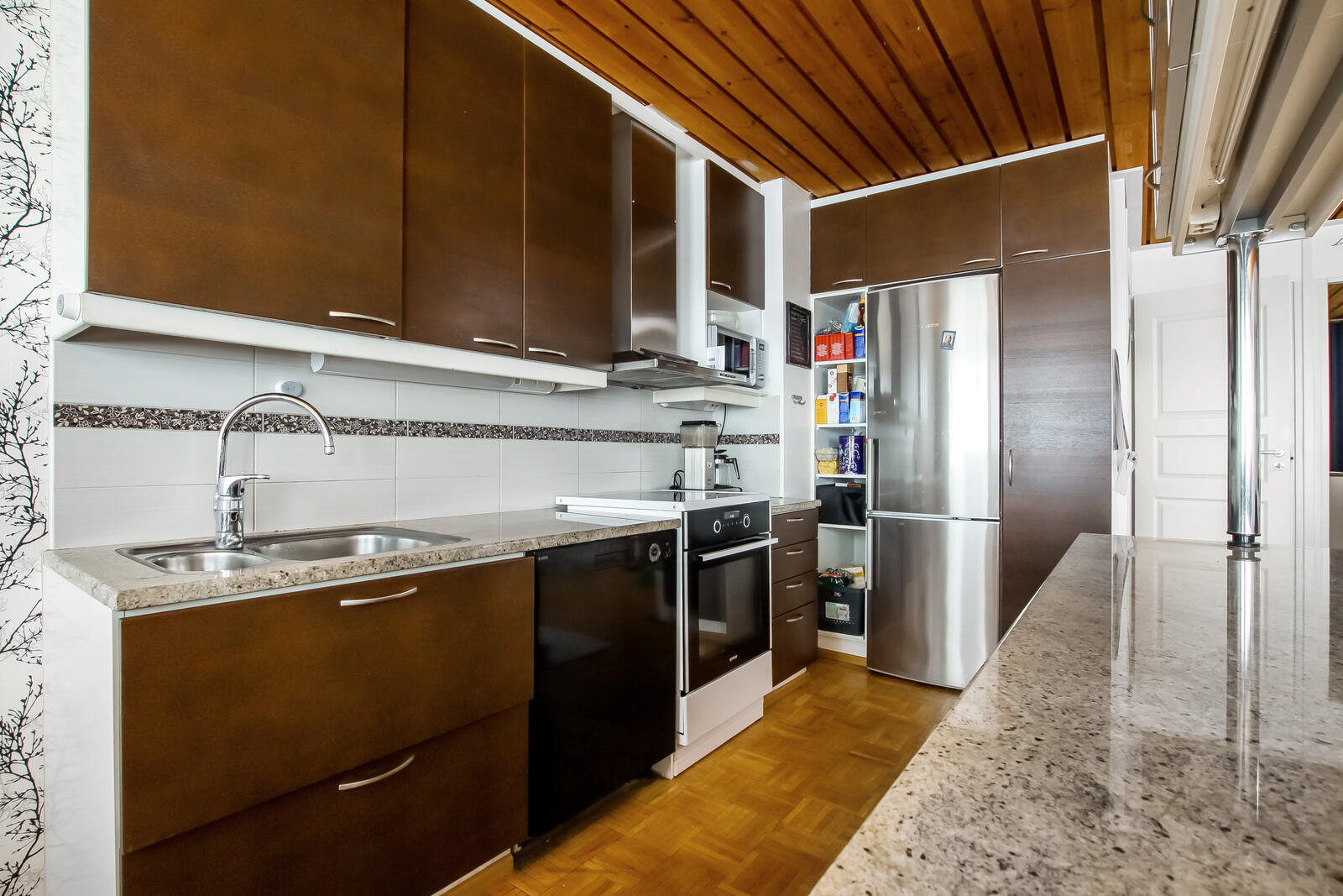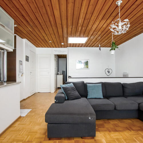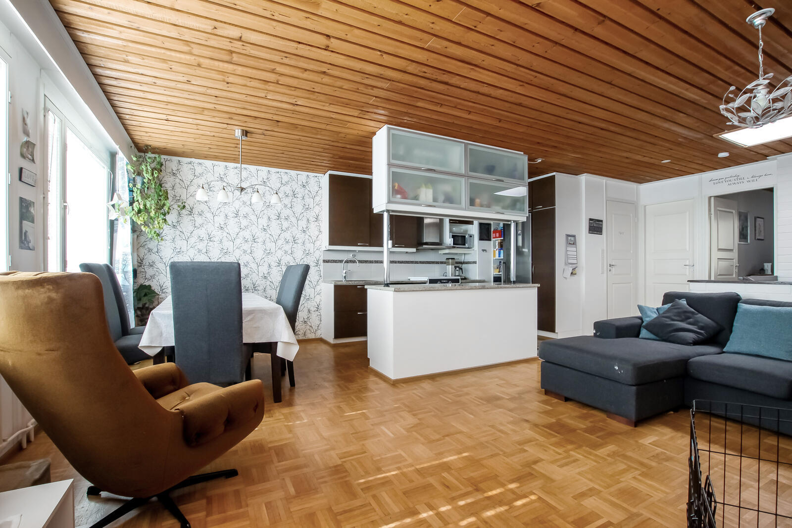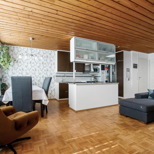 Keittiö ja olohuone ovat mukavasti yhdessä, muodostaen yhtenäisen ja valoisan oleskelutilan, jossa on helppo viettää aikaa perheen ja ystävien kanssa.