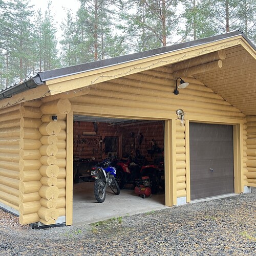 Lisätietoa rakennuksesta: Kahden auton talli ja varasto. Rakennus on hirsirunkoinen ja betonilaatalla. Harjakatto ja kateaineena pelti. Toisella sivulla terassi. rakennus on valmistunut 2000- luvulla.