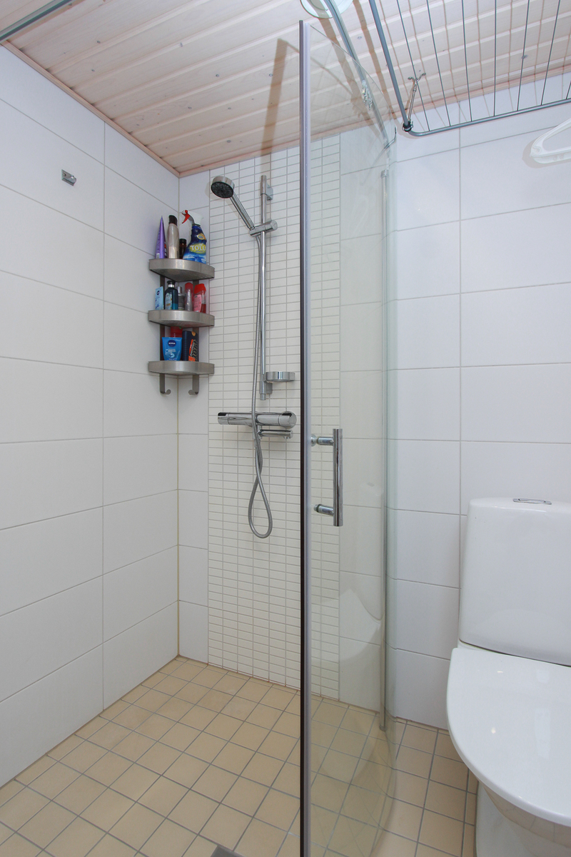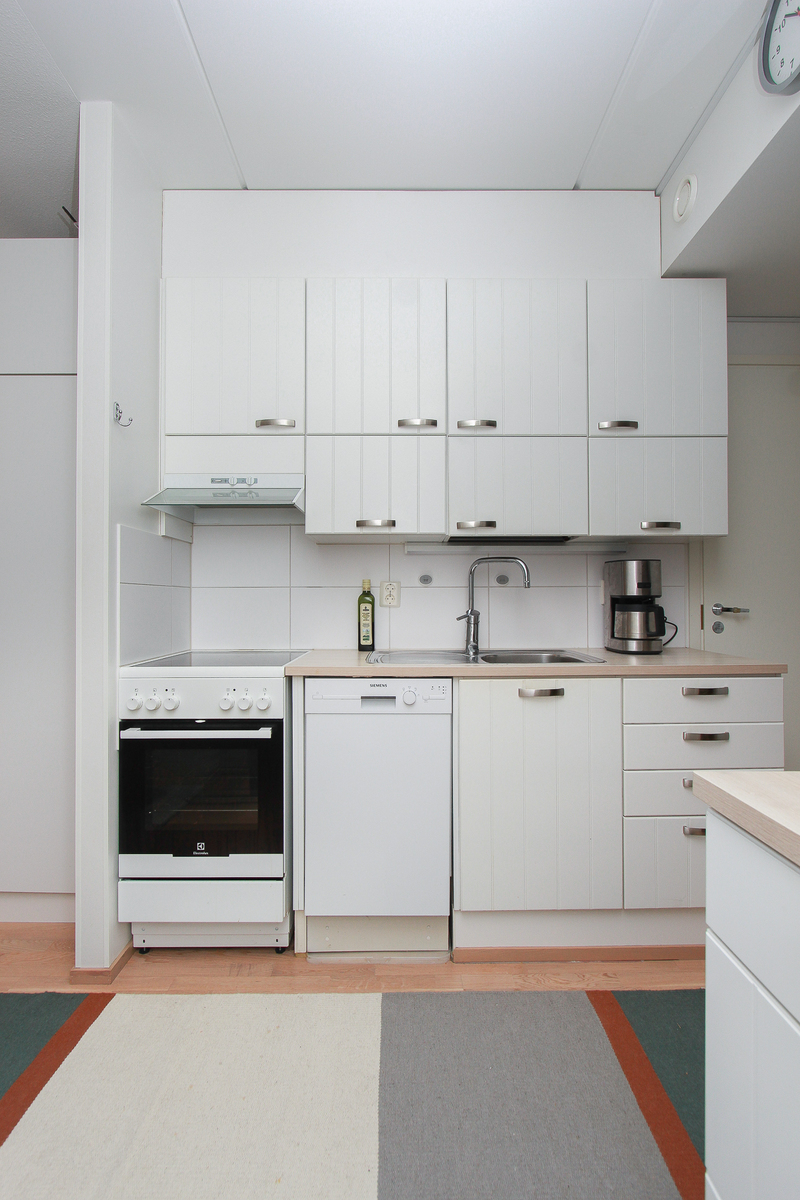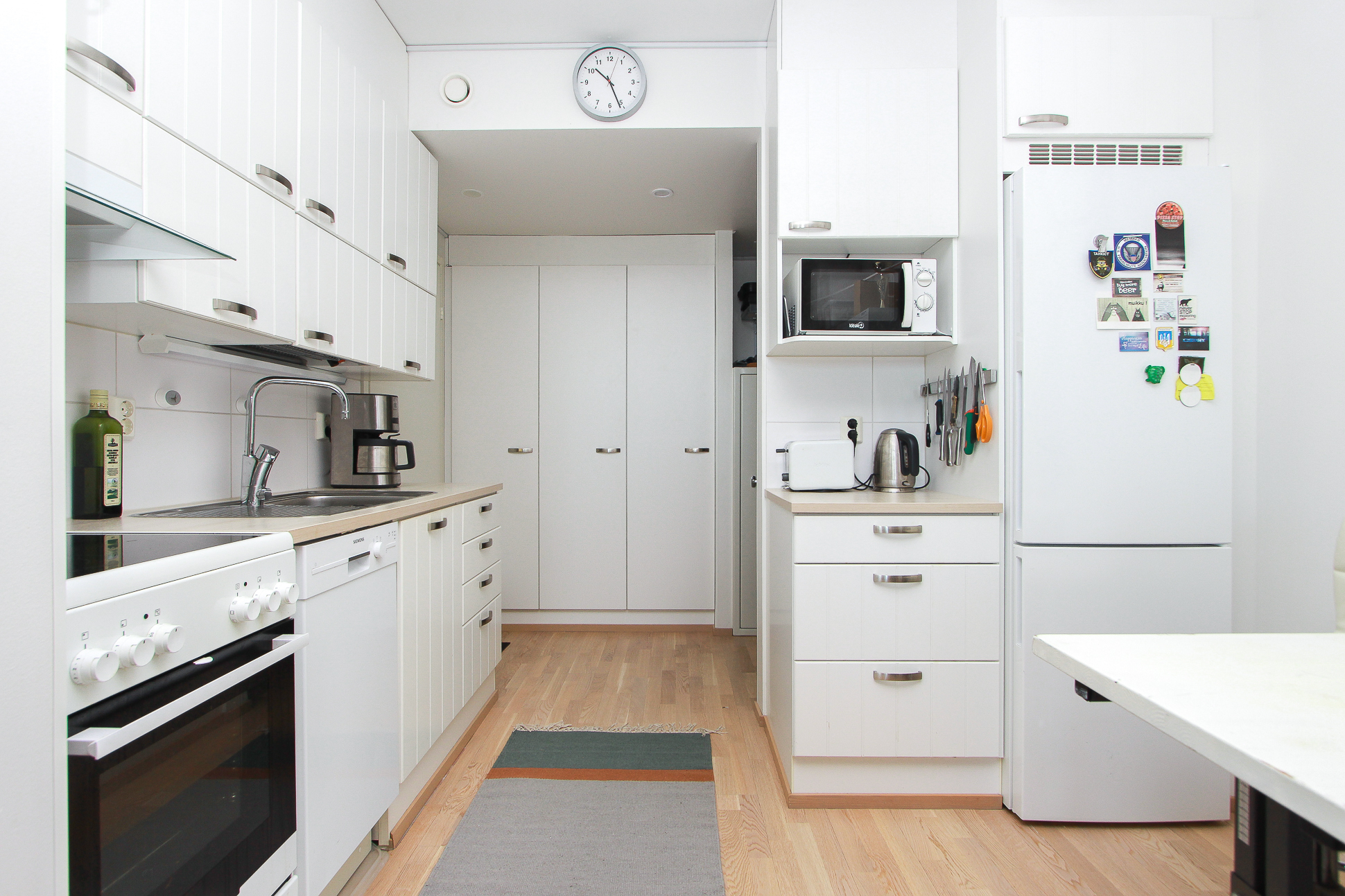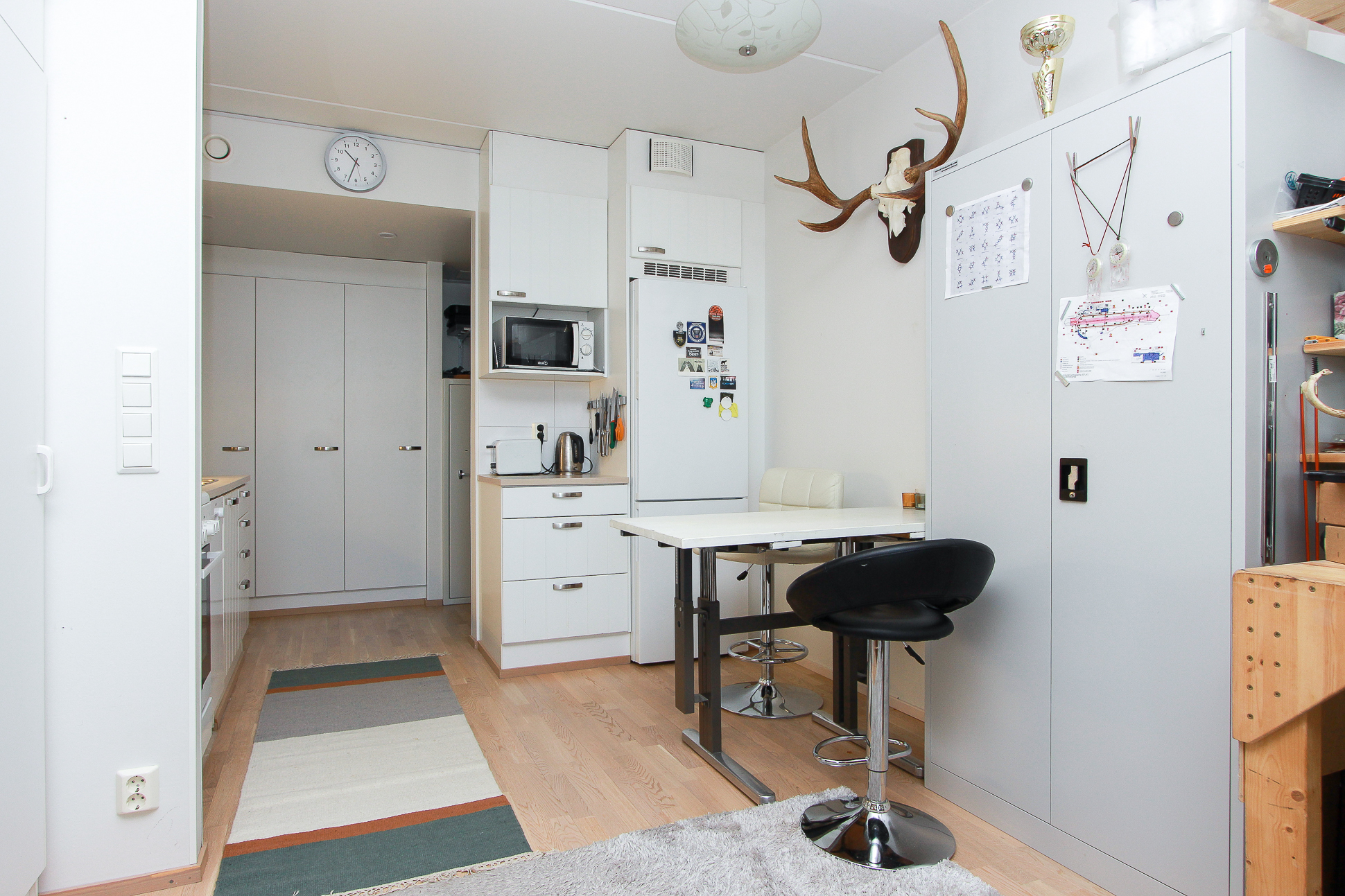 Keittiö on toimiva ja kaappitilaa löytyy mukavasti. Kylpyhuoneessa taso ja säilytystilaa sekä tilavaraus pesutornille. Lisäarvoa tuo lasitettu parveke.