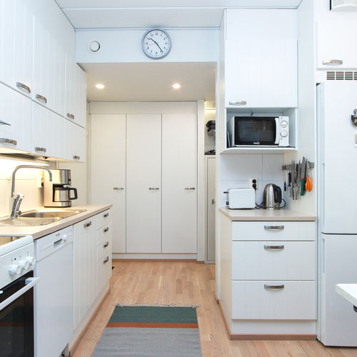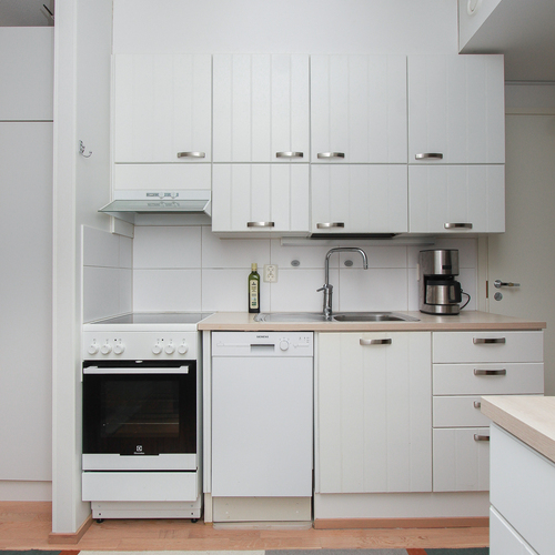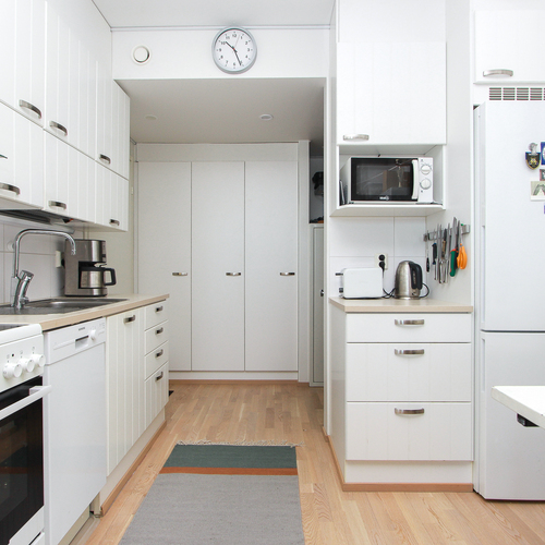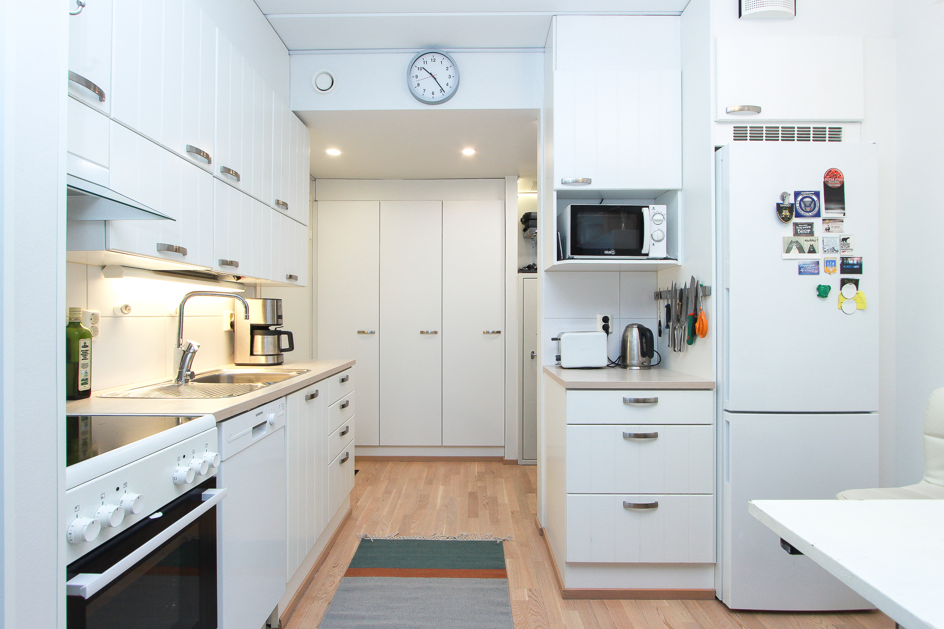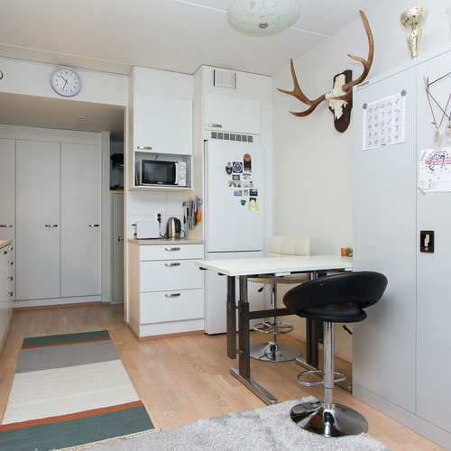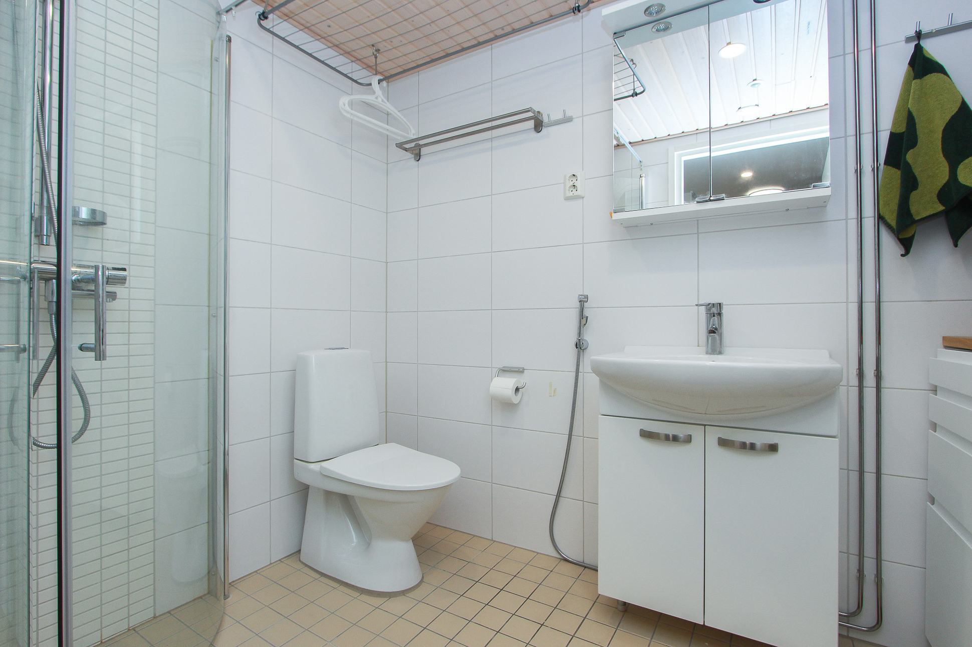 Keittiö on toimiva ja kaappitilaa löytyy mukavasti. Kylpyhuoneessa taso ja säilytystilaa sekä tilavaraus pesutornille. Lisäarvoa tuo lasitettu parveke.