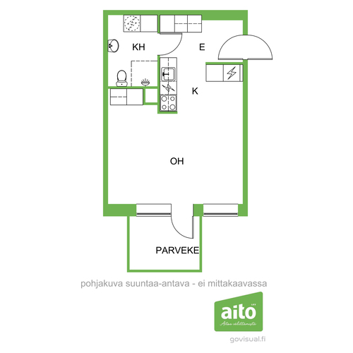 Selkeä ja käytännöllinen pohjaratkaisu. Oleskelutilaan mahtuu hyvin sekä sänky että ruokailu- ja työskentelytila.