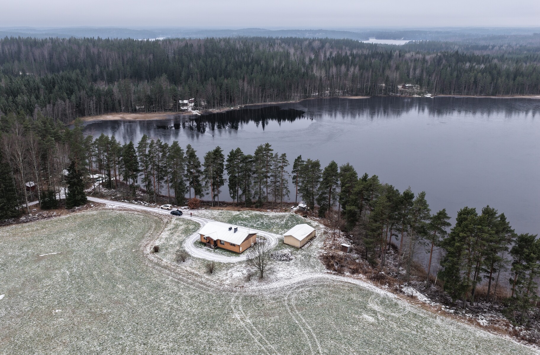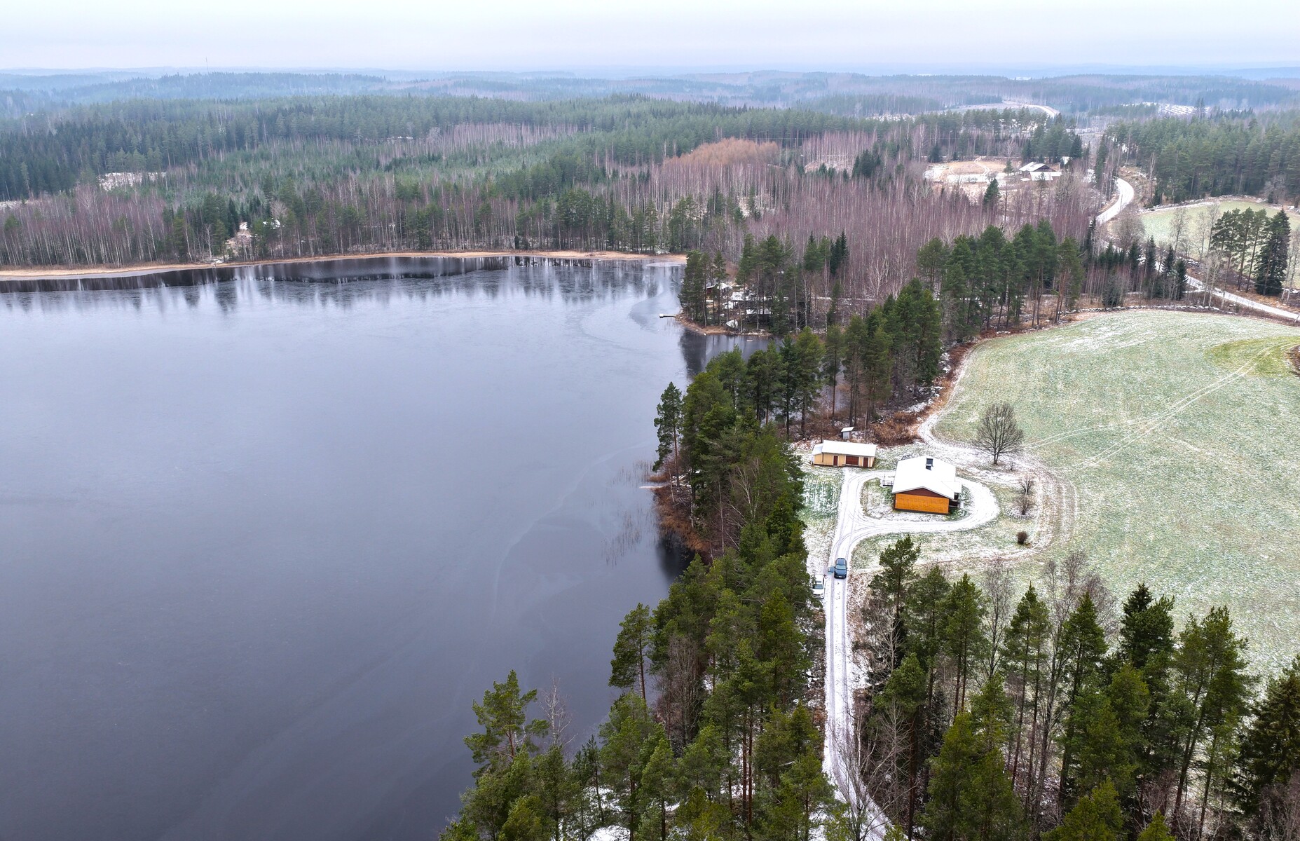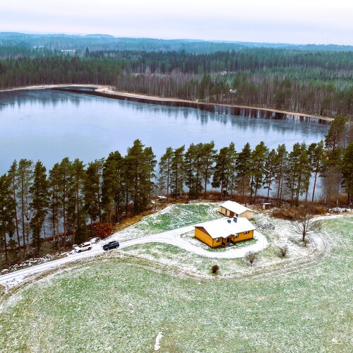 Kuvat kertovat kaiken: ympärillä avautuu kaunis mäntyinen rantametsä, peltoaukeat ja rauhallinen lampimaisema. Sijainti niemen kärjessä takaa yksityisyyden ja huikeat maisemat.