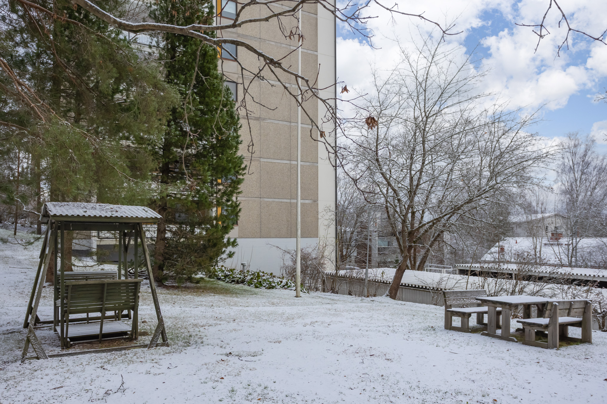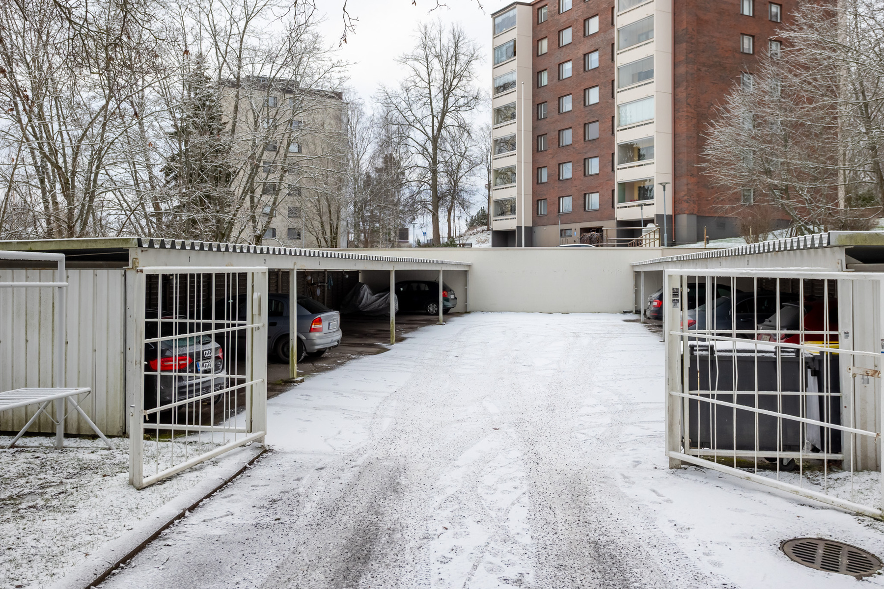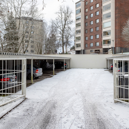 Jokaiselle asunnolle kuuluu yksi autokatospaikka. Pysäköintialueen portti suljetaan yön ajaksi.