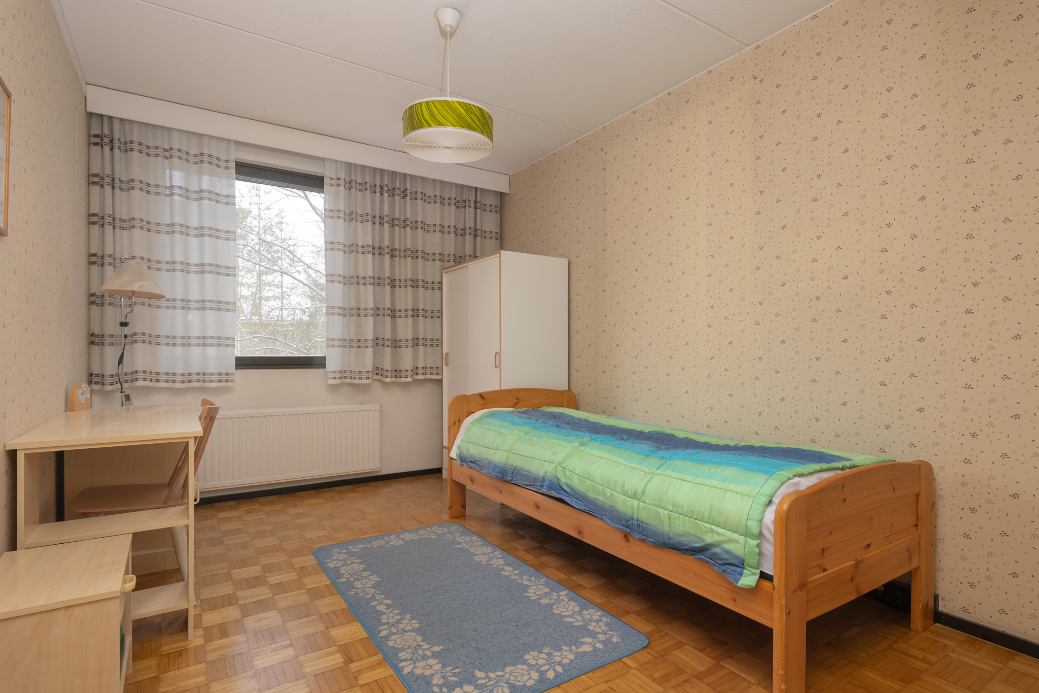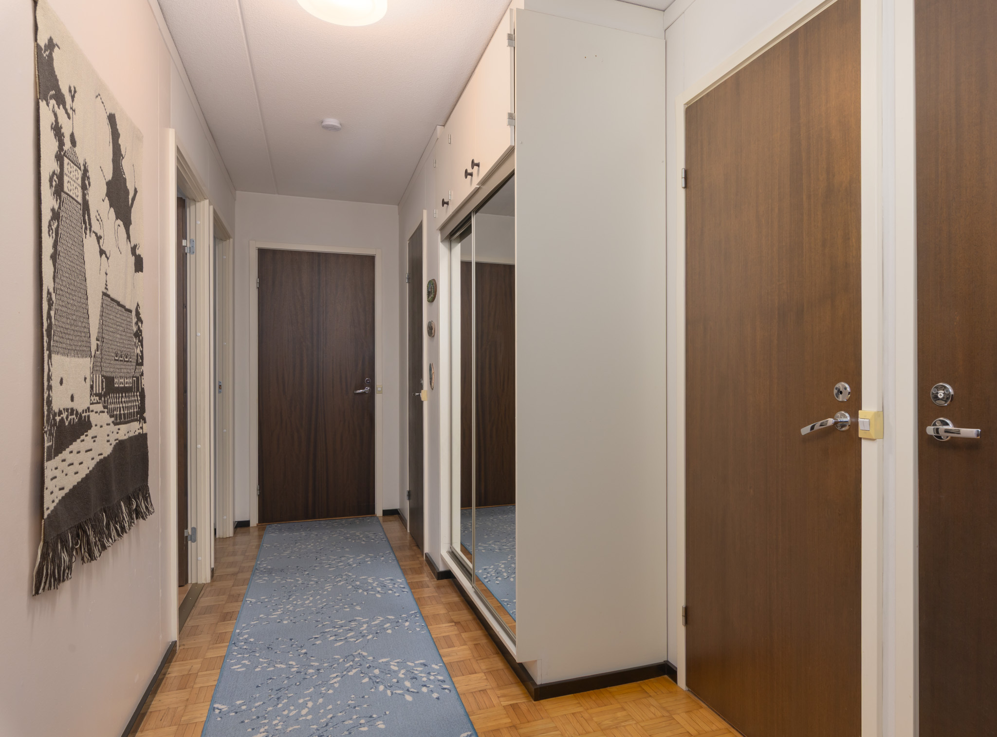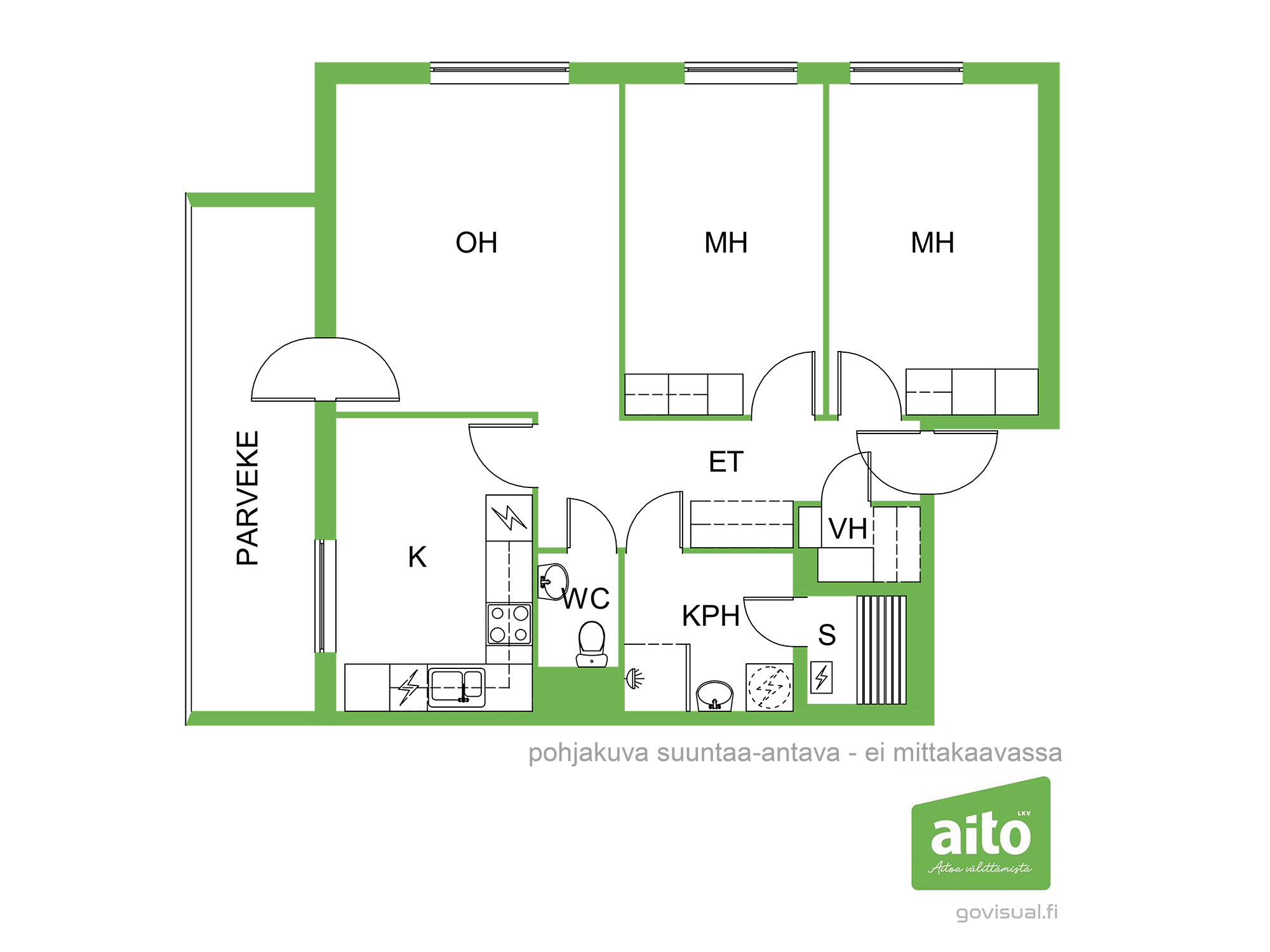 Kolme huonetta, keittiö ja sauna muodostavat toimivan kokonaisuuden: kaksi reilunkokoista makuuhuonetta ja olohuone, josta on kulku tilavalle lasitetulle parvekkeelle. Parvekkeelta avautuvat puistomaiset ja viihtyisät näkymät kaupungille ja asuinalueelle. Oma sauna on aina käytettävissä rentouttamaan arkea ja erillinen wc tekee arjesta sujuvampaa.