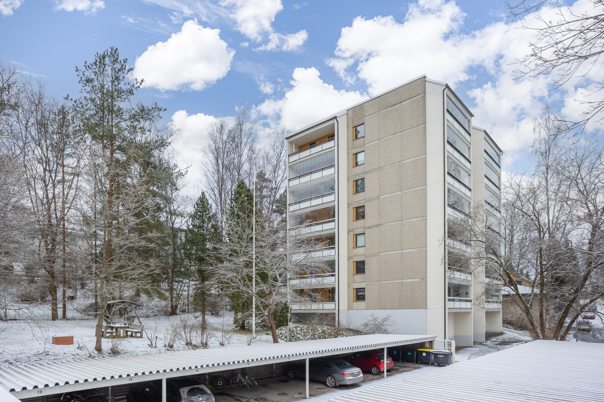 Jokaiselle asunnolle kuuluu oma autokatospaikka.