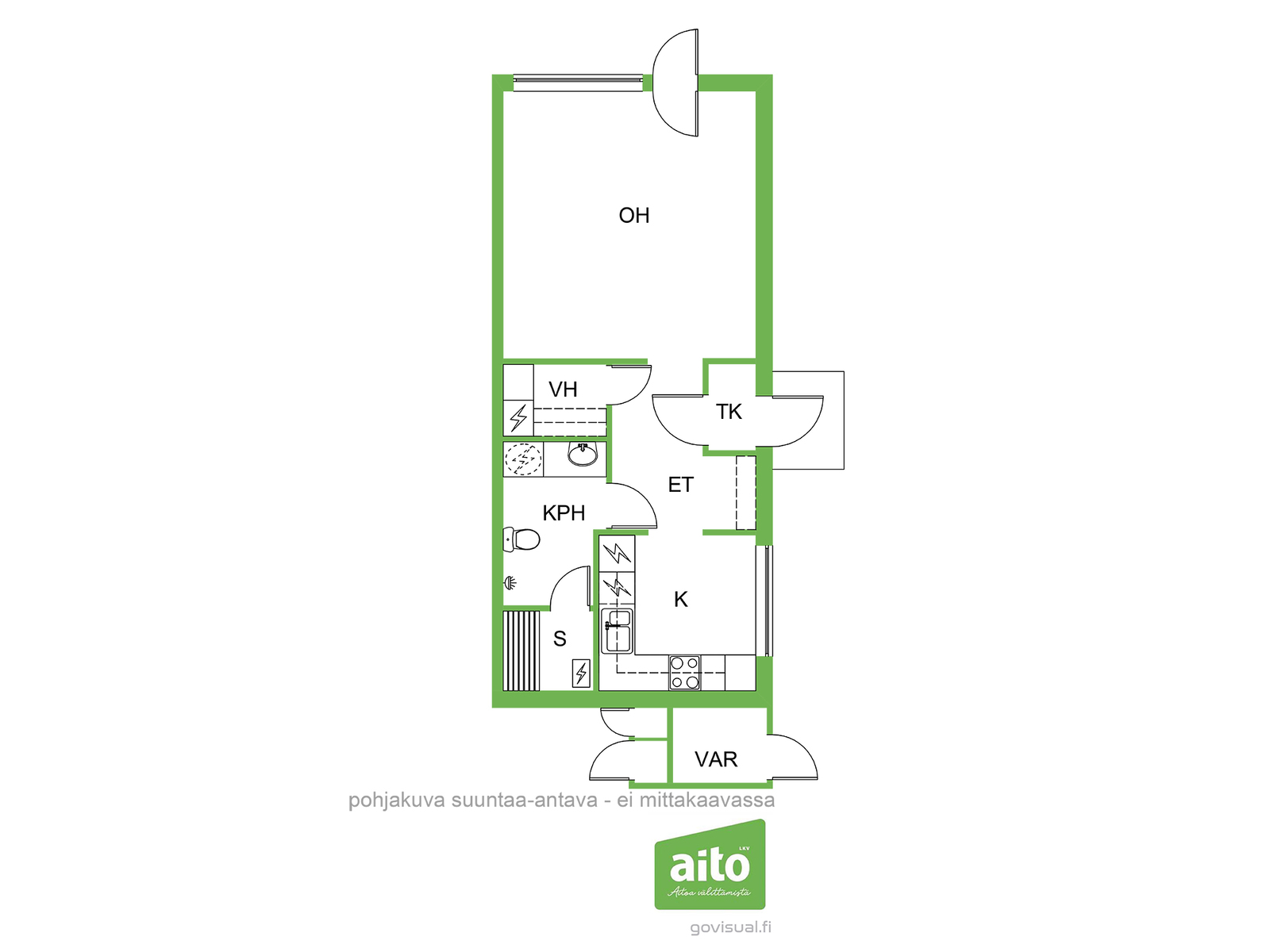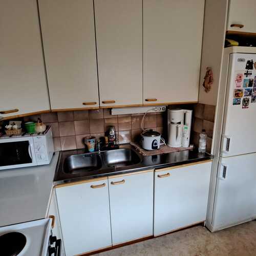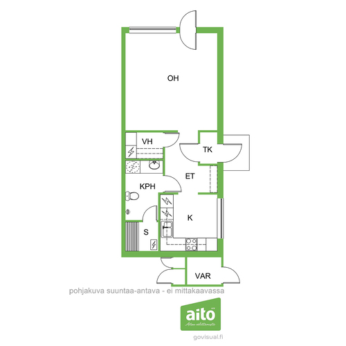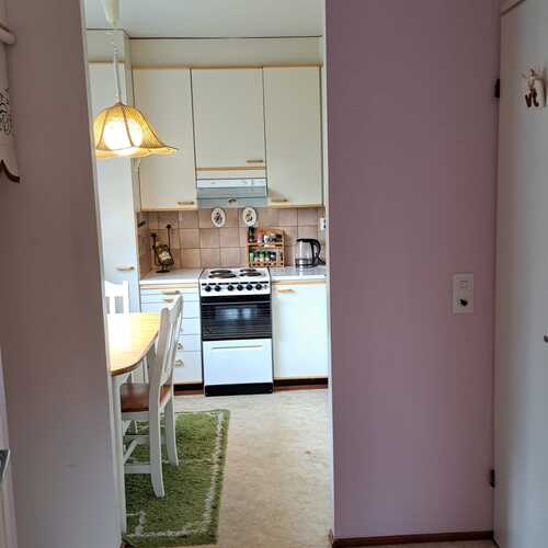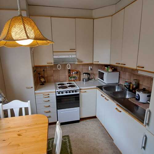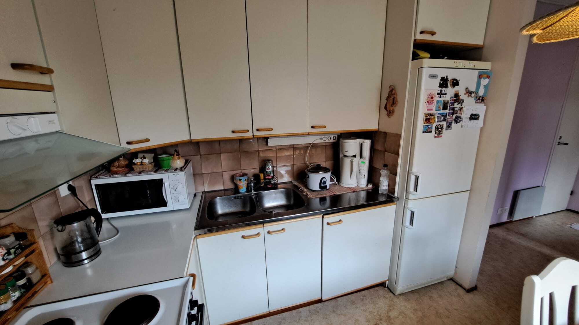 Varustukseen kuuluu: jääkaappipakastin, sähköliesi, liesituuletin, keittiökaapistot ja -tasot.