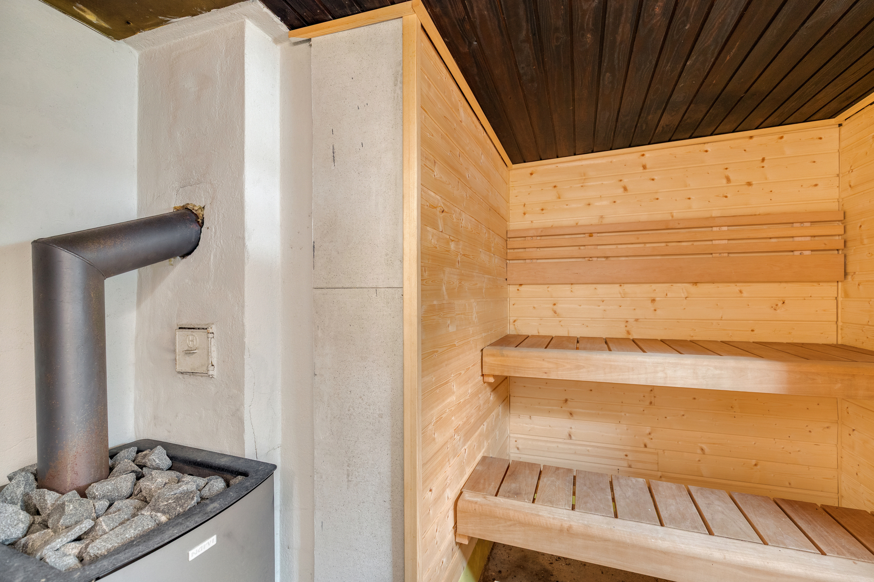 Sauna on vanhan navettarakennuksen yhteydessä, saunan lauteet
