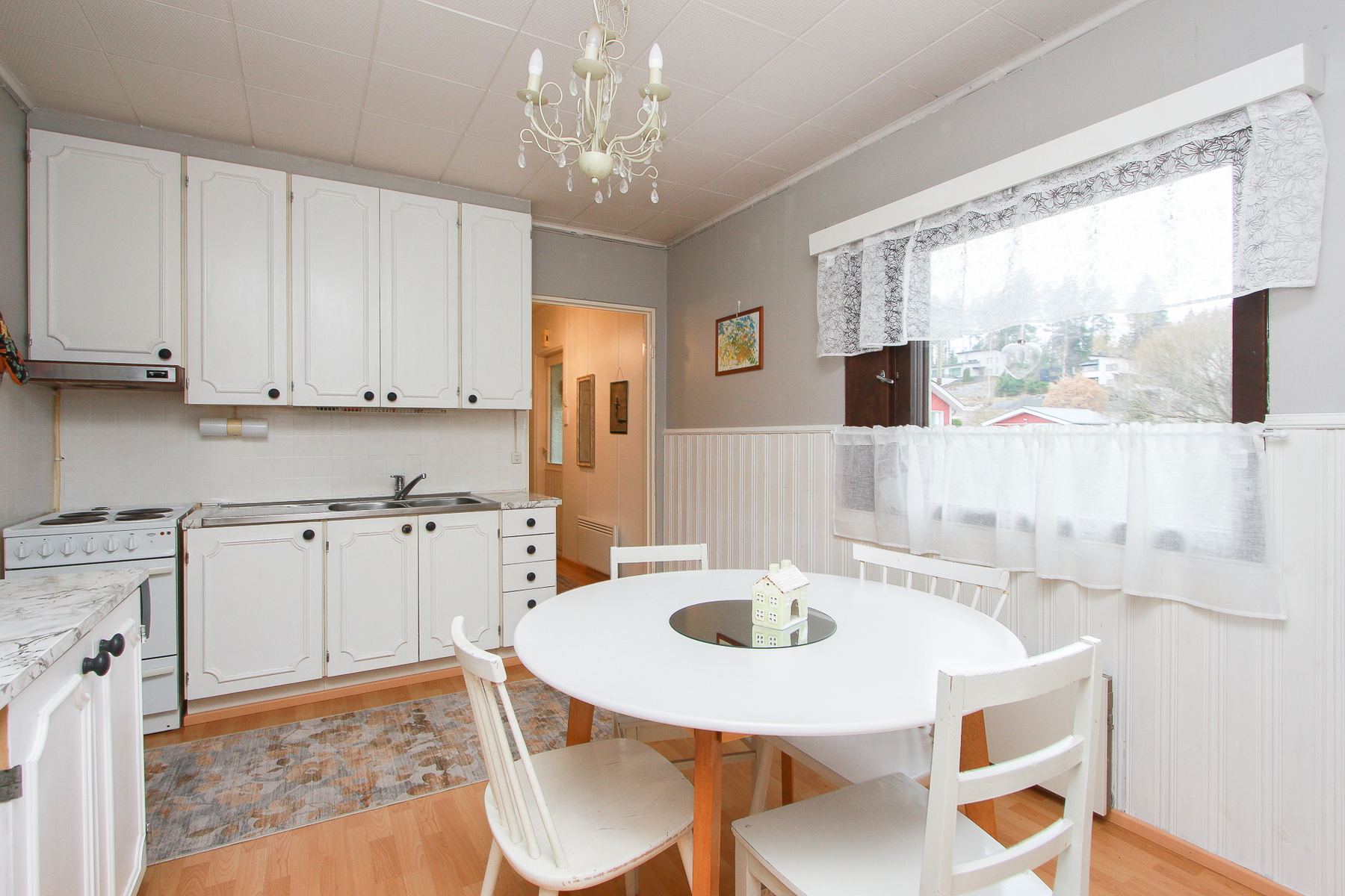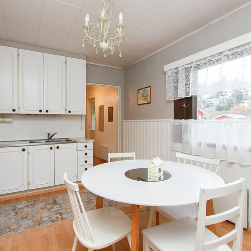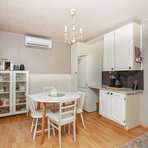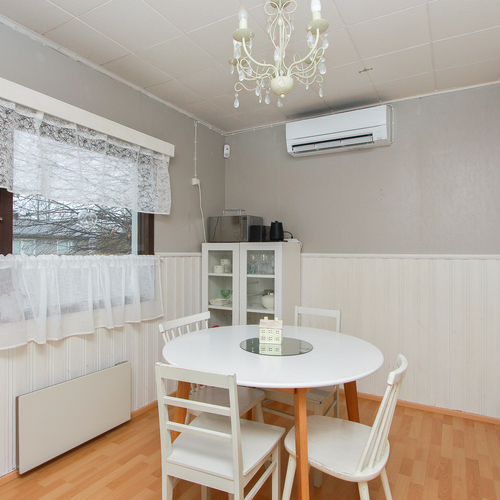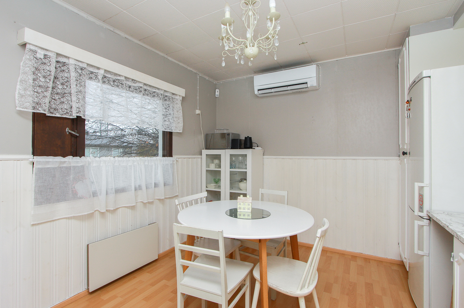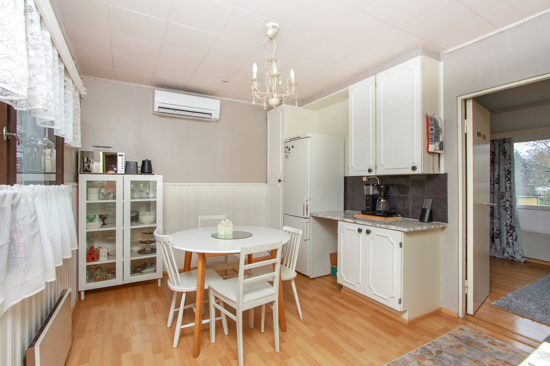 Kaapistot, laminaattitasot. Jääkaappi/pakastin, sähköliesi, liesituuletin. Lattia laminaattia. Seinät puolipaneeli/maalattu. Ilmalämpöpumppu.