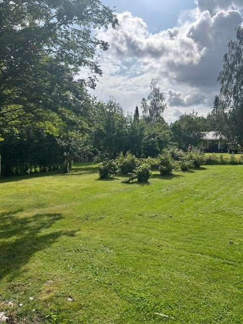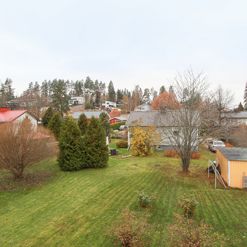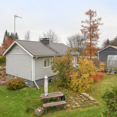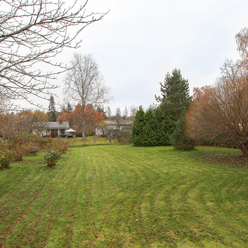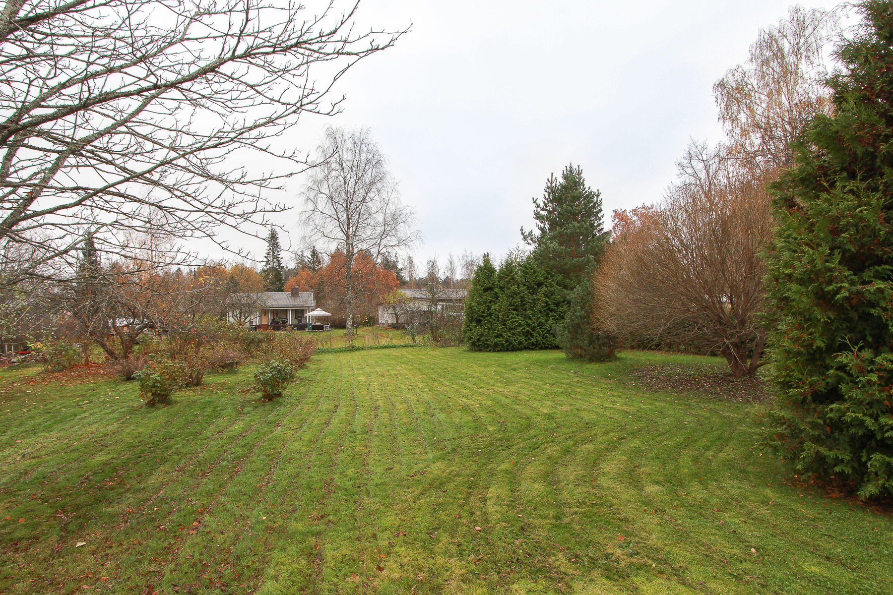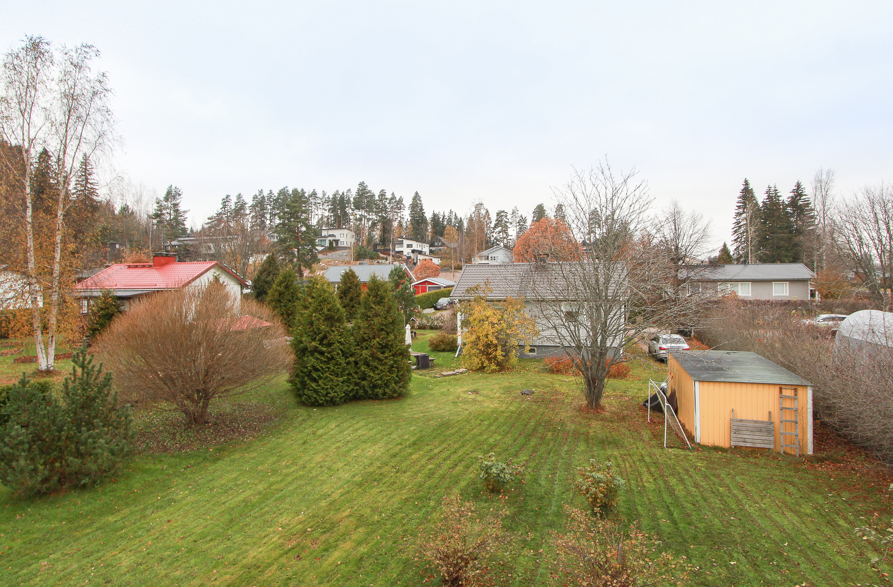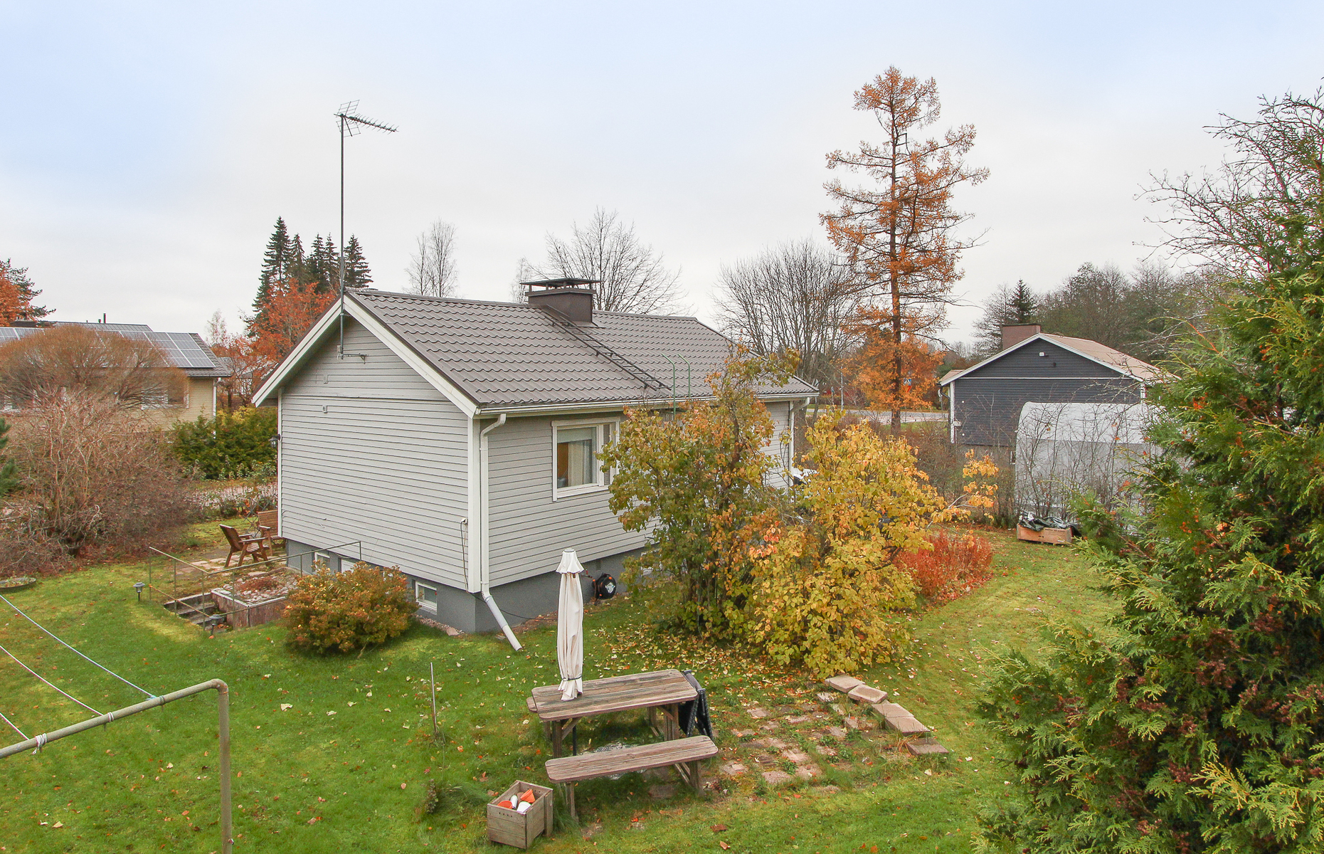 Talon ympärillä avautuu iso, suojaisa 1239 m²:n oma puutarhatontti, jossa tilaa oleskeluun ja pihan puhdetöille. Pihapiirissä on vehreää nurmialuetta, istutuksia sekä marjapensaita.