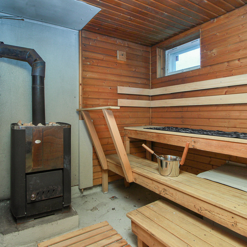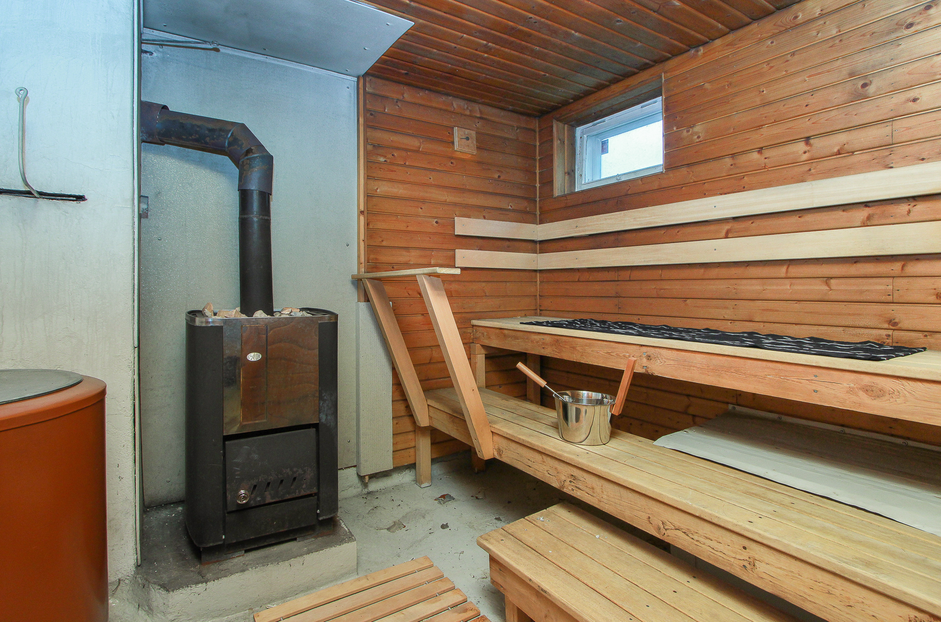 Ikkunallinen sauna. Vesipata, puukiuas. Betonilattia. Myyjä suosittelee saunatilojen päivitystä.