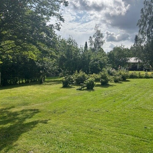 Tasainen puutarhatontti. Marjapensaita, istutuksia, nurmea, vadelmapensaita, pihapuita, omenapuu.