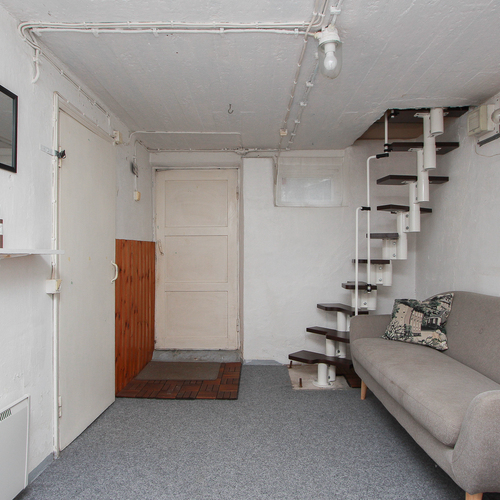 Erillen wc asuinkerroksessa. Wc-istuin, peili, bideesuihku, allaskaappi, vesivaraaja 35 l. Lattia muovimattoa.