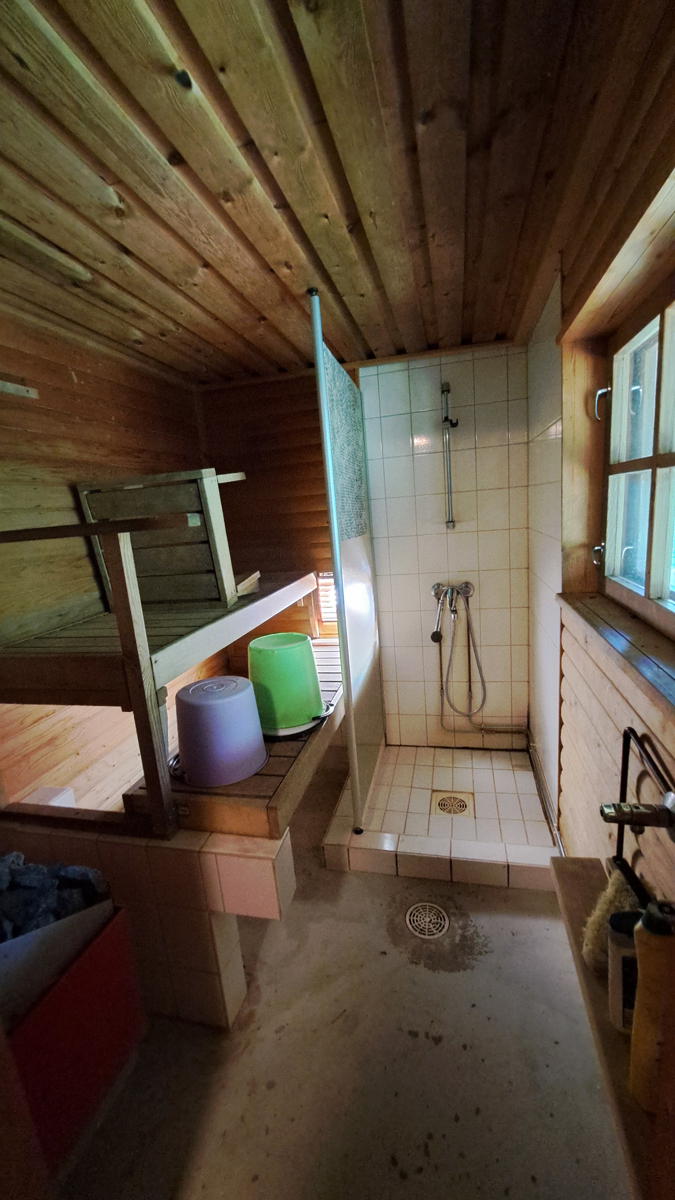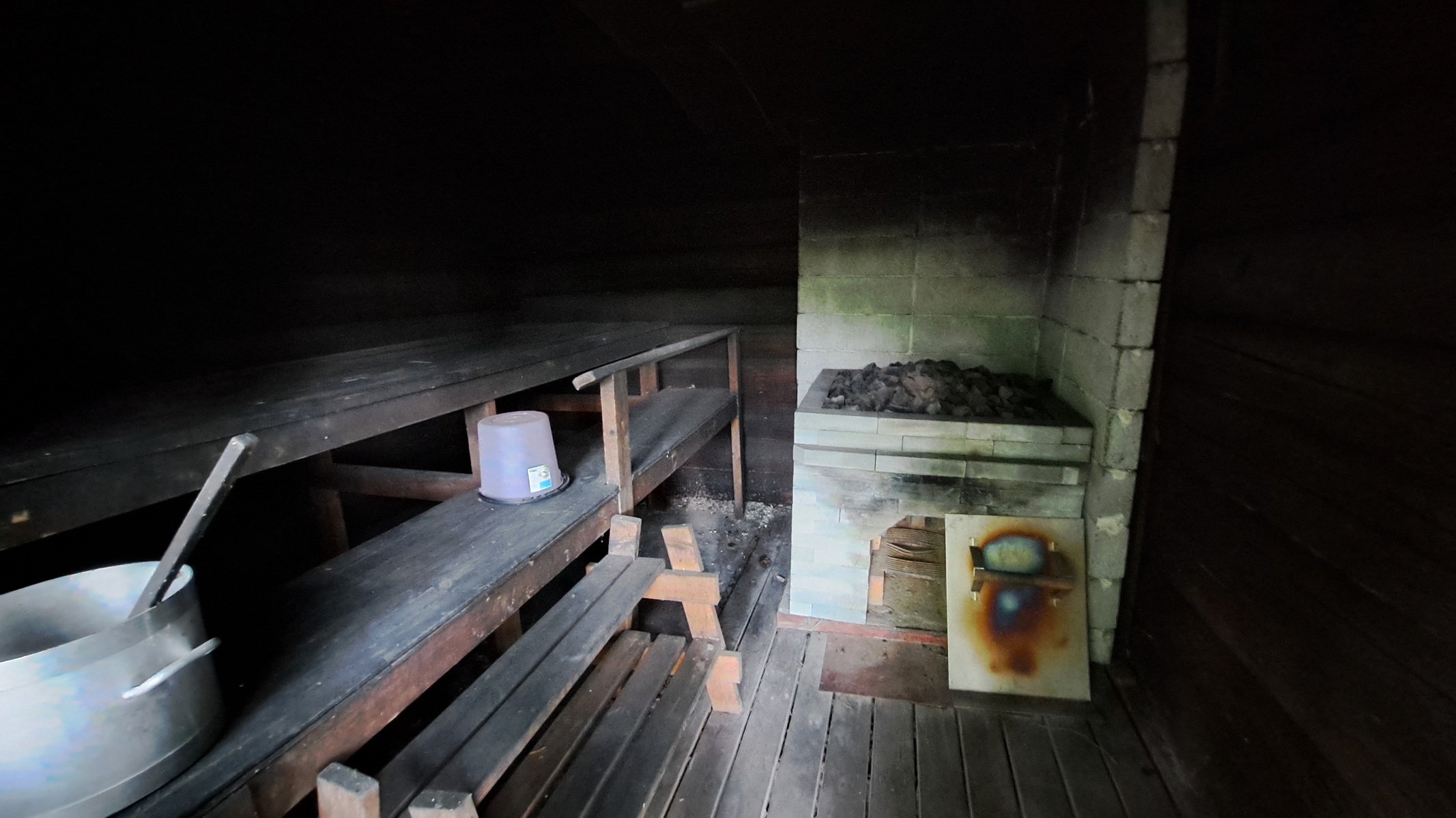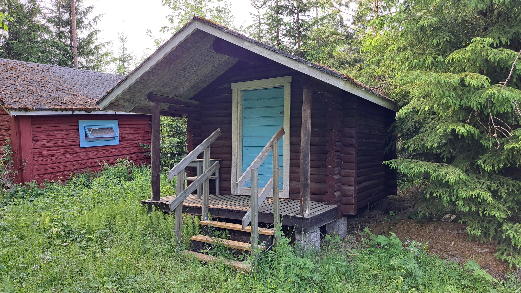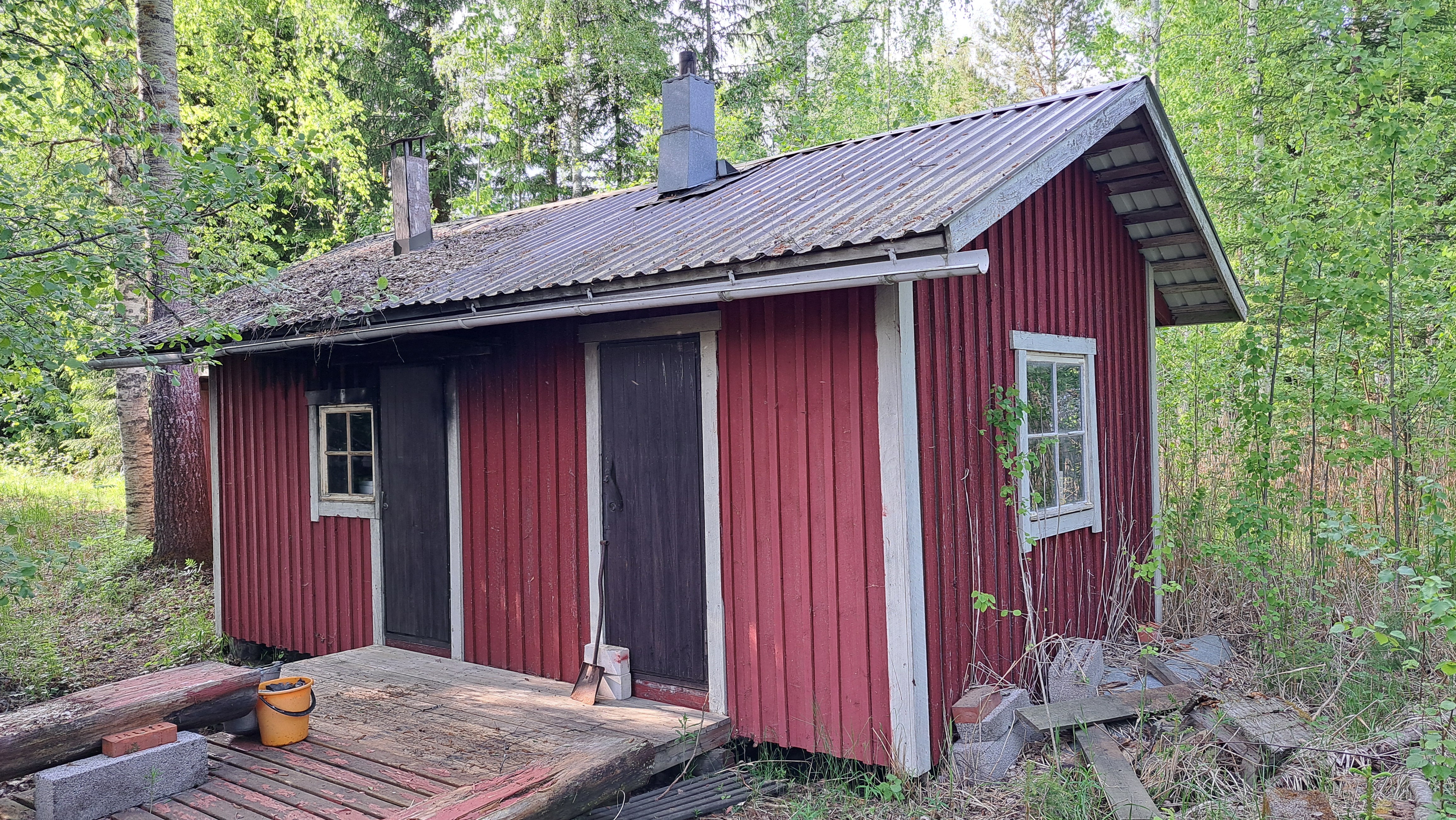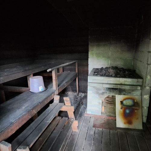 Rannassa kunnostusta kaipaava hirsi-/lautarakenteinen savusauna, jossa savusaunan lisäksi pieni saunatupa. Rakennuksen vieressä polttopuukatos.