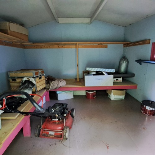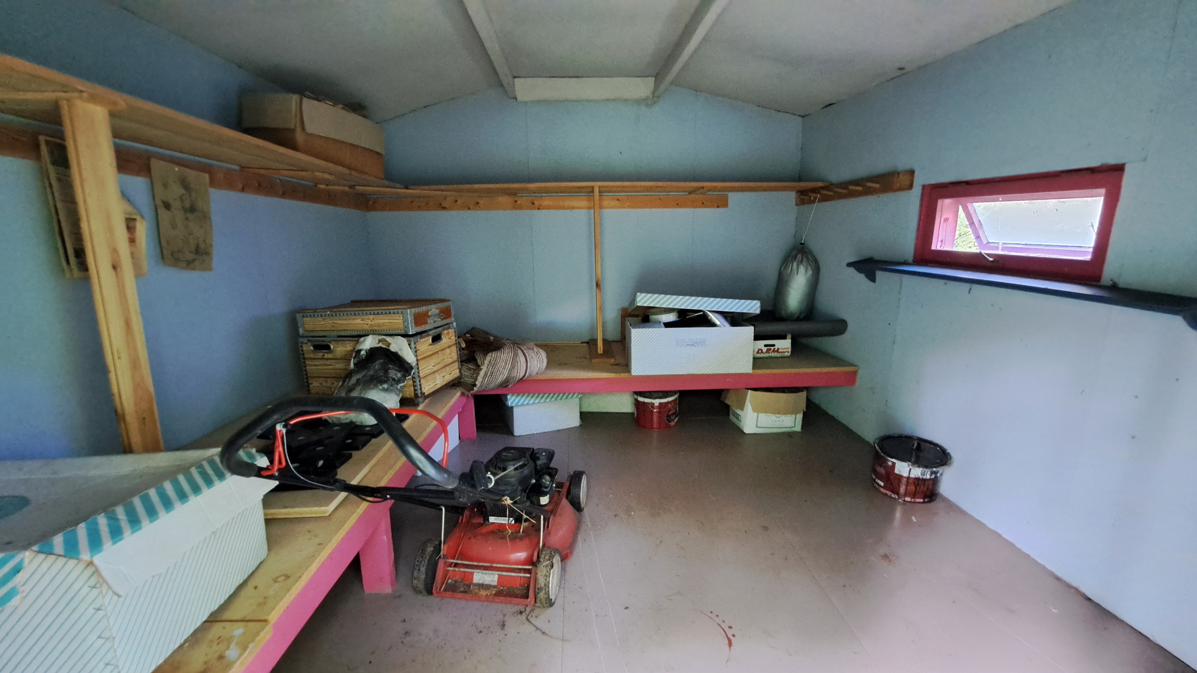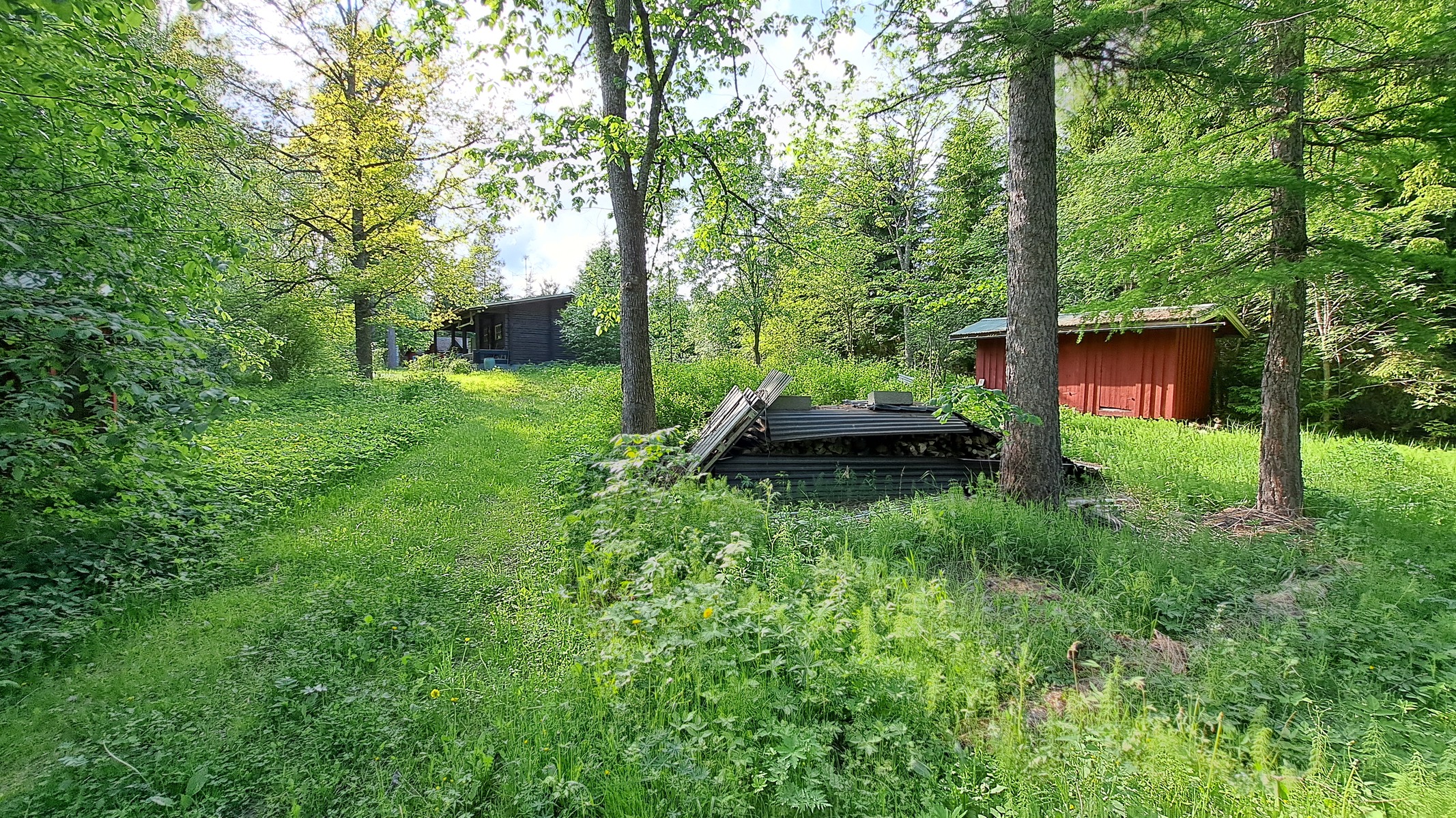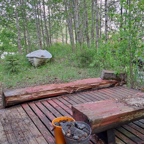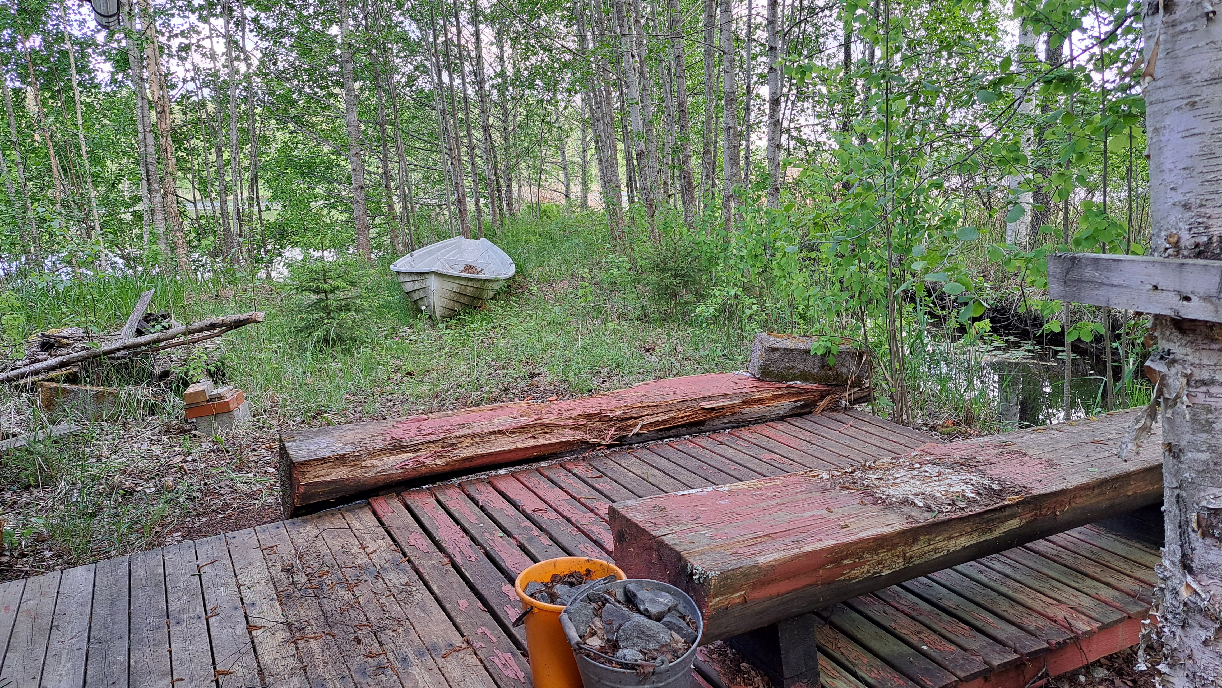 Rannassa kunnostusta kaipaava hirsi-/lautarakenteinen savusauna, jossa savusaunan lisäksi pieni saunatupa. Rakennuksen vieressä polttopuukatos.