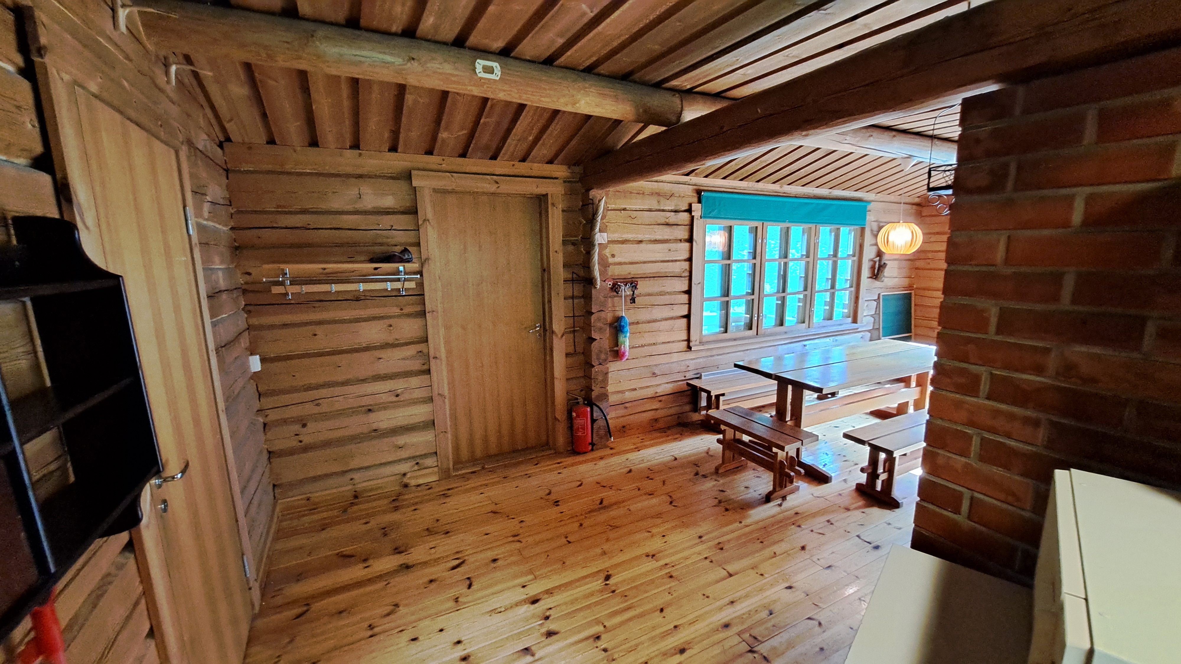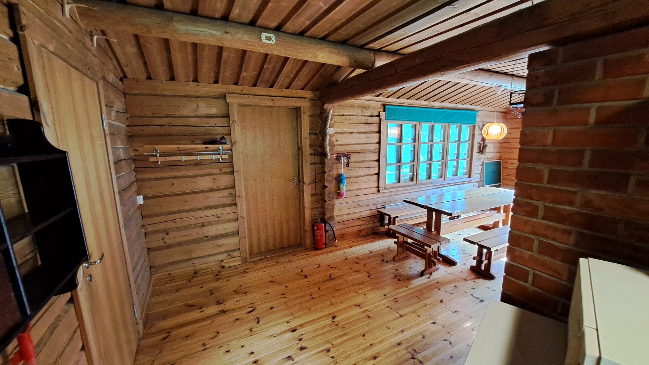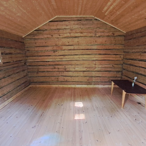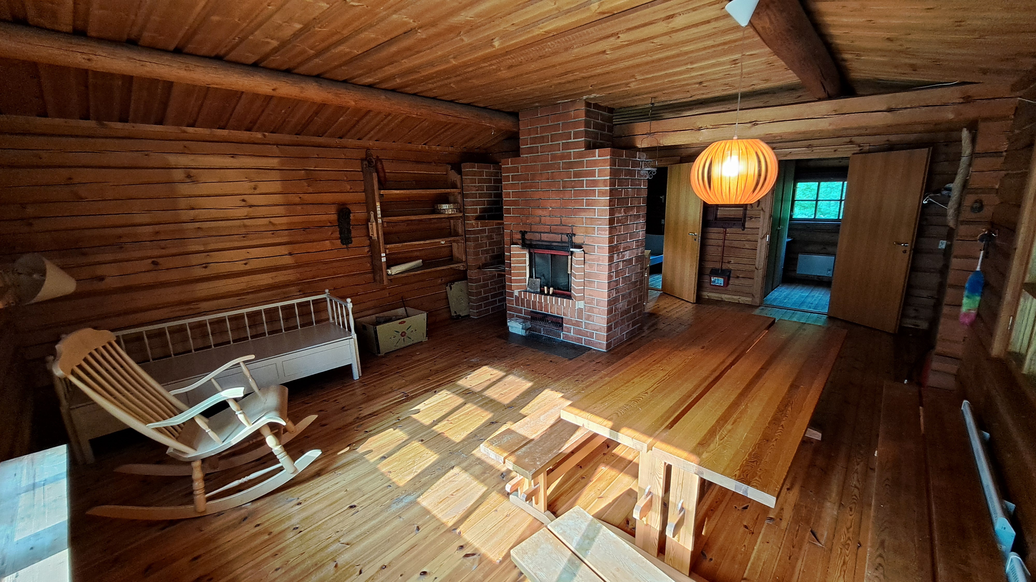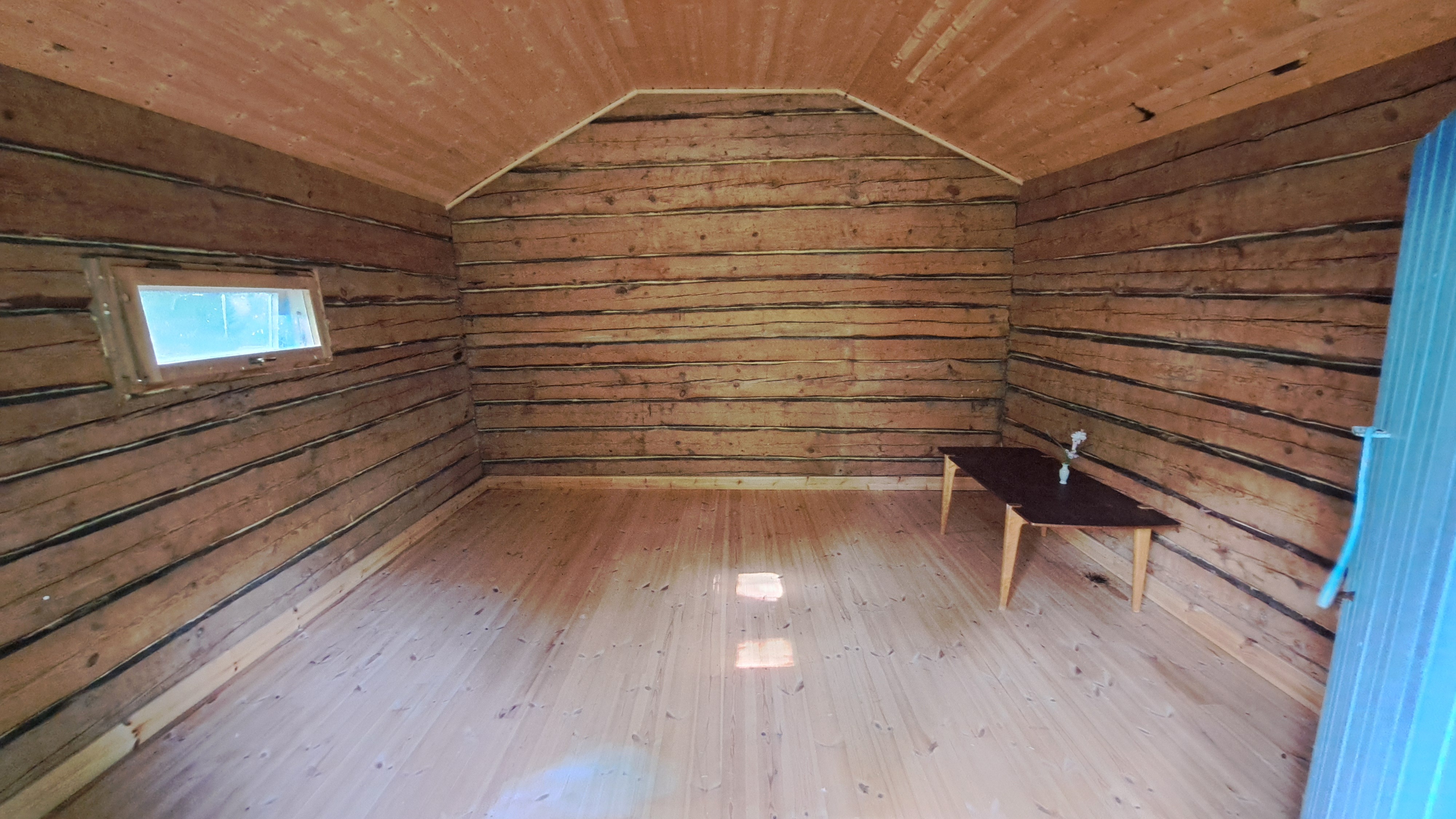 Pintamateriaalit: lattia lakattu puu, seinät hirsi, katto lauta.
