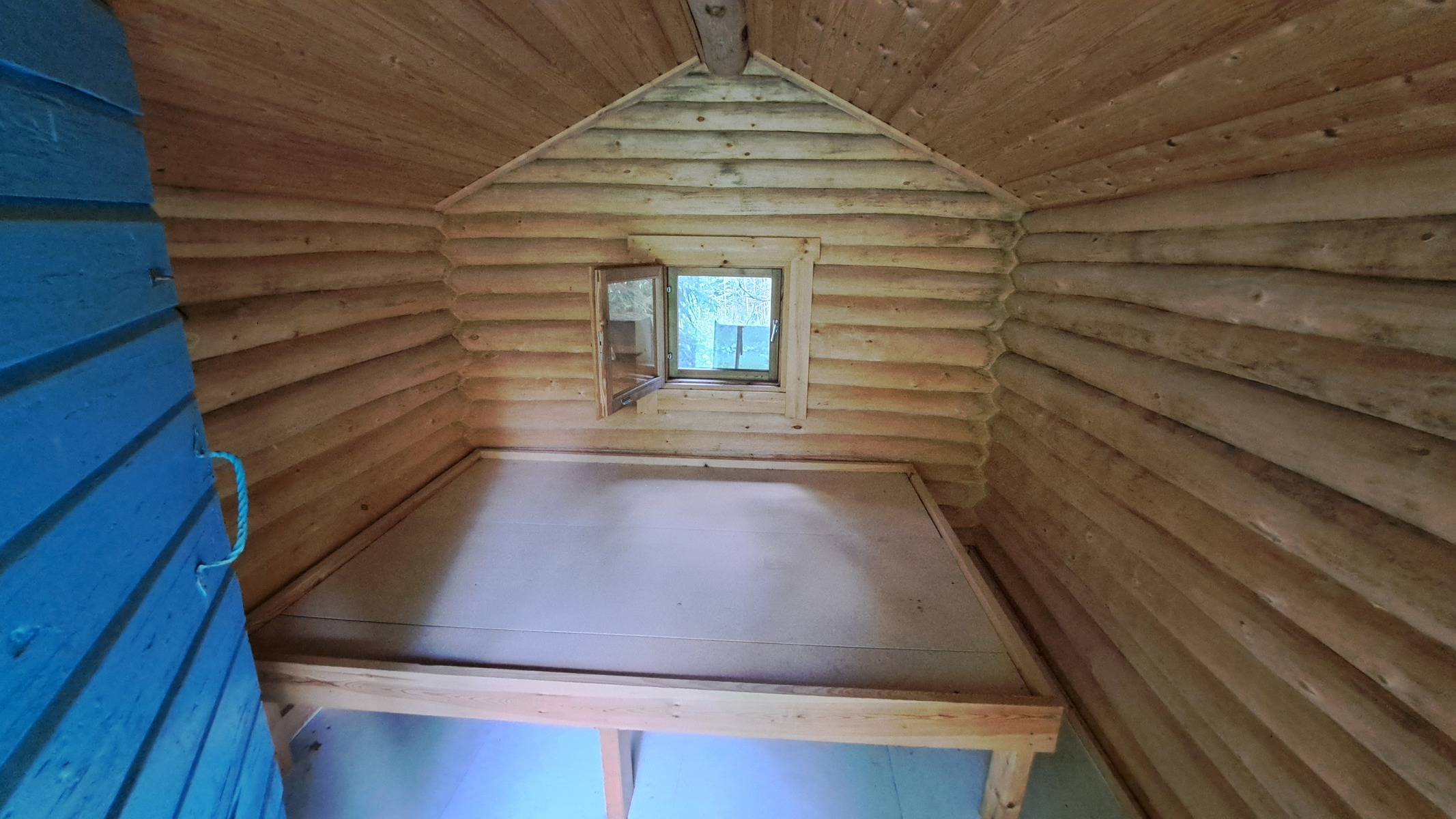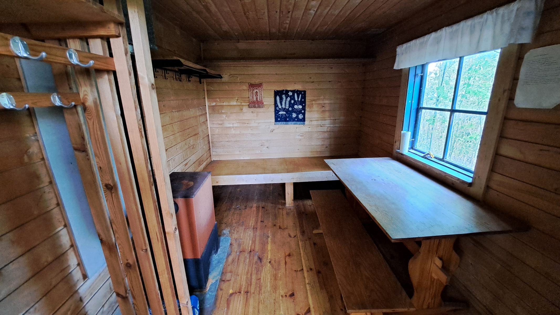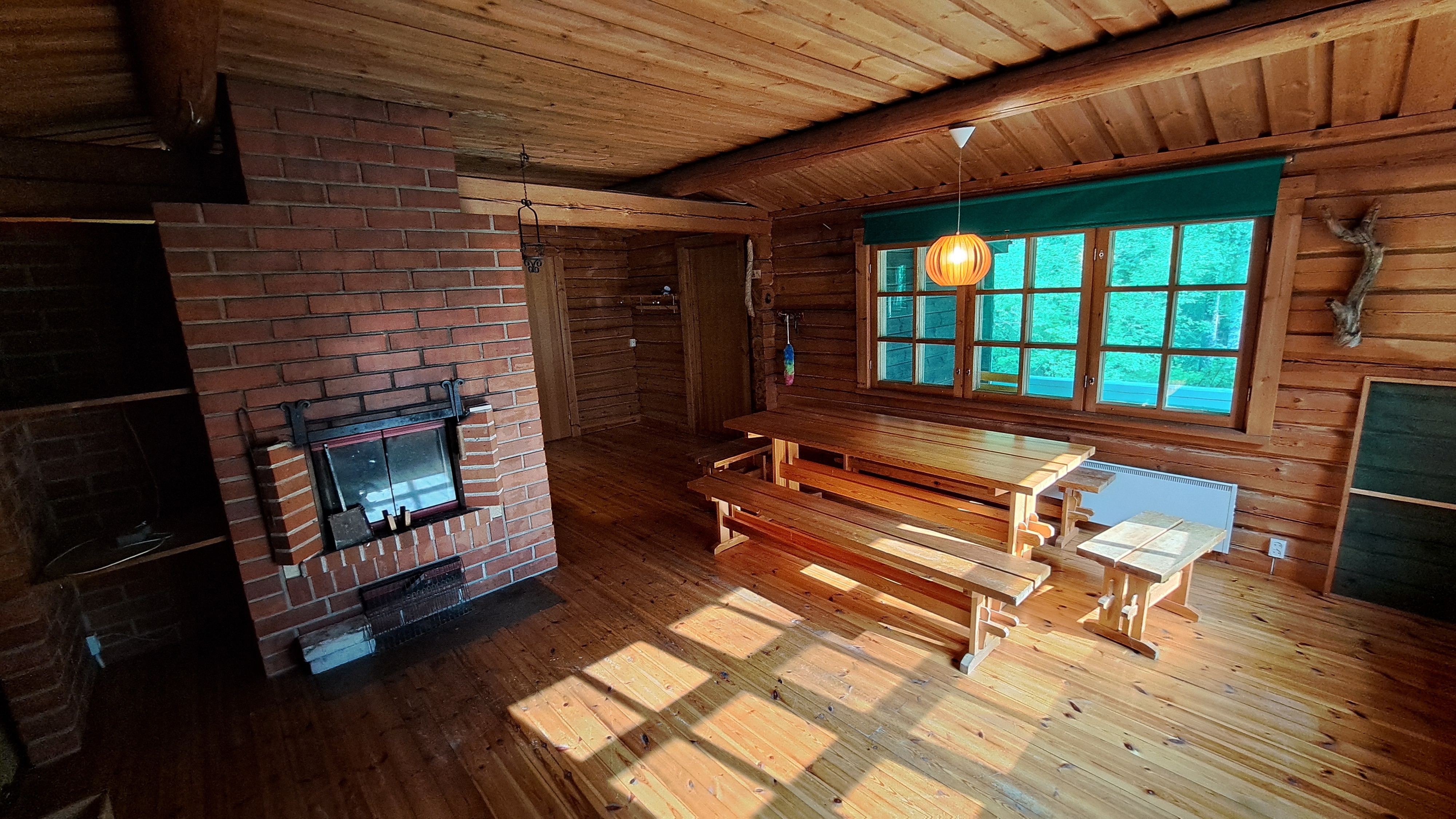 Pintamateriaalit: lattia lakattu puu, seinät hirsi, katto lauta.
