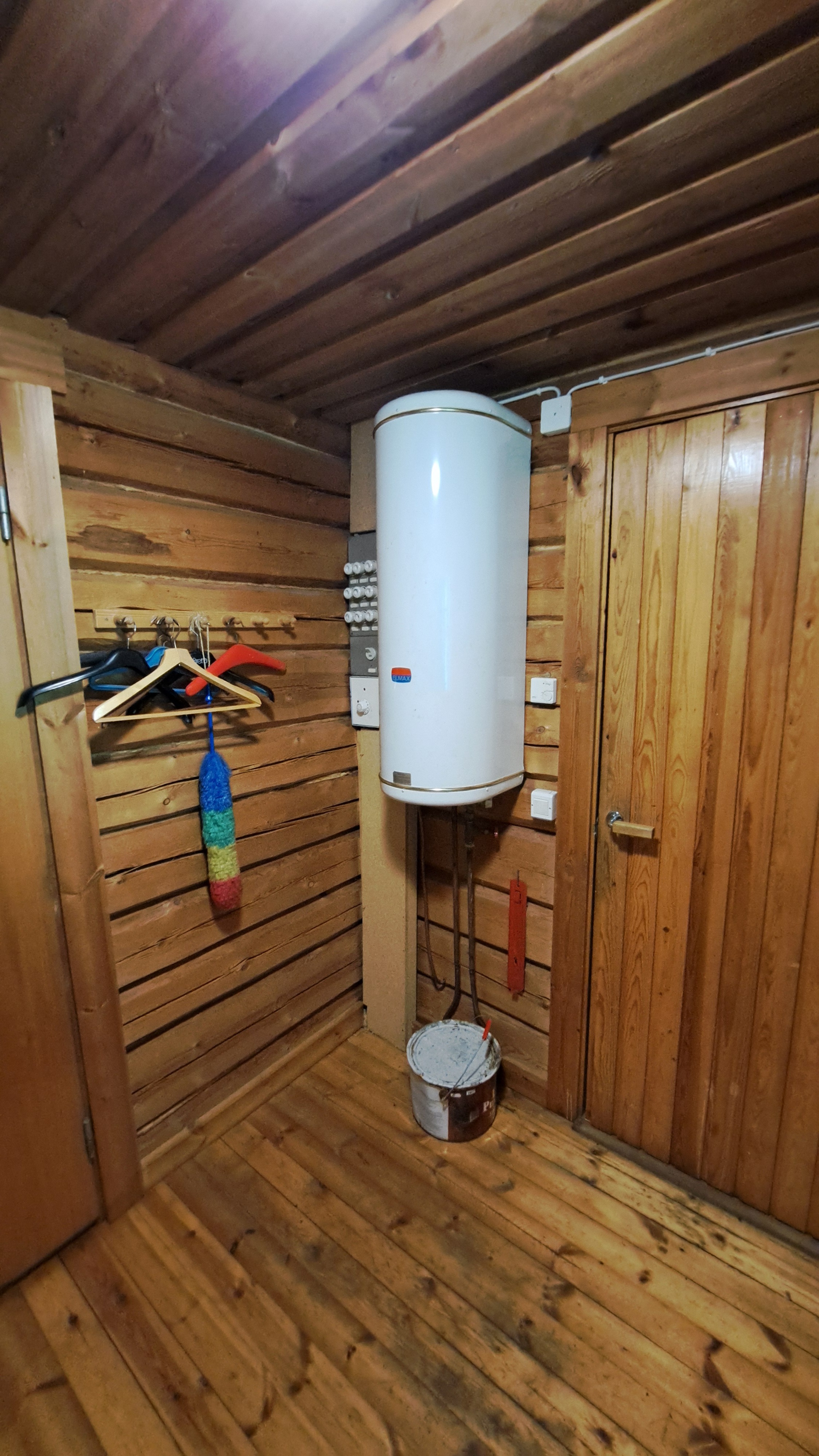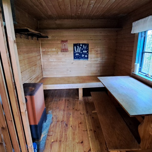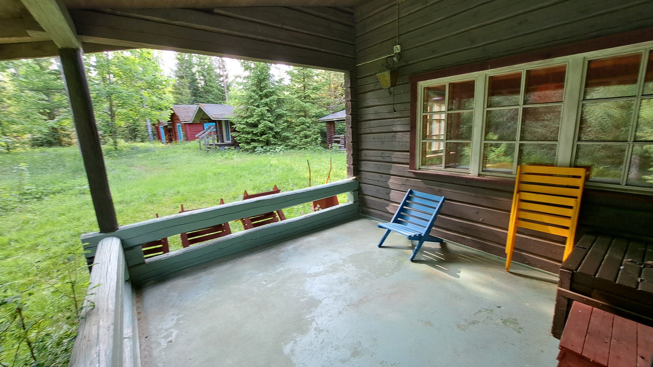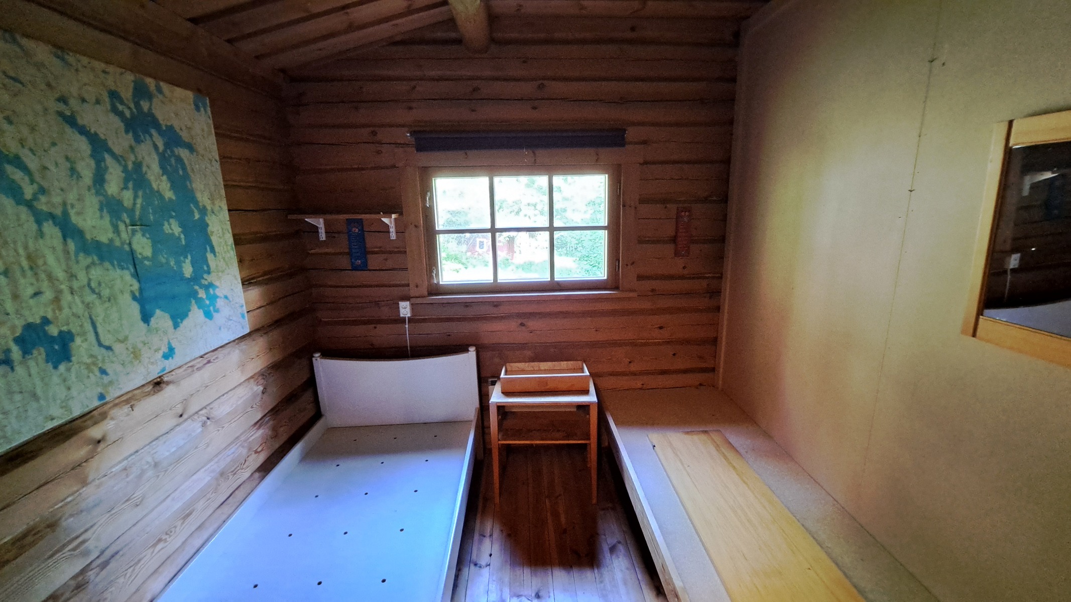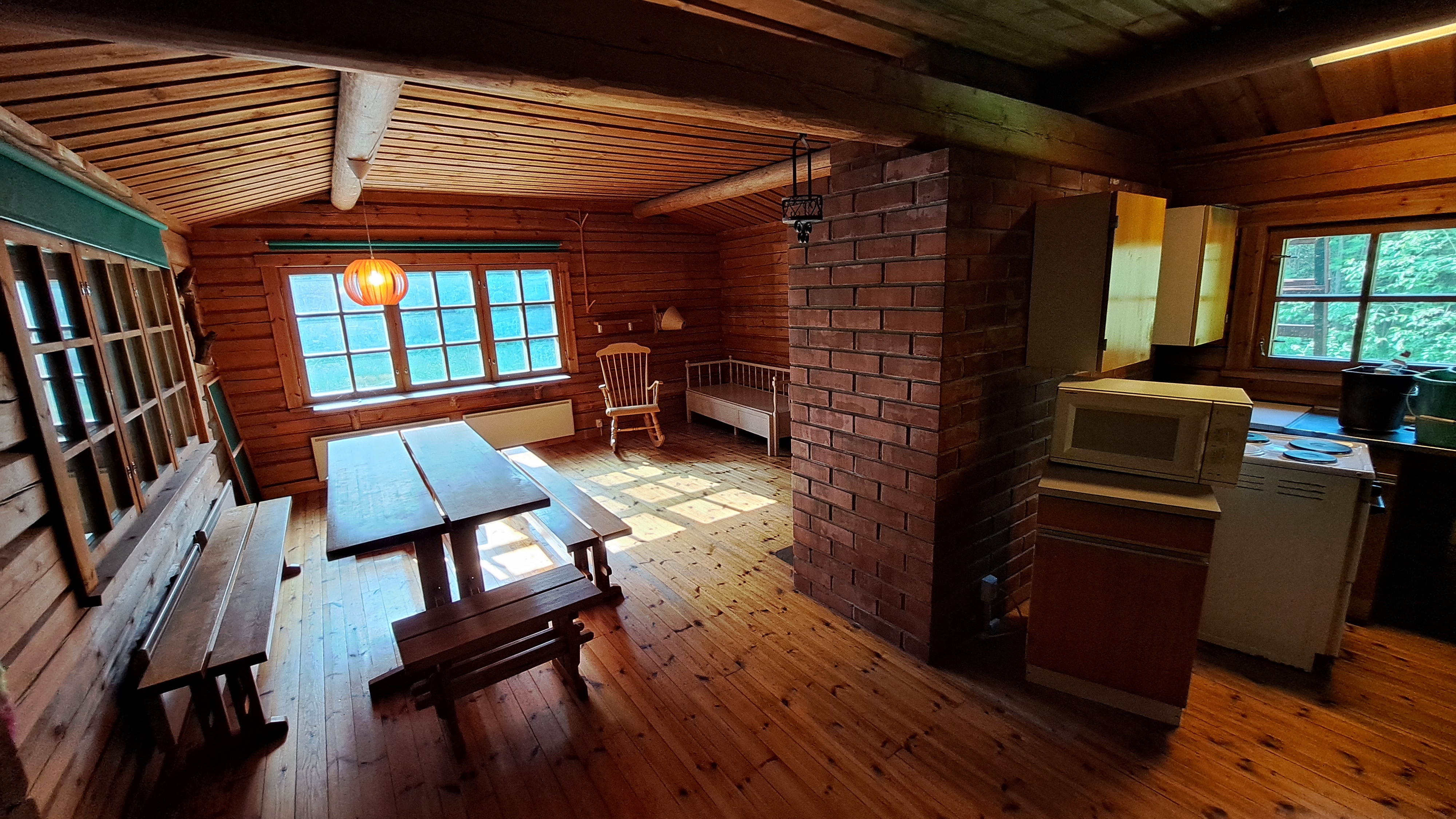 Pintamateriaalit: lattia lakattu puu, seinät hirsi, katto lauta.