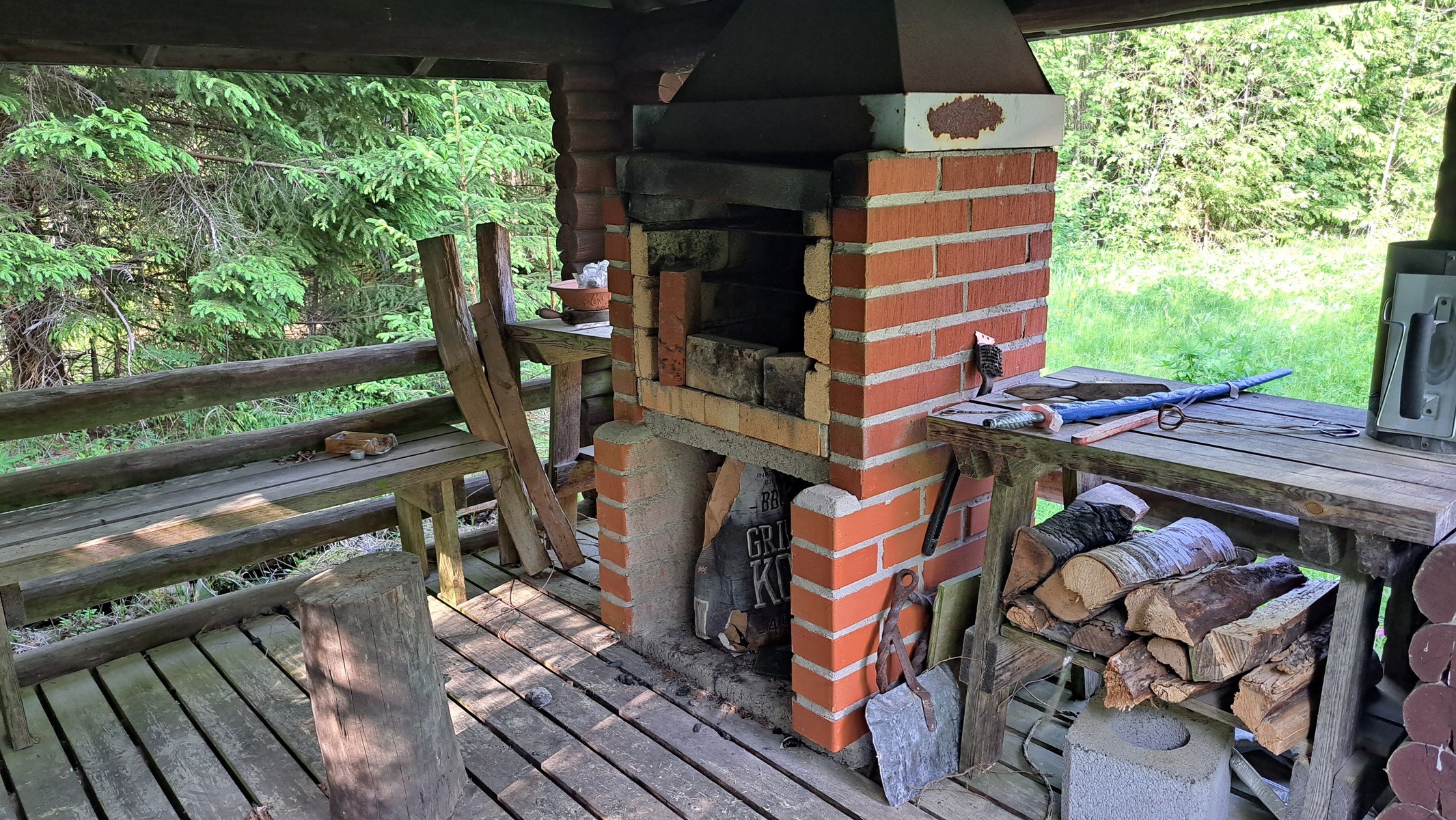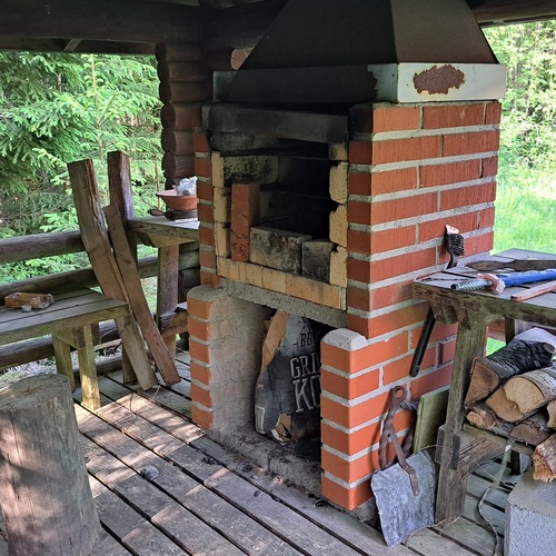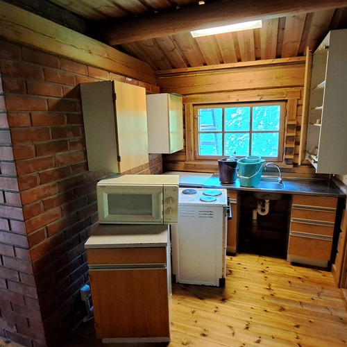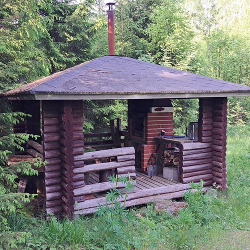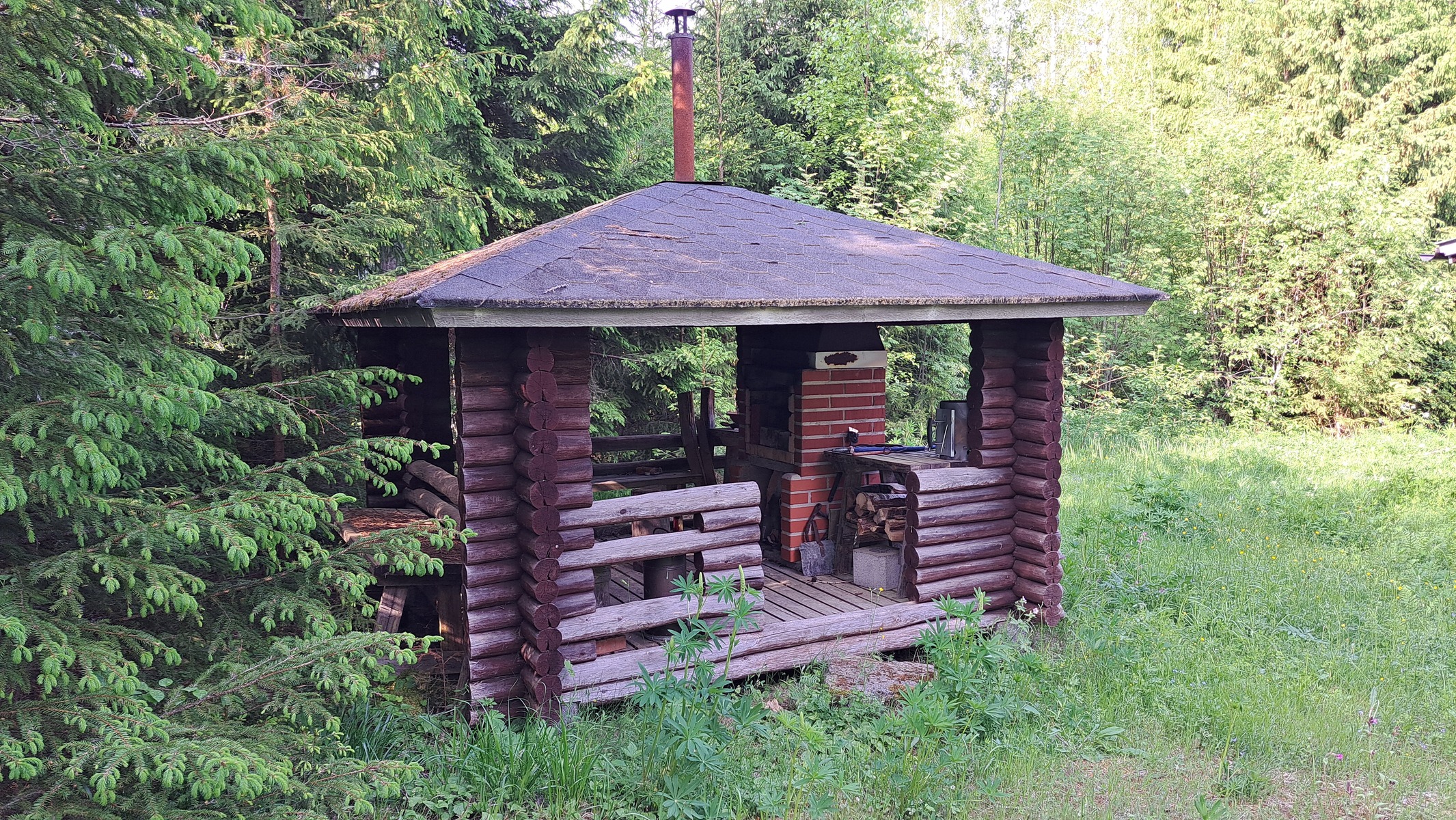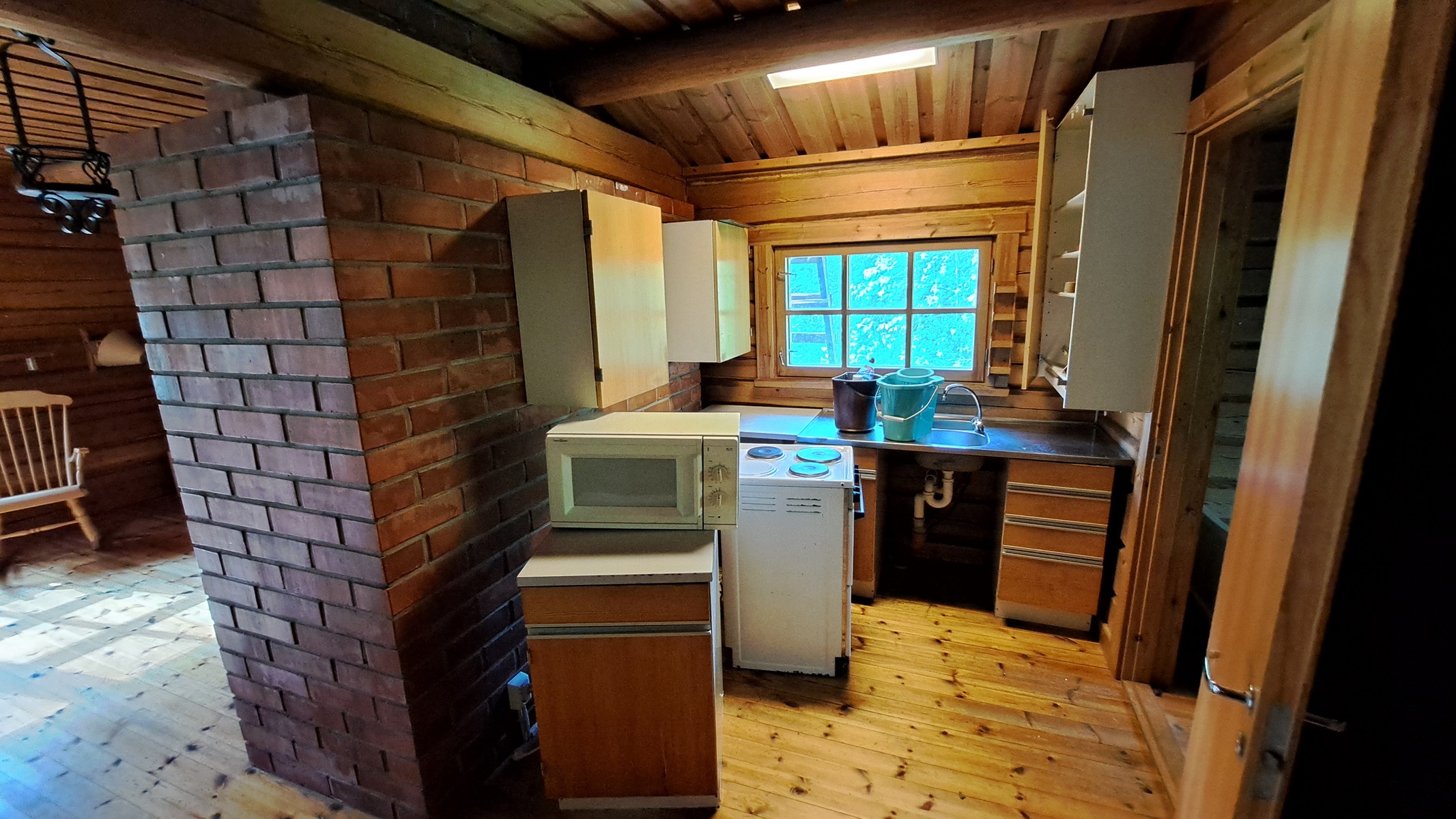 Käsin vuollusta pyöröhirrestä rakennettu pilariperustainen kesäkeittiö, jossa on muurattu tulisija. Aumakatto, katteena palahuopa.