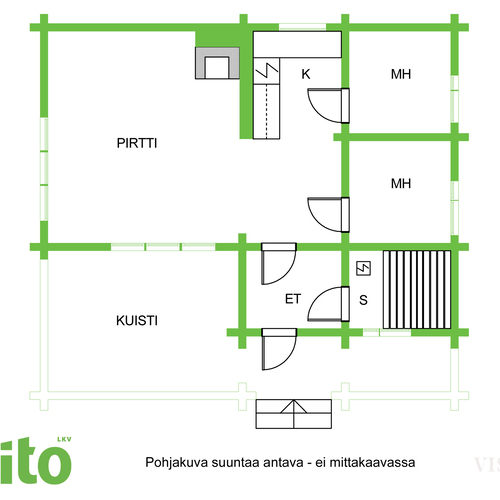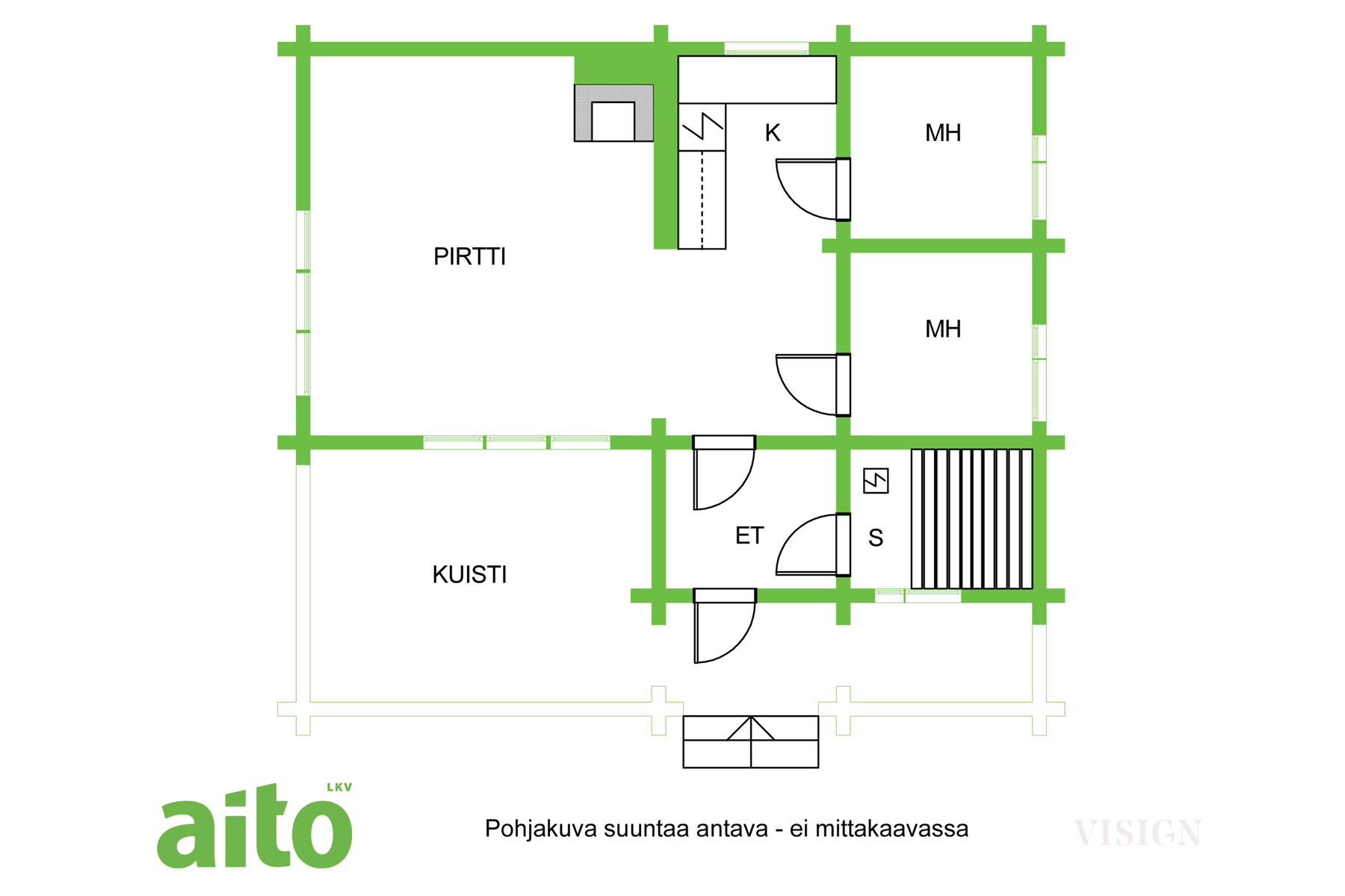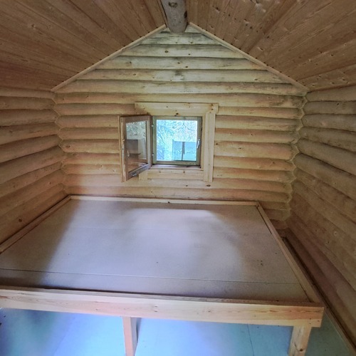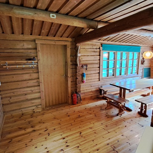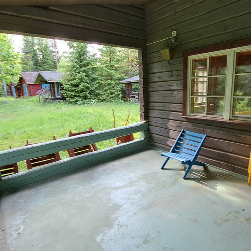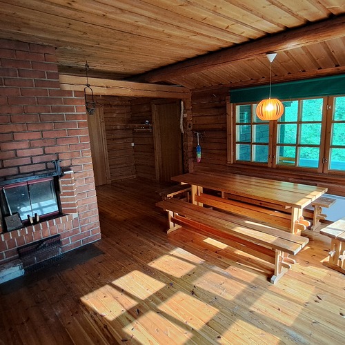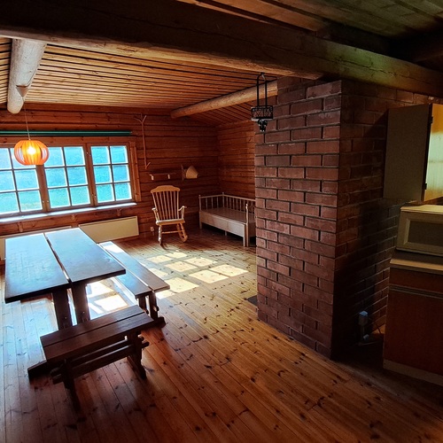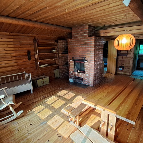 Pintamateriaalit: lattia lakattu puu, seinät hirsi, katto lauta