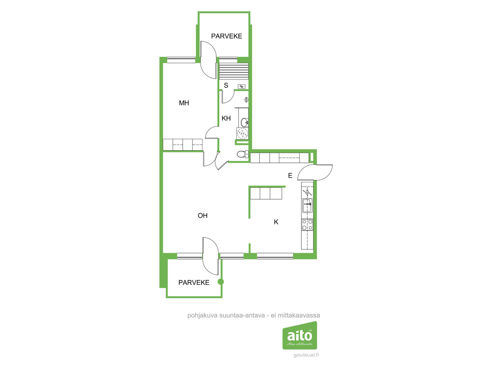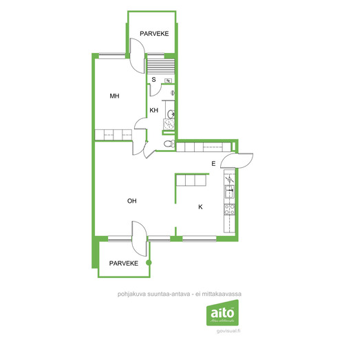 Huoneiston pohjaratkaisu on avara ja käytännöllinen, ja olohuoneen runsas tilantuntu tekee tilasta kodikkaan ja kutsuvan. Erikoisuutena asunto tarjoaa kaksi parveketta, joille on kulku sekä olohuoneesta että makuuhuoneesta, sekä kylpyhuoneen kaksi erillistä sisäänkäyntiä, mikä tekee arjen toiminnallisuudesta poikkeuksellisen helppoa. Oma sauna lisää asumismukavuutta ja tekee arjesta pientä luksusta.