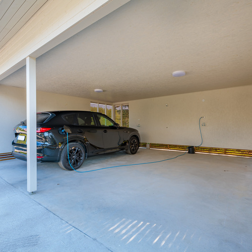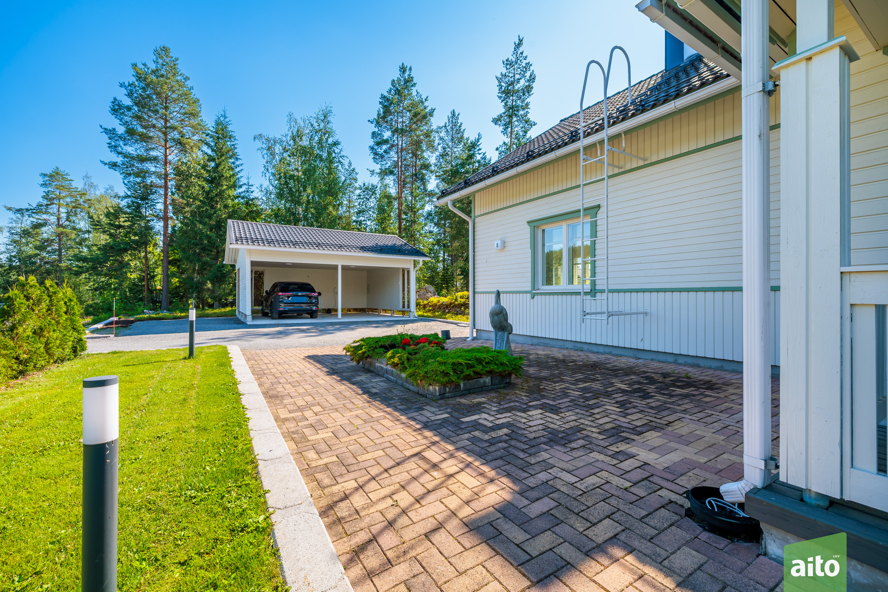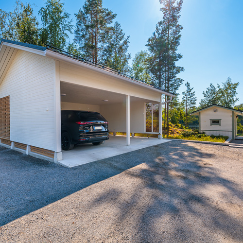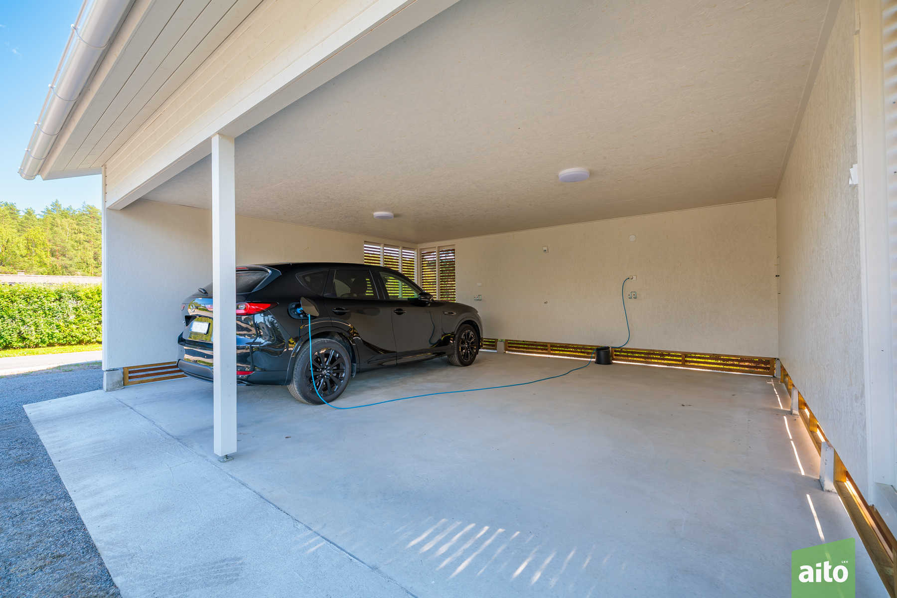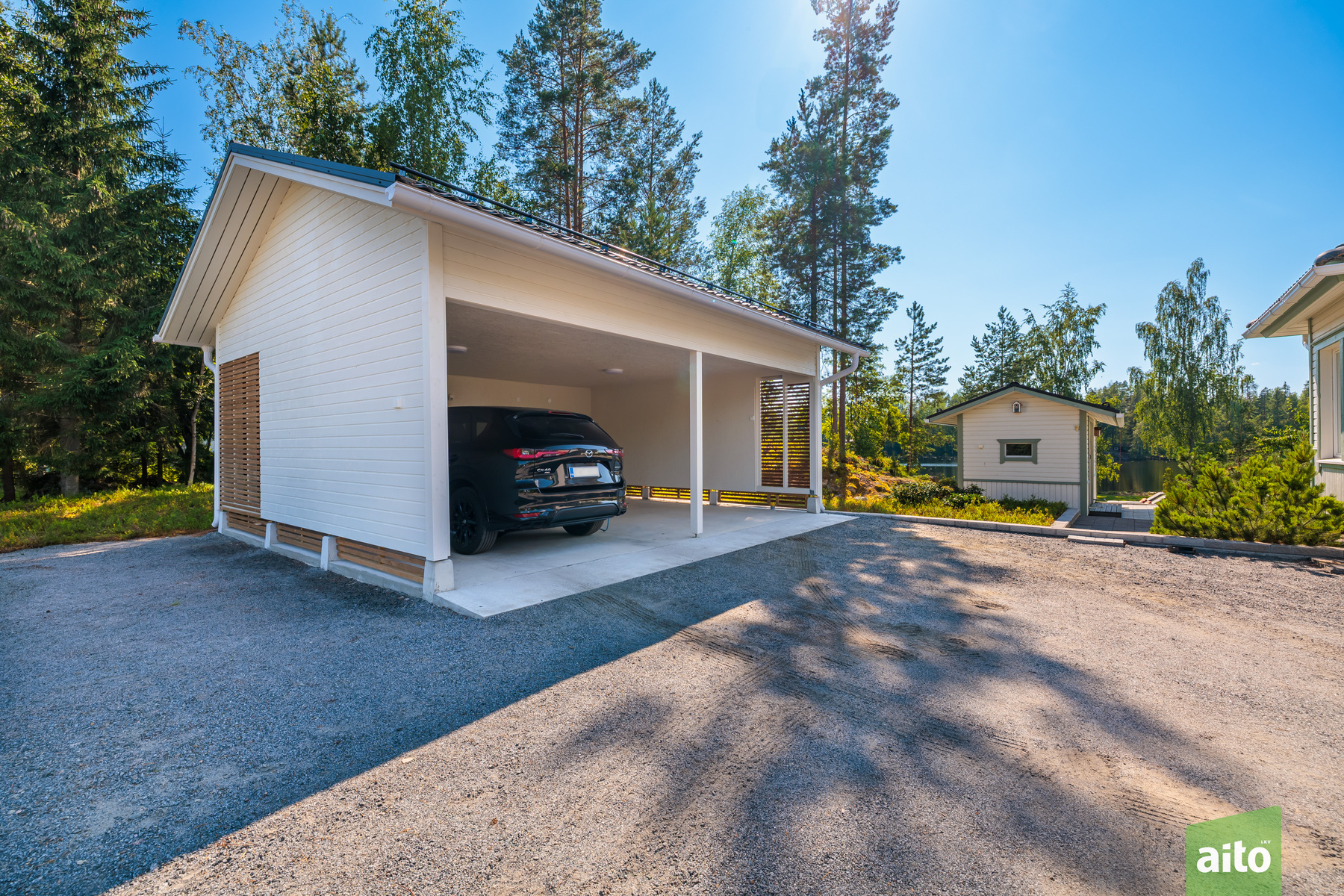 – Äskettäin valmistunut autokatos ja viimeistelty pihapiiri