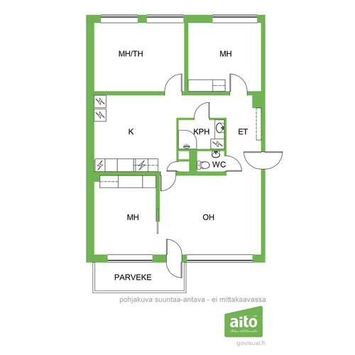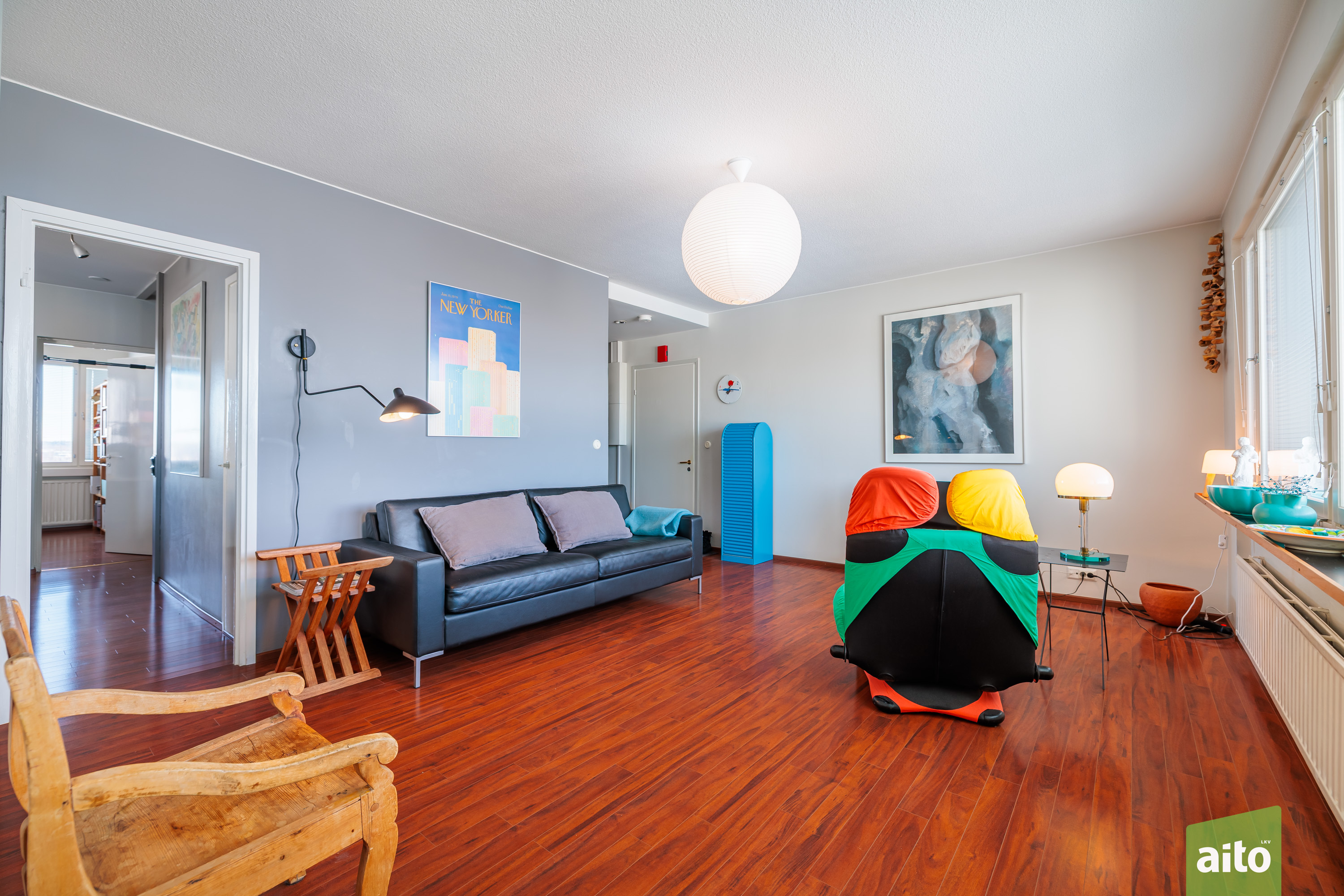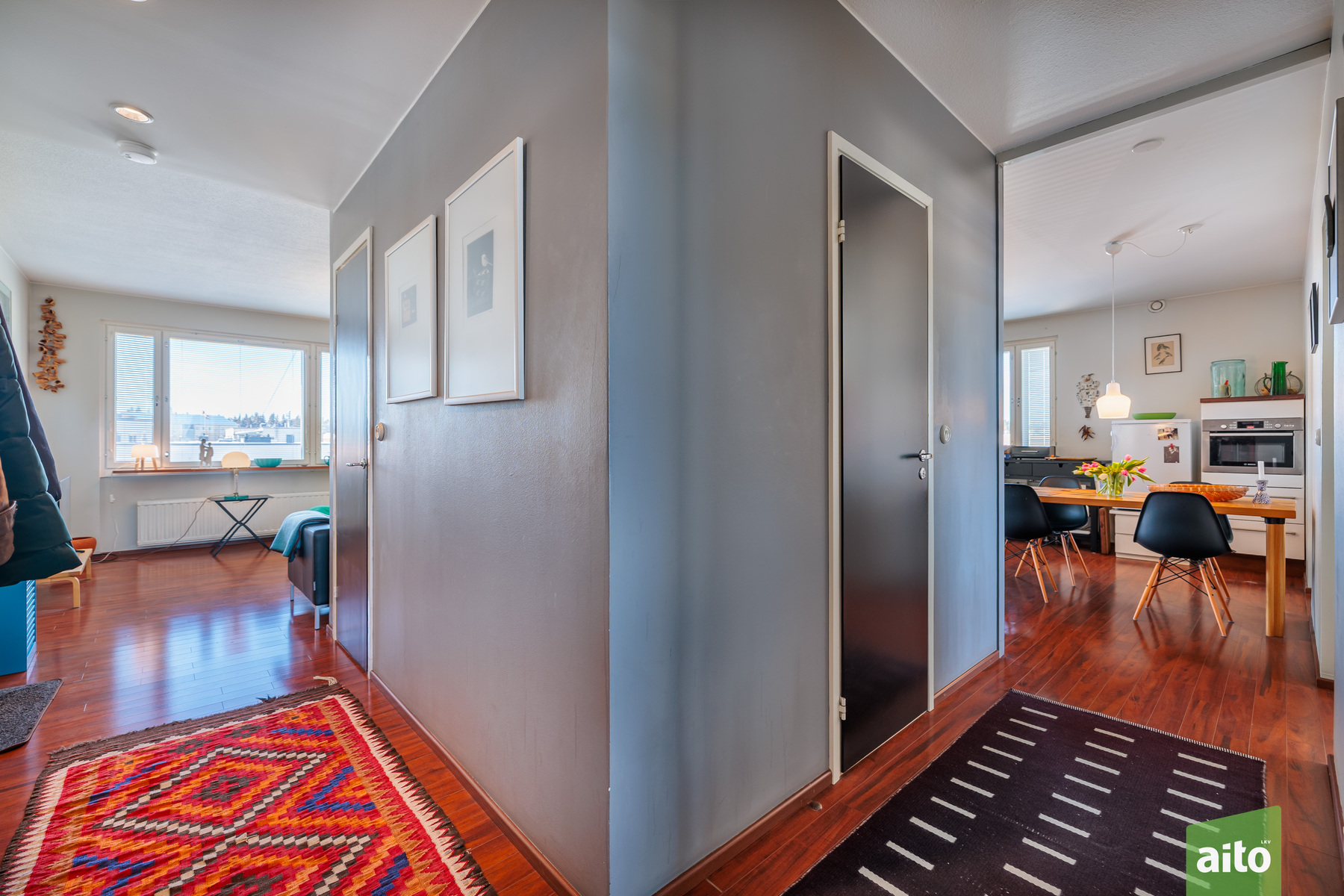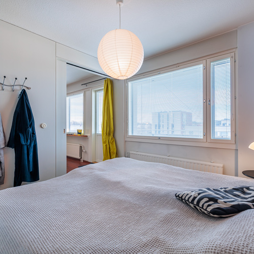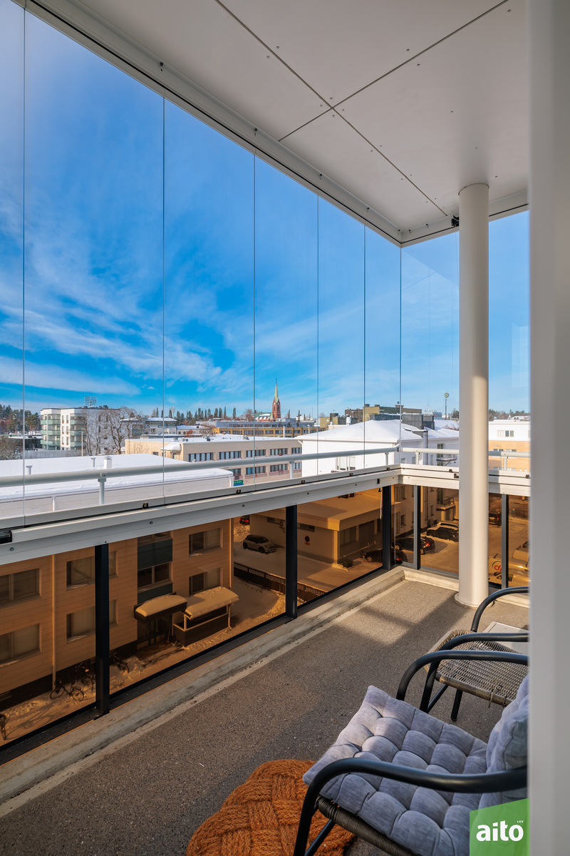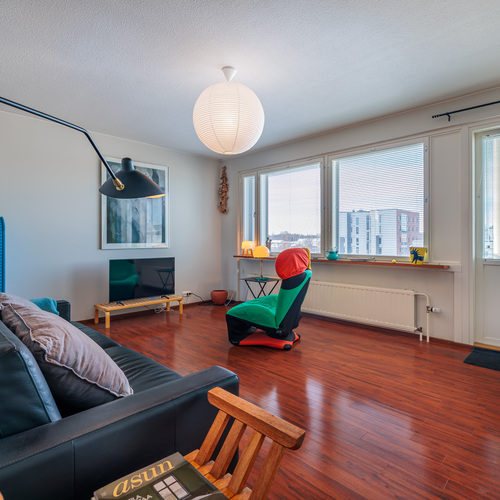 Huoneisto käsittää kolme makuuhuonetta, avaran olohuoneen, keittiön, kylpyhuoneen, erillisen wc:n sekä lasitetun parvekkeen. Läpitalon huoneistona asunto saa runsaasti luonnonvaloa, ja ikkunat avautuvat itään, länteen ja pohjoiseen. Lasitettu parveke tuo lisätilaa ja mahdollistaa viihtyisän oleskelun pitkälle syksyyn.