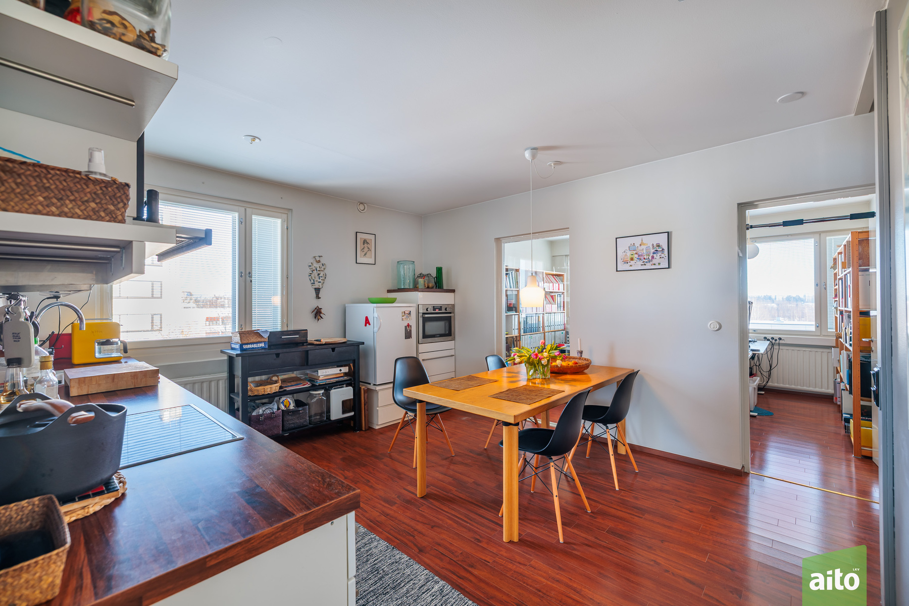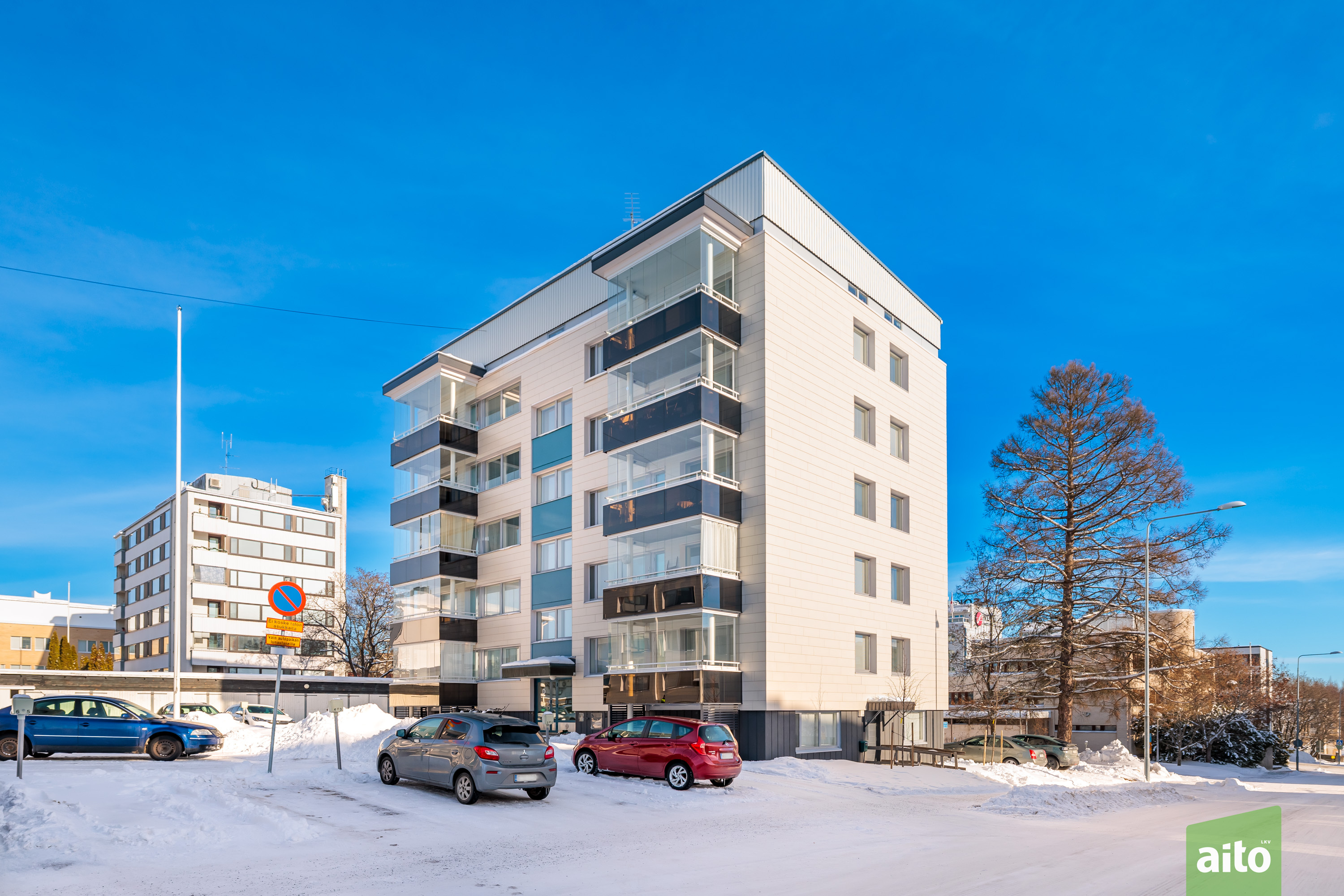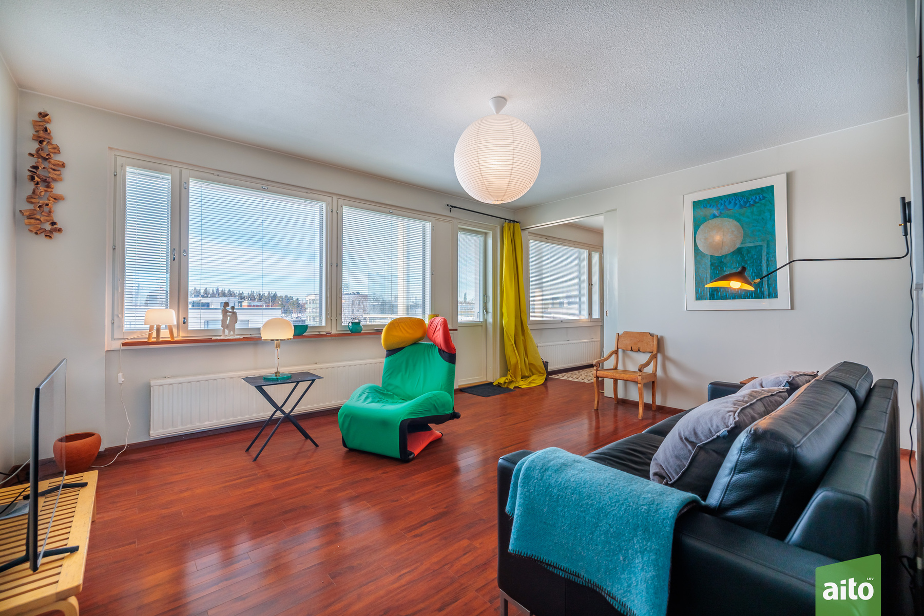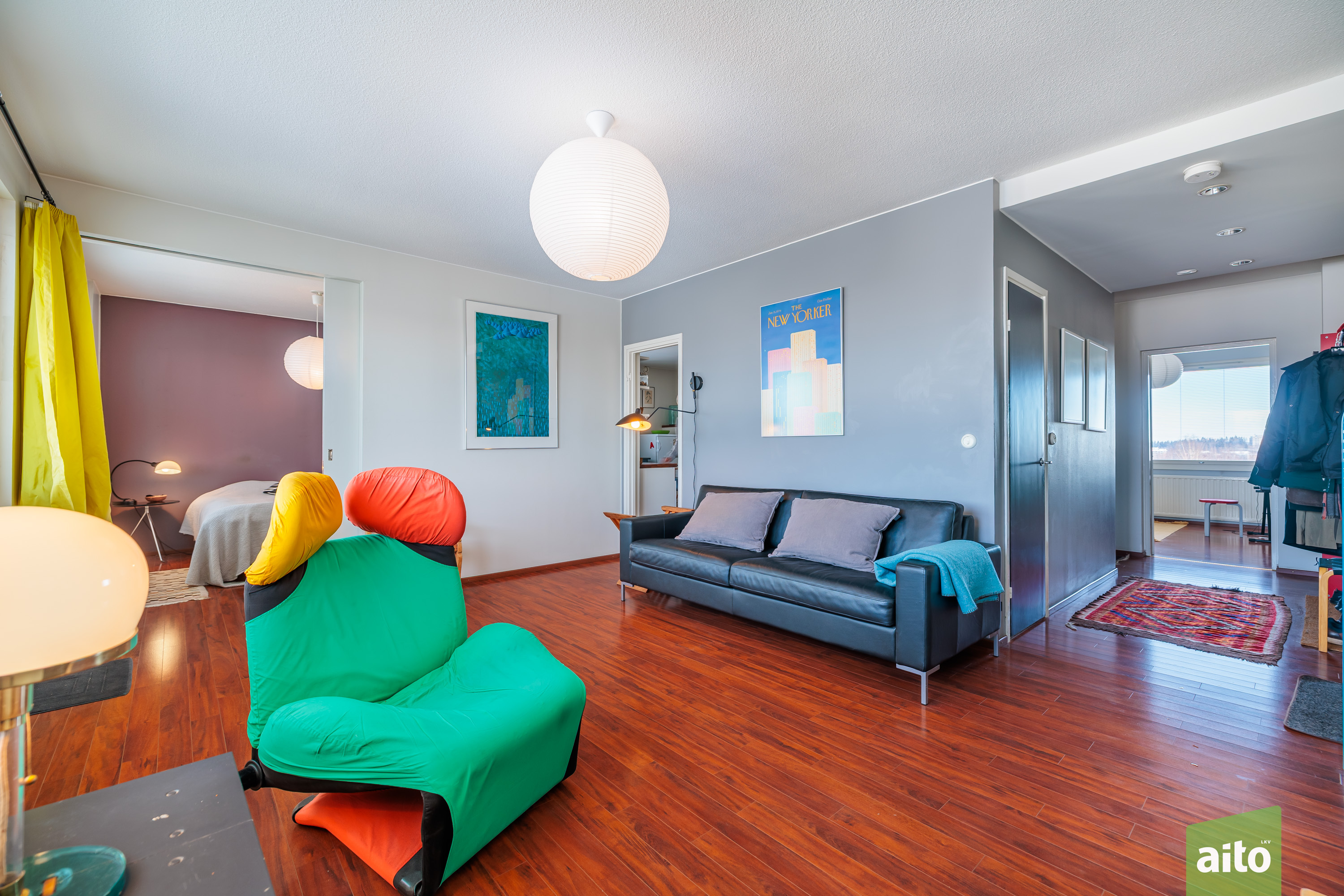Huoneisto käsittää kolme makuuhuonetta, avaran olohuoneen, keittiön, kylpyhuoneen, erillisen wc:n sekä lasitetun parvekkeen. Läpitalon huoneistona asunto saa runsaasti luonnonvaloa, ja ikkunat avautuvat itään, länteen ja pohjoiseen. Lasitettu parveke tuo lisätilaa ja mahdollistaa viihtyisän oleskelun pitkälle syksyyn.