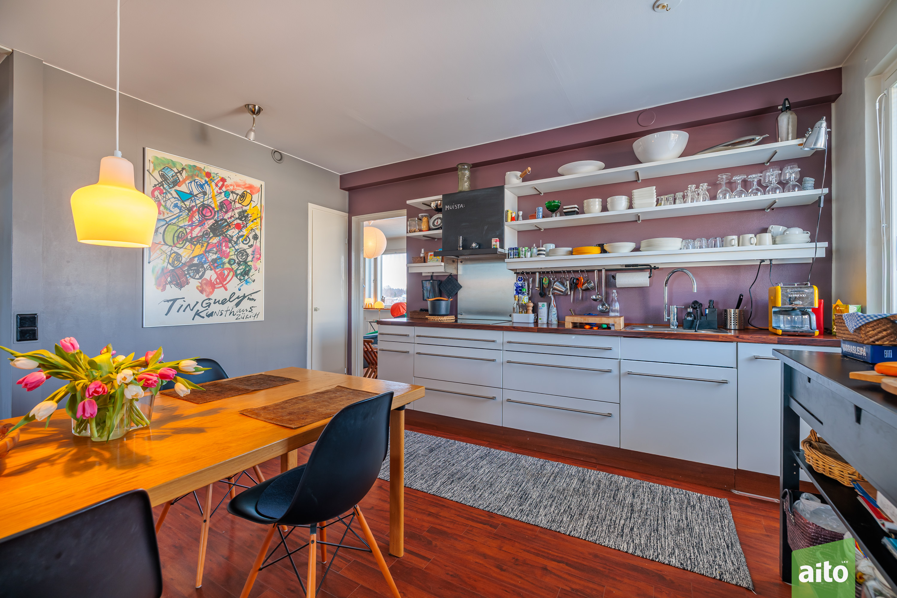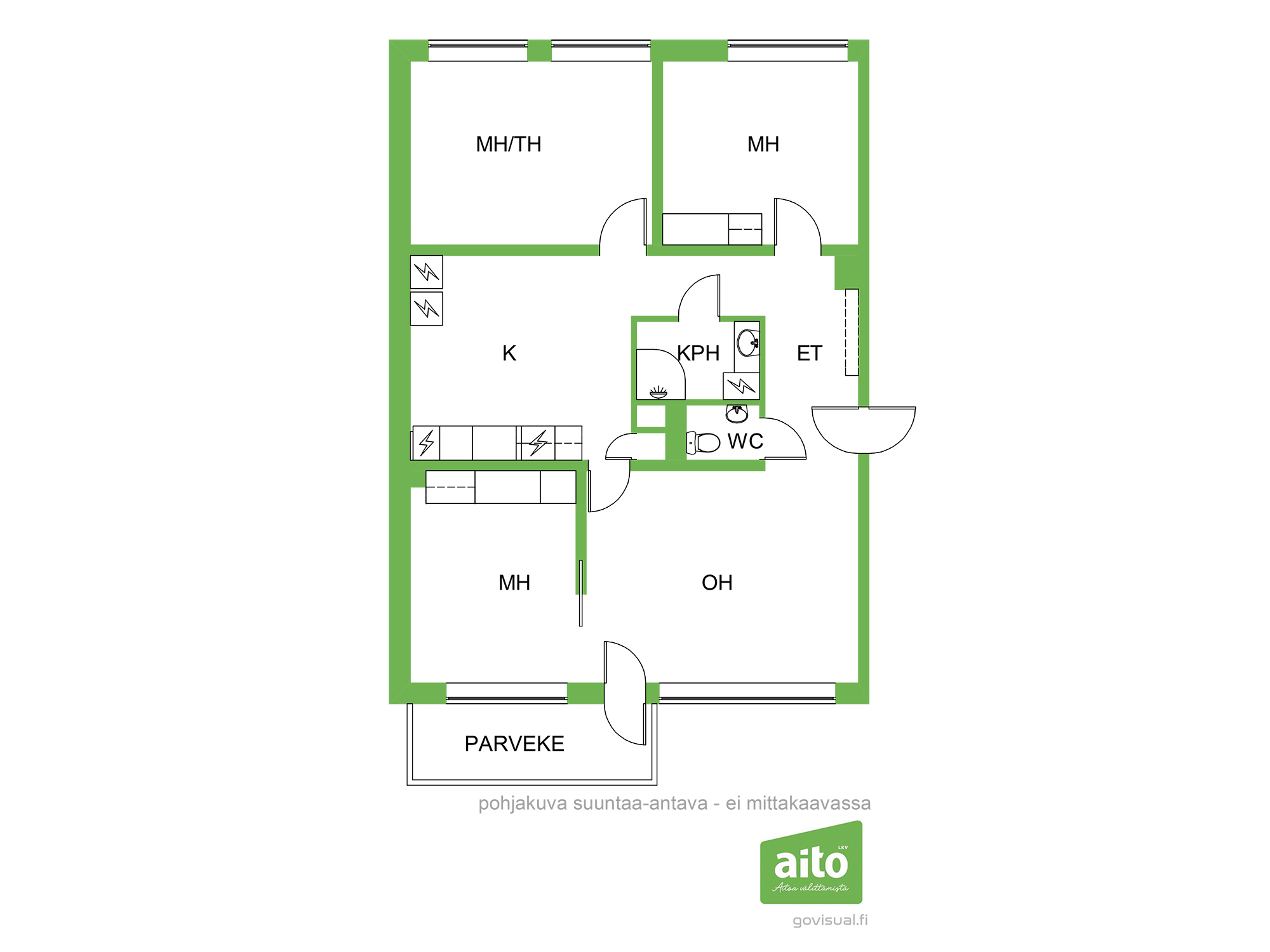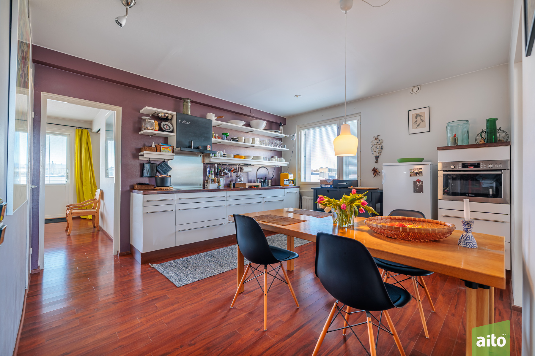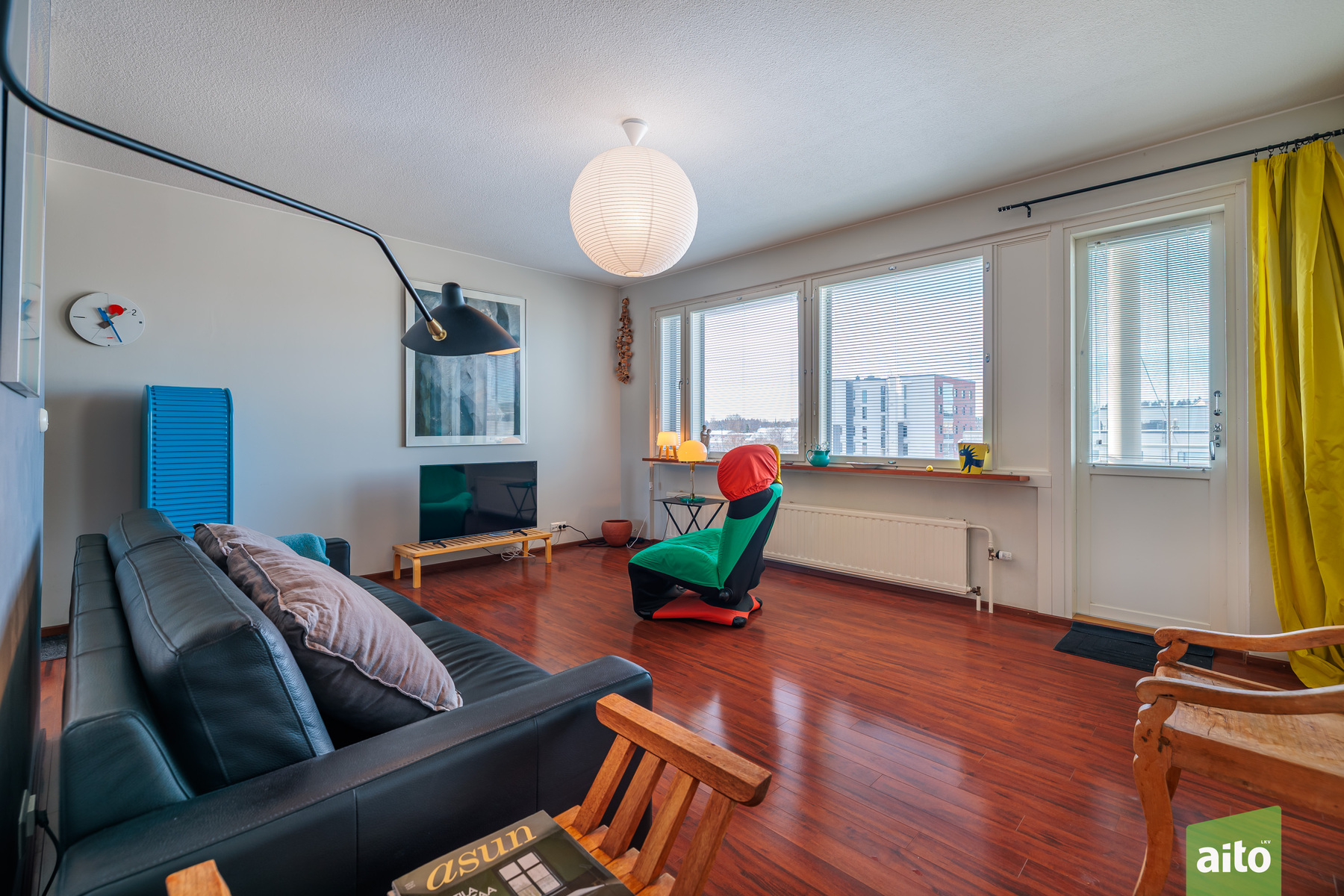 Huoneisto käsittää kolme makuuhuonetta, avaran olohuoneen, keittiön, kylpyhuoneen, erillisen wc:n sekä lasitetun parvekkeen. Läpitalon huoneistona asunto saa runsaasti luonnonvaloa, ja ikkunat avautuvat itään, länteen ja pohjoiseen. Lasitettu parveke tuo lisätilaa ja mahdollistaa viihtyisän oleskelun pitkälle syksyyn.