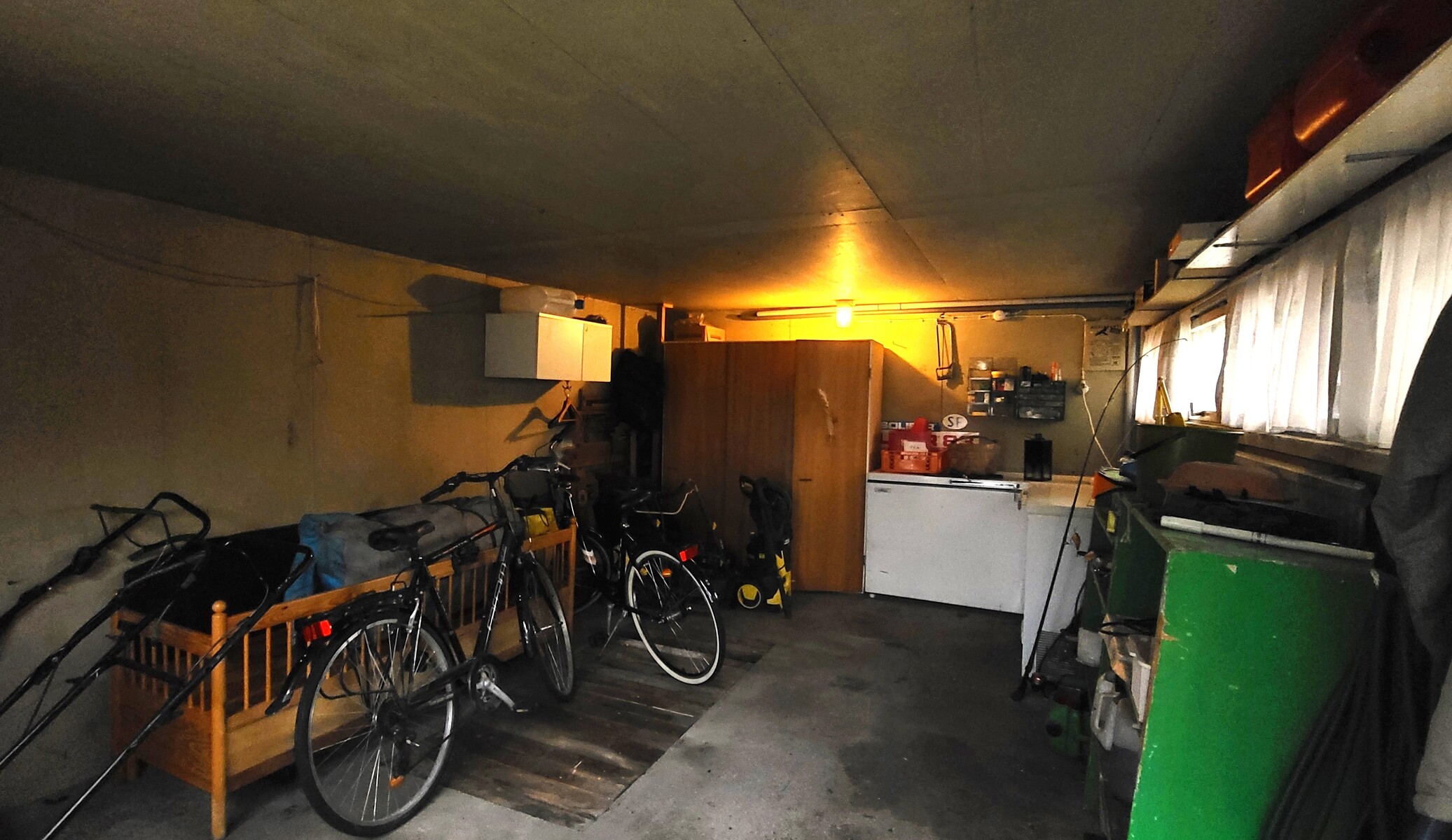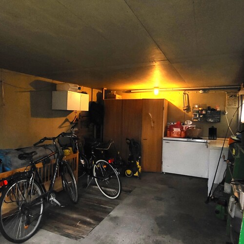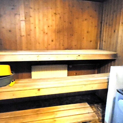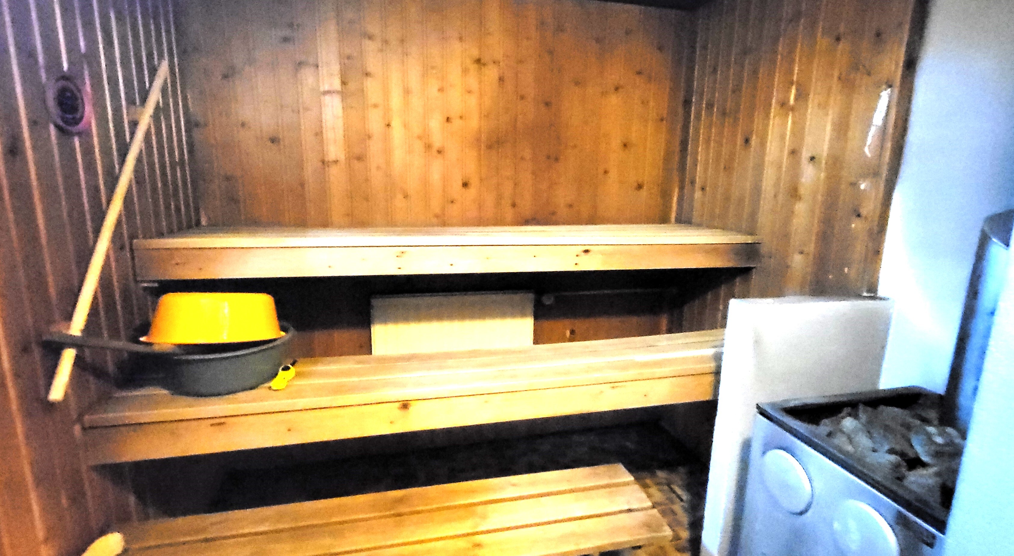 Lämmin piharakennus jossa autotalli, saunaosasto: pukuhuone, pesuhuone ja sauna. Lisäksi kylmätilana liiteri/varasto.