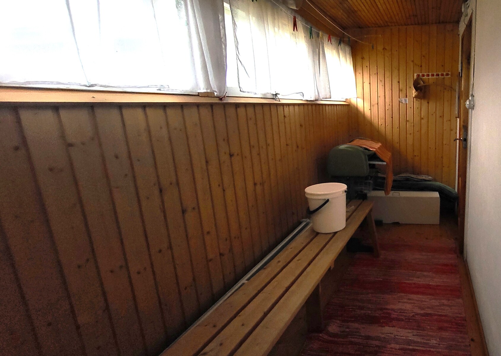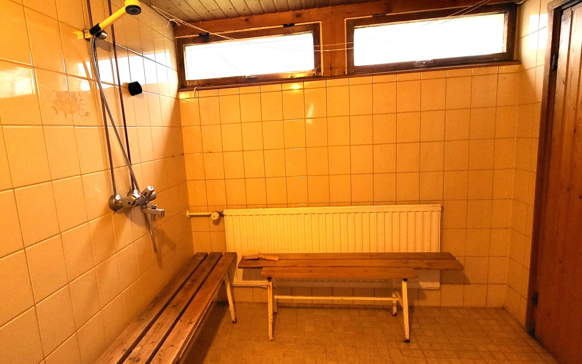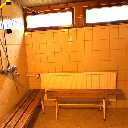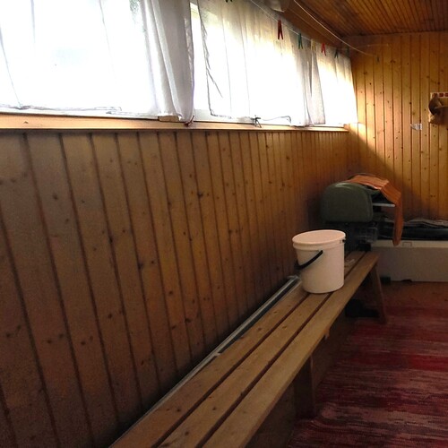 Pukuhuone, pesuhuone ja sauna erillisessä piharakennuksessa.