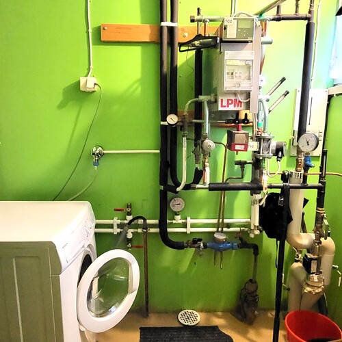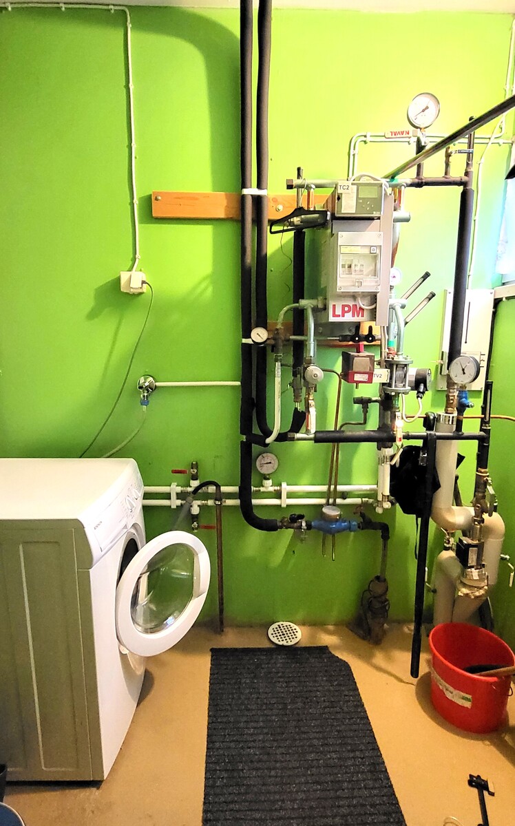Tekninen tila: Kaukolämmön tekniikka ja pyykinpesukone teknisessä tilassa.