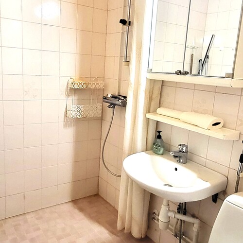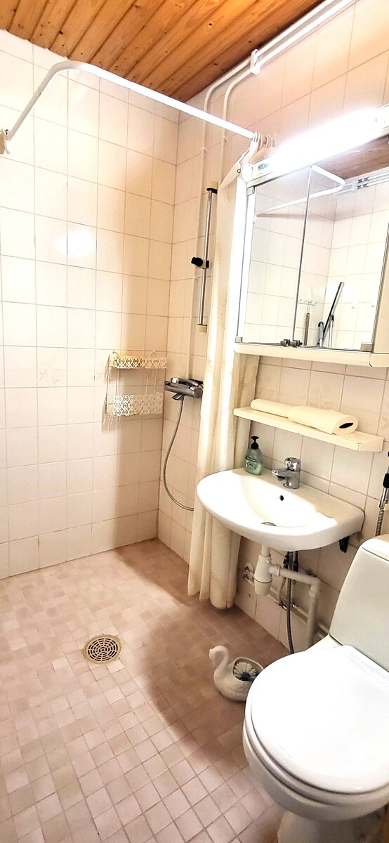 Varusteet: lattiaan asennettu WC, bidee, suihku