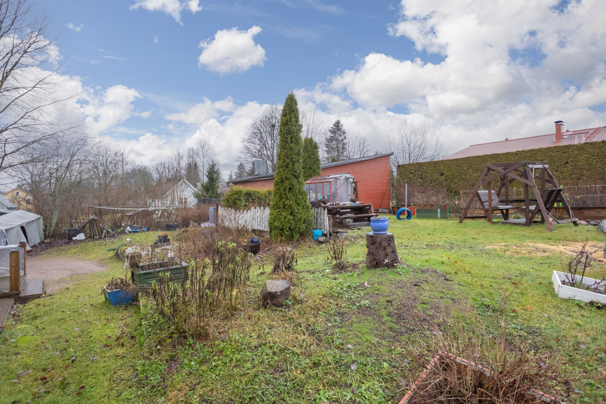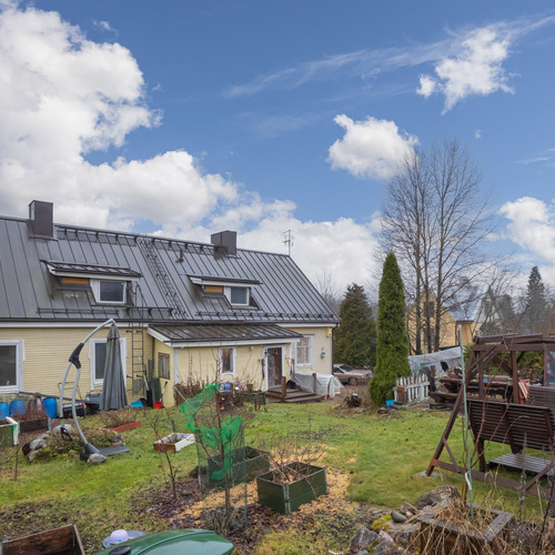 Viihtyisä takapiha pääosin nurmea, paljon istutuksia (vadelma, musta- ja punaviinimarja, karviainen, pensasmustikka, raparperi, kirsikkapuita, omenapuu, ruusuja ym.). Oleskelualue, tamppausteline, pyykinkuivaustelineet. Kuistin edessä pieni terassi.