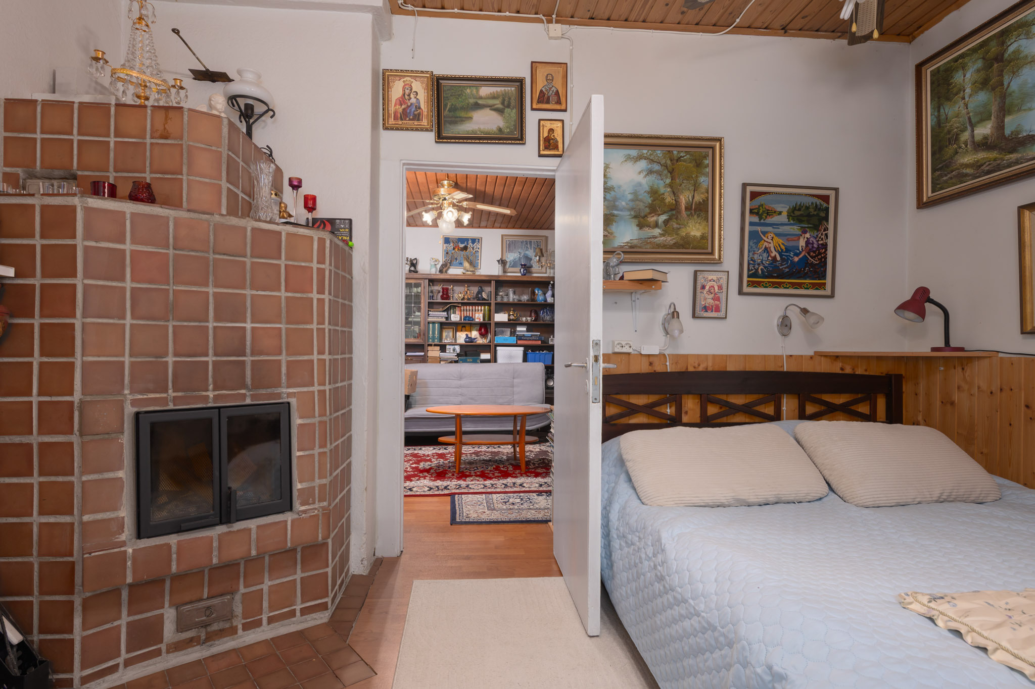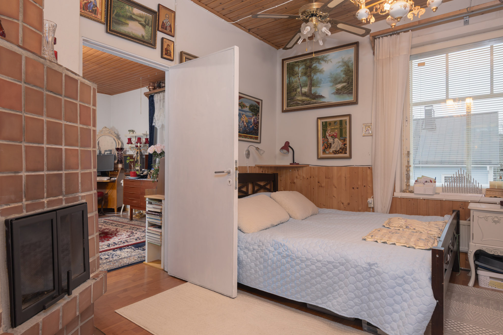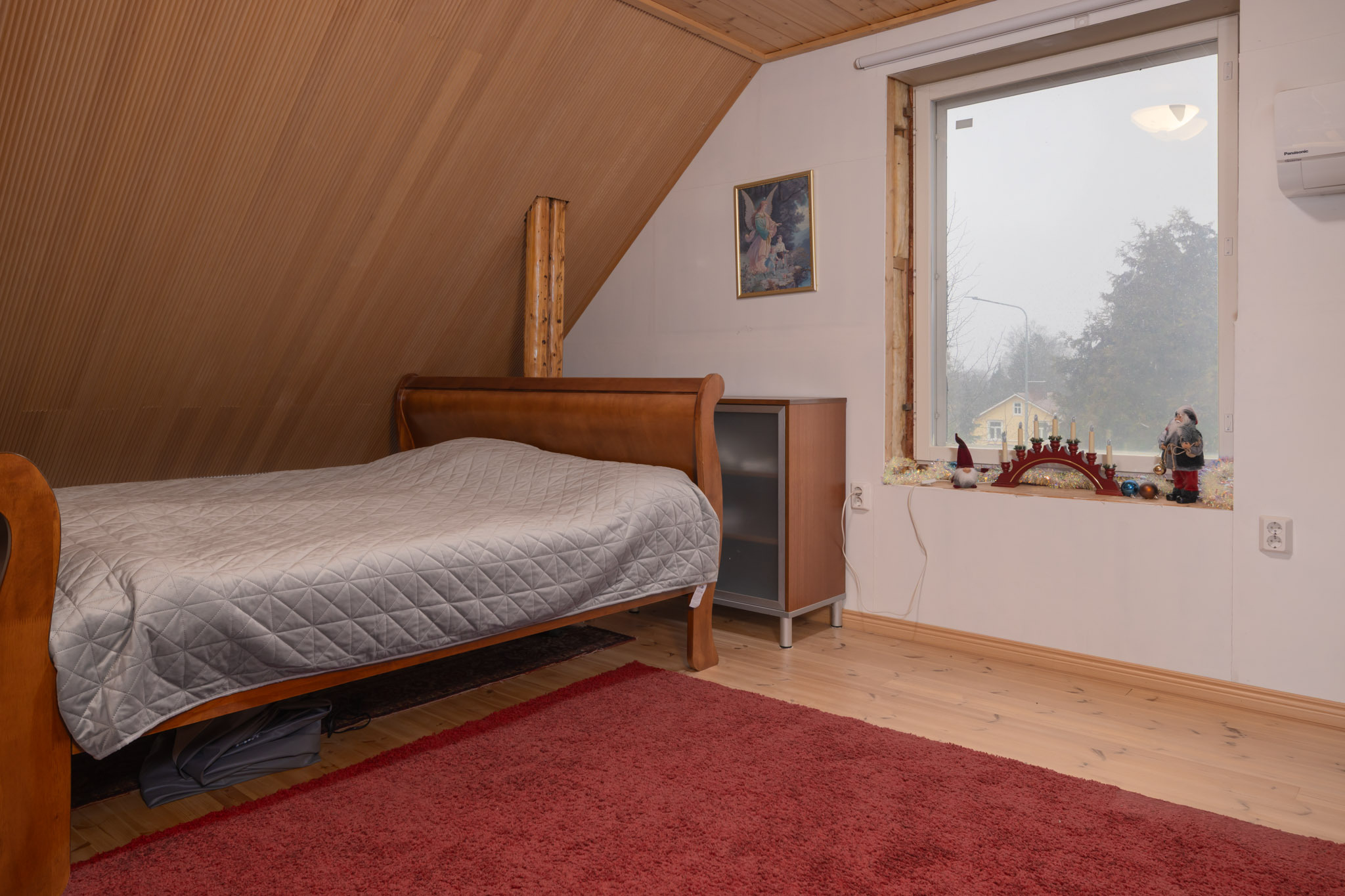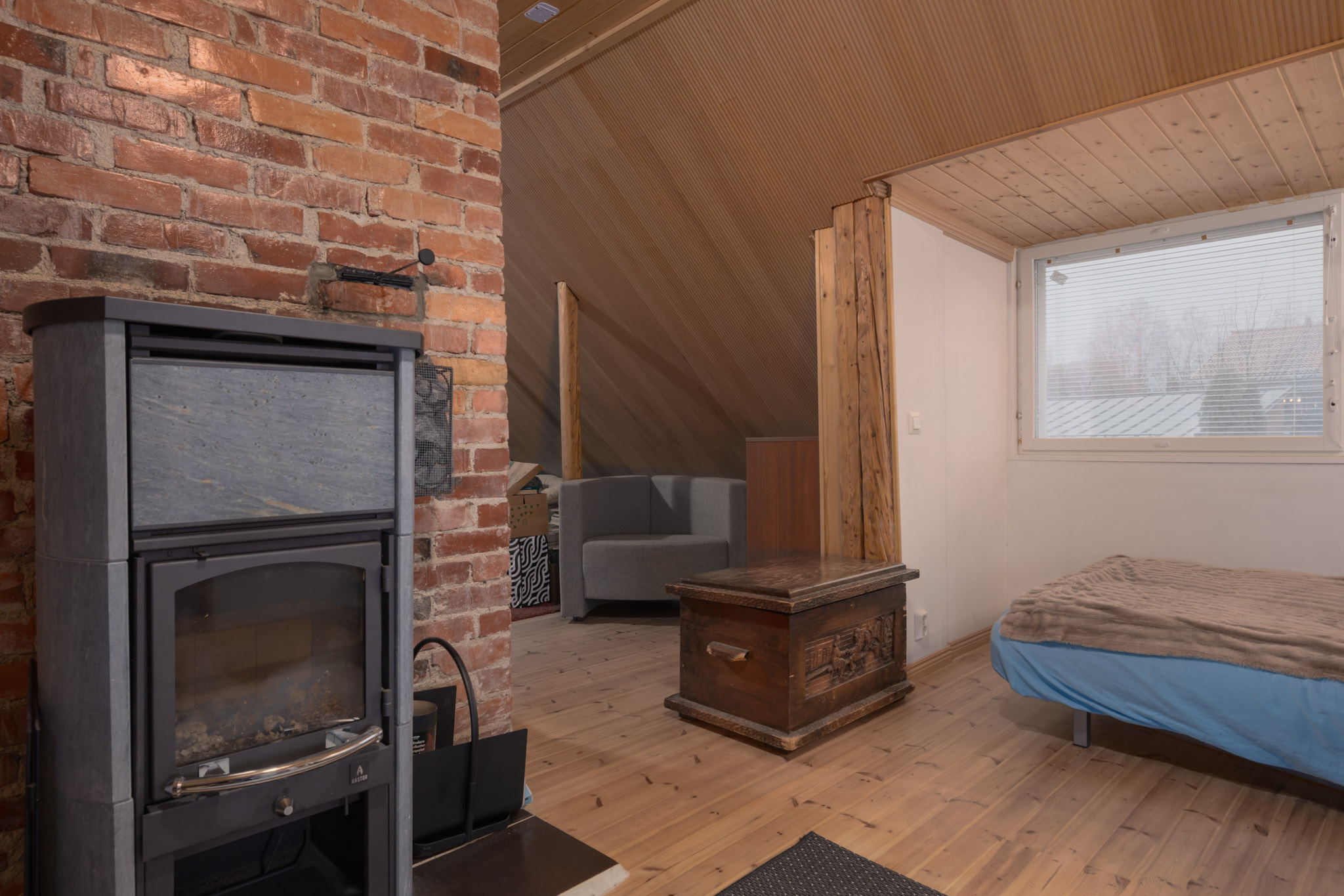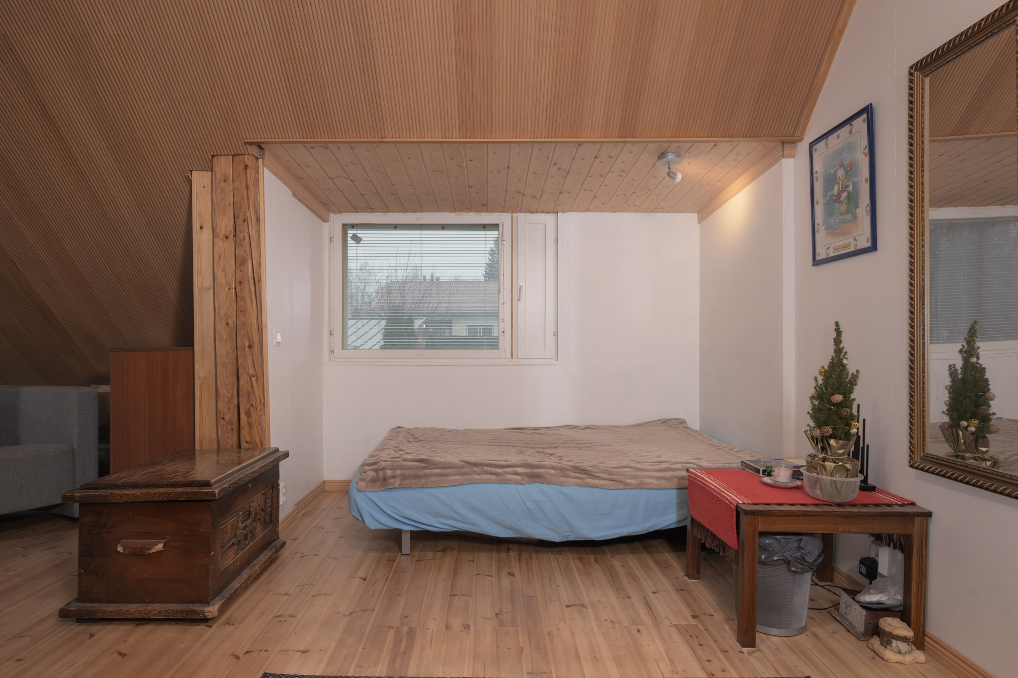 Yläkerran makuuhuonetta laajennettu ja remontoitu noin v. 2015. Tila jaettavissa helposti kahdeksi huoneeksi. Vuolukivitakka. Seinät: maalattu/sormipaneeli. Lattia: puulattia.