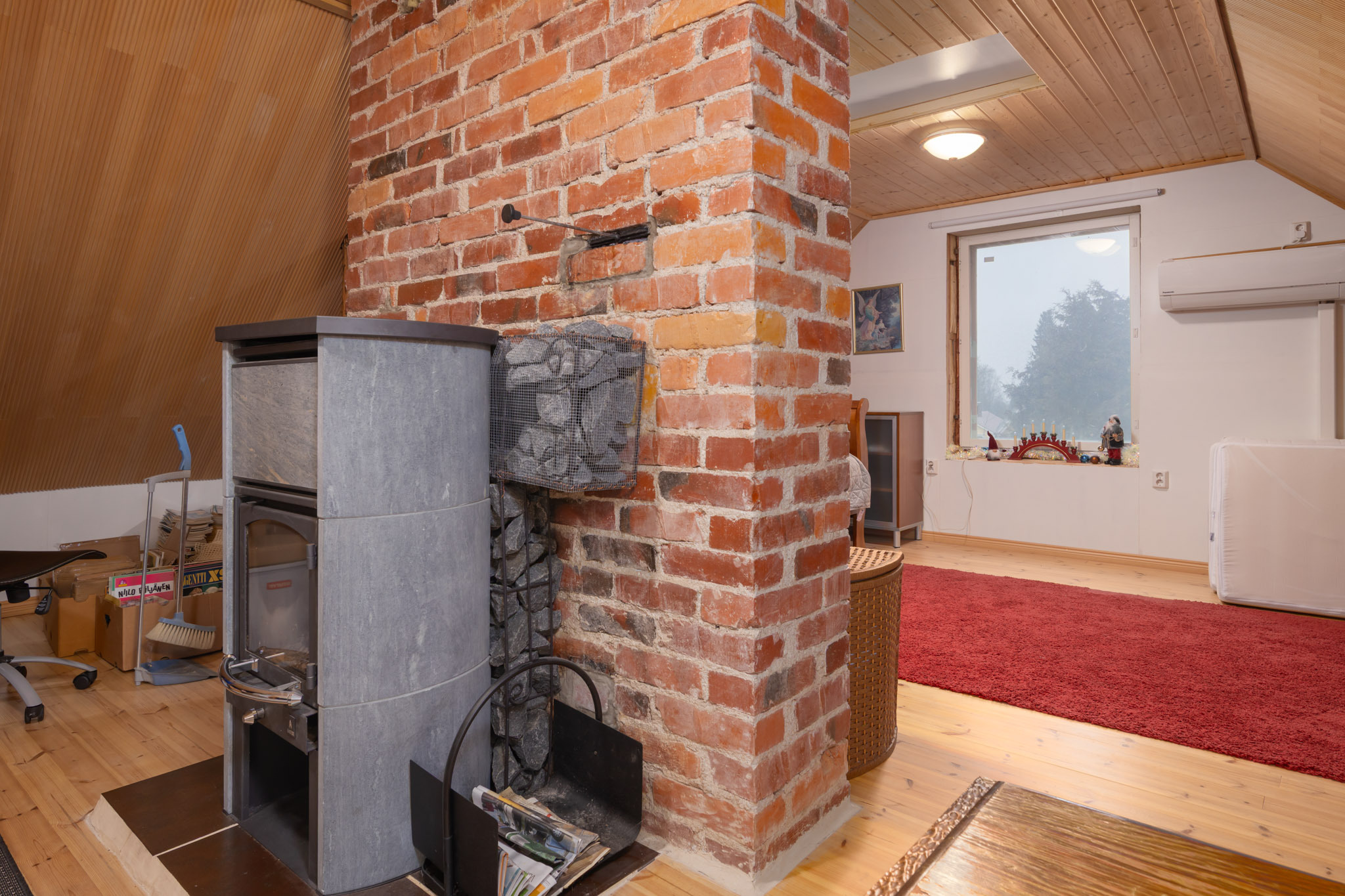 Alakerrassa kaksi tulisijaa, varaava tiilitakka ja Porin Matti, yläkerrassa varaava noin v. 2015 pystytetty vuolukivitakka. Kellarissa avotakka. Puukiuas.