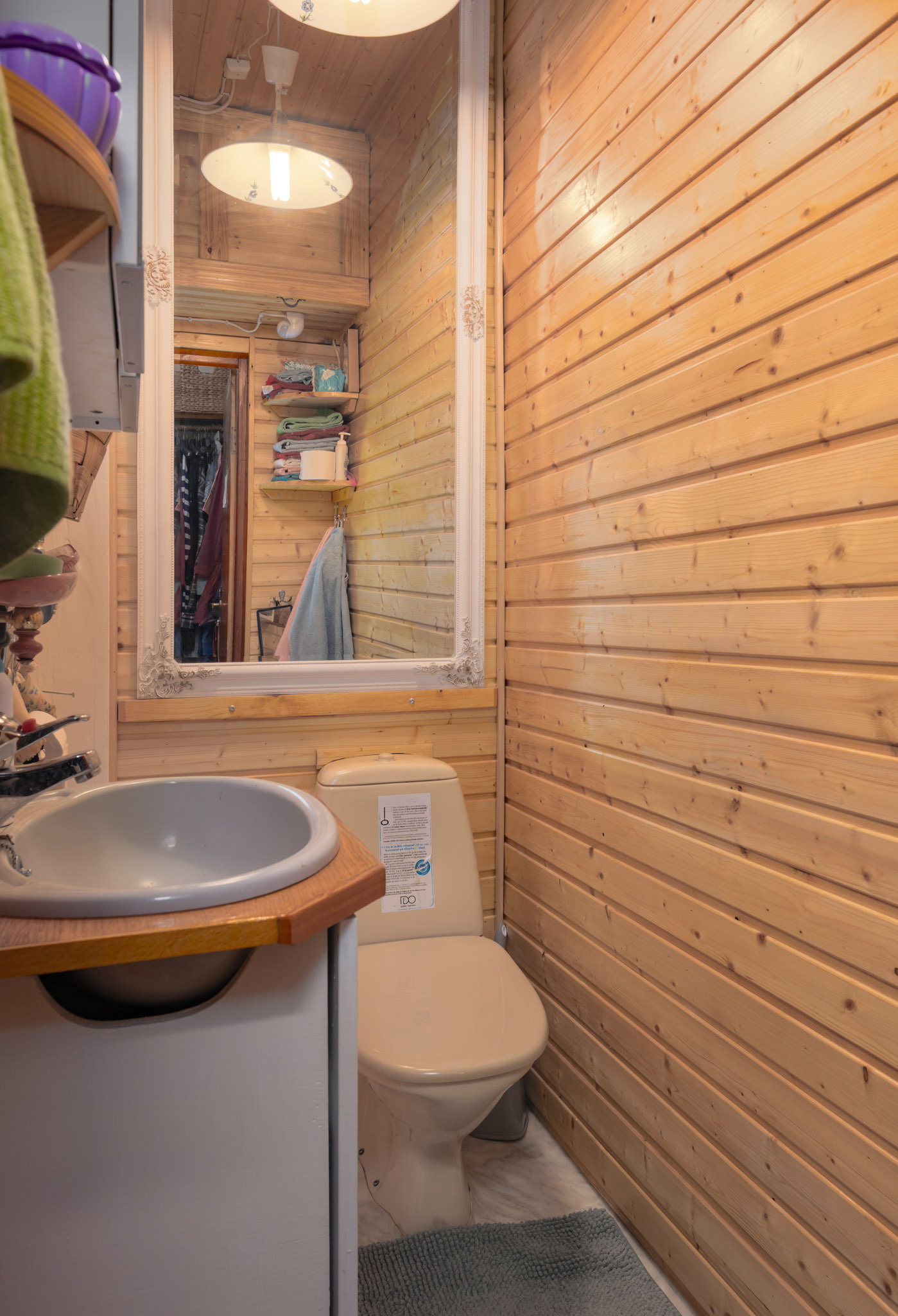 Puukiuas. Seinät: puupaneeli. Lattia: laatta.