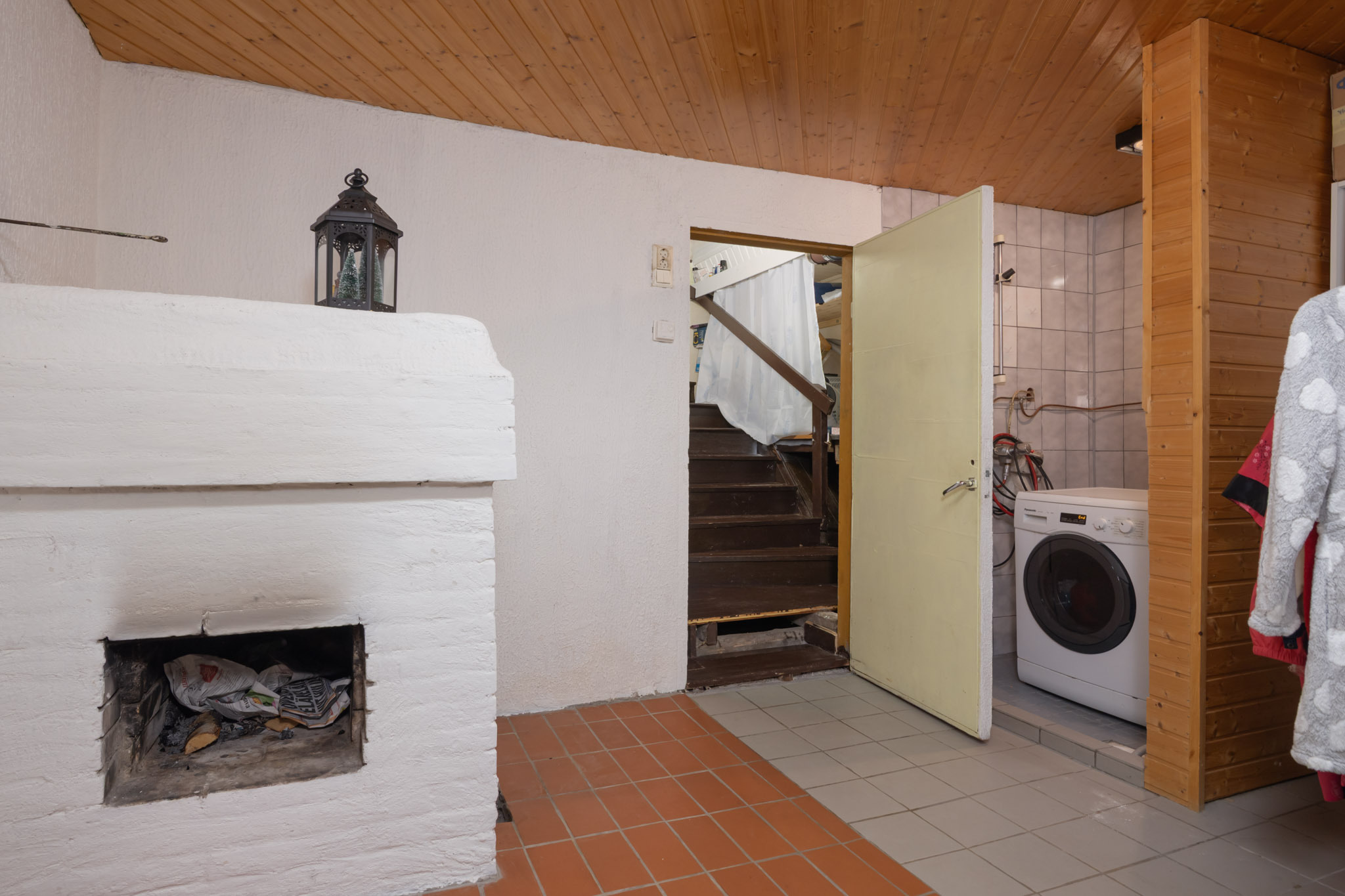 Kellarikerroksessa tilava takkahuone/kodinhoitohuone. Pesukoneliitäntä. Seinät: betoni/maali. Lattia: laatta.