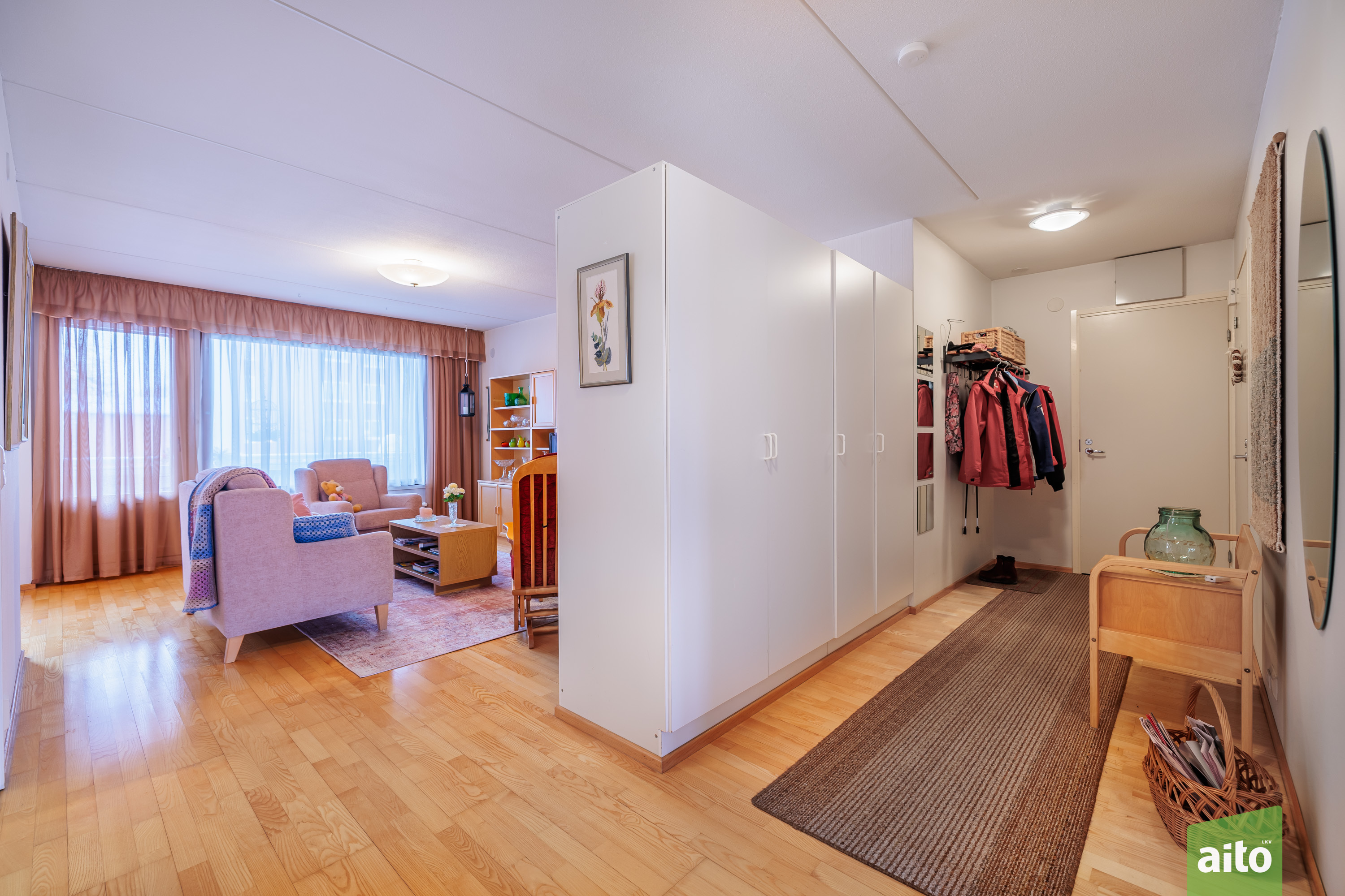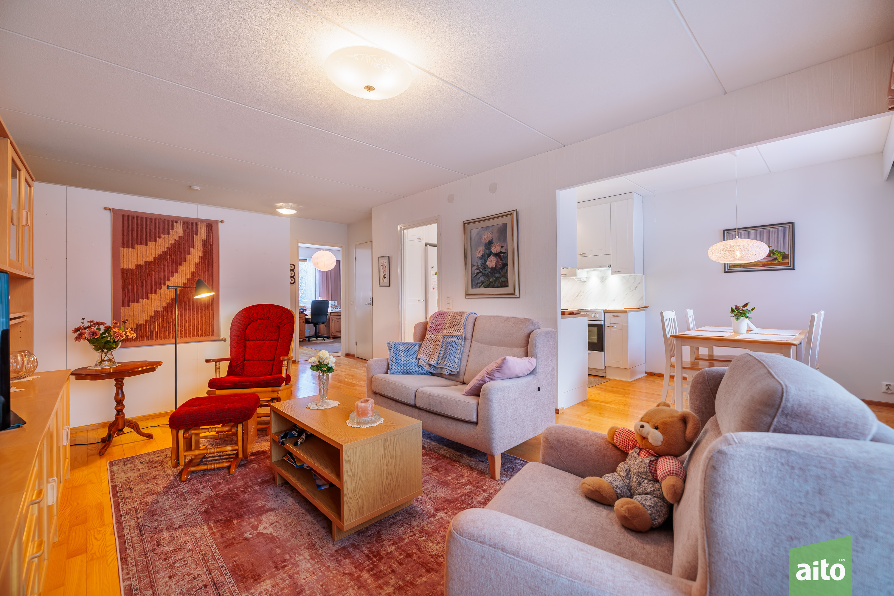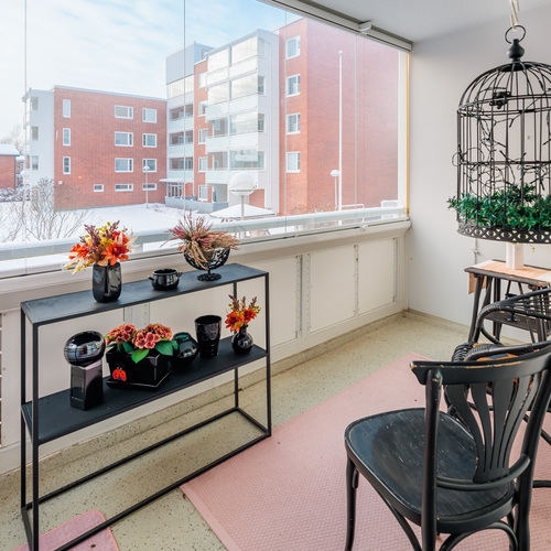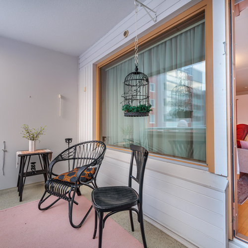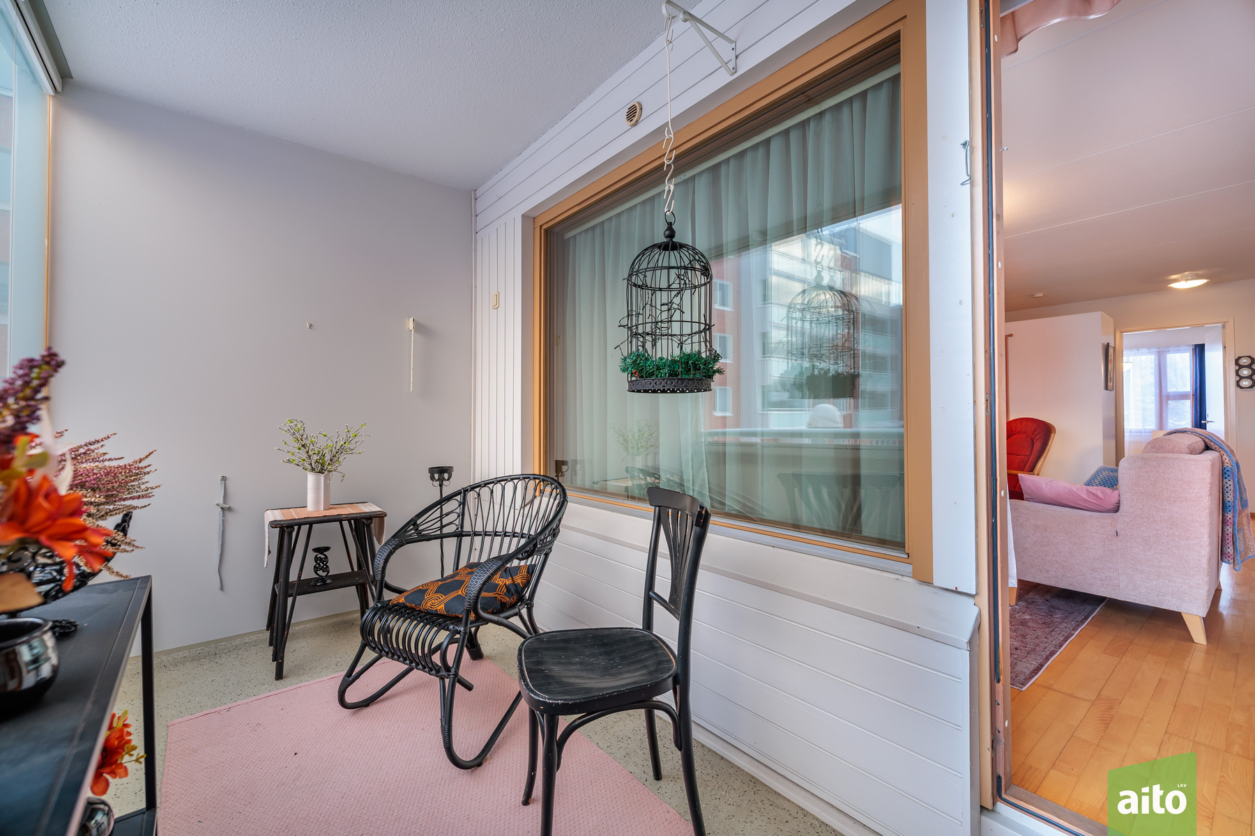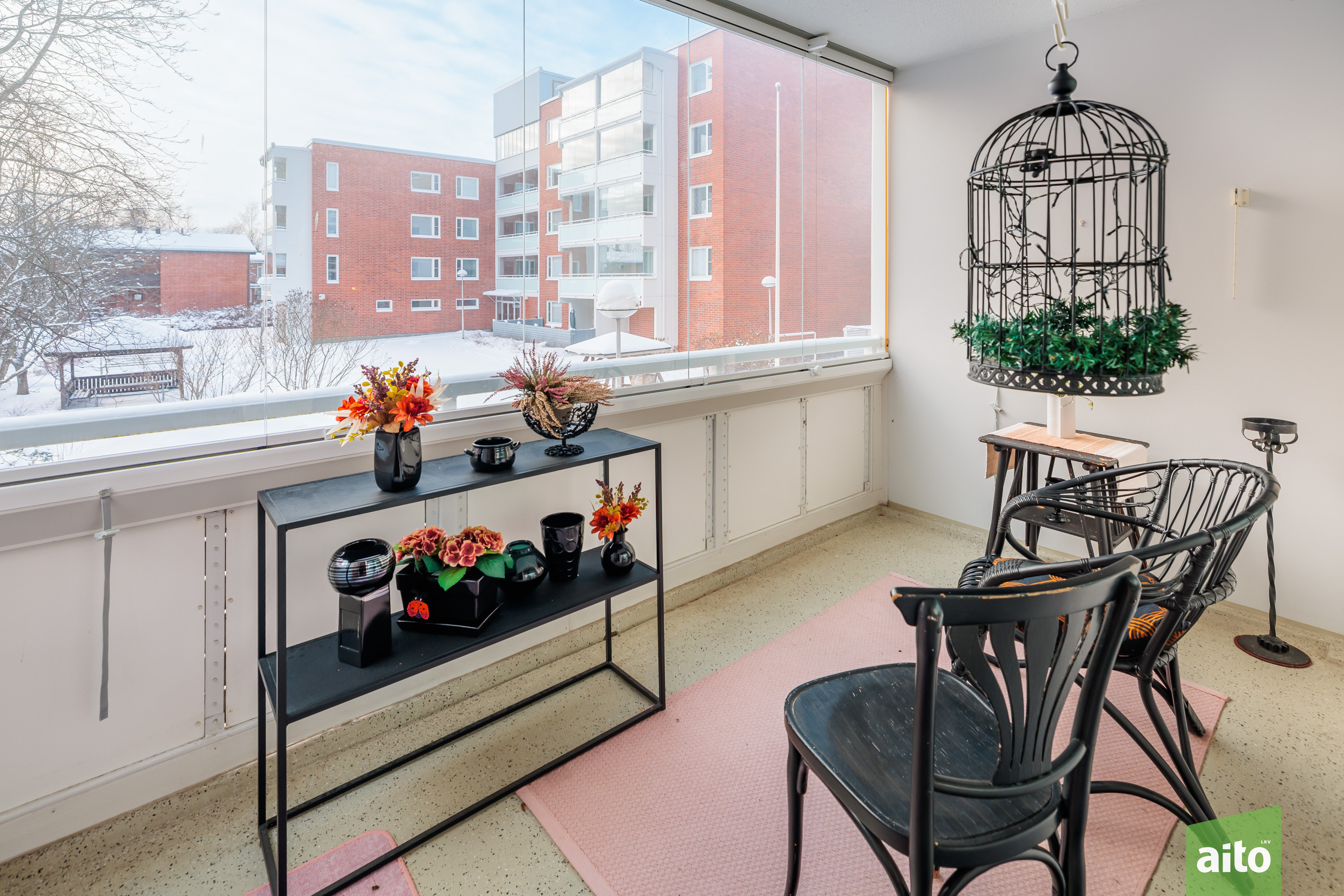 Asunnossa on kaksi makuuhuonetta, valoisa olohuone, erillinen keittiö sekä oma sauna, joka lisää asumismukavuutta ympäri vuoden. Lasitettu parveke toimii lisähuoneena pitkälle syksyyn ja aikaisesta keväästä alkaen. Parvekelasien kunnossapidosta vastaa taloyhtiö.