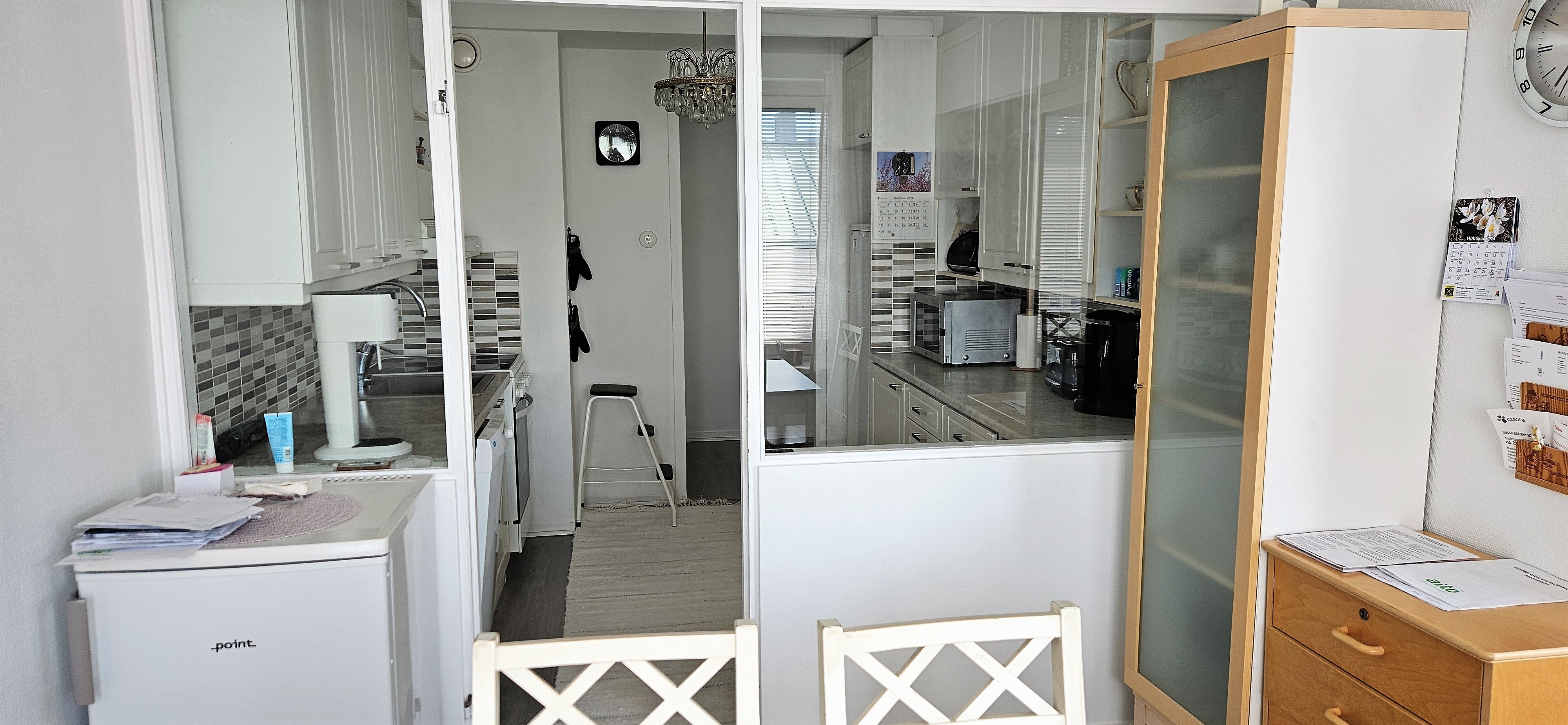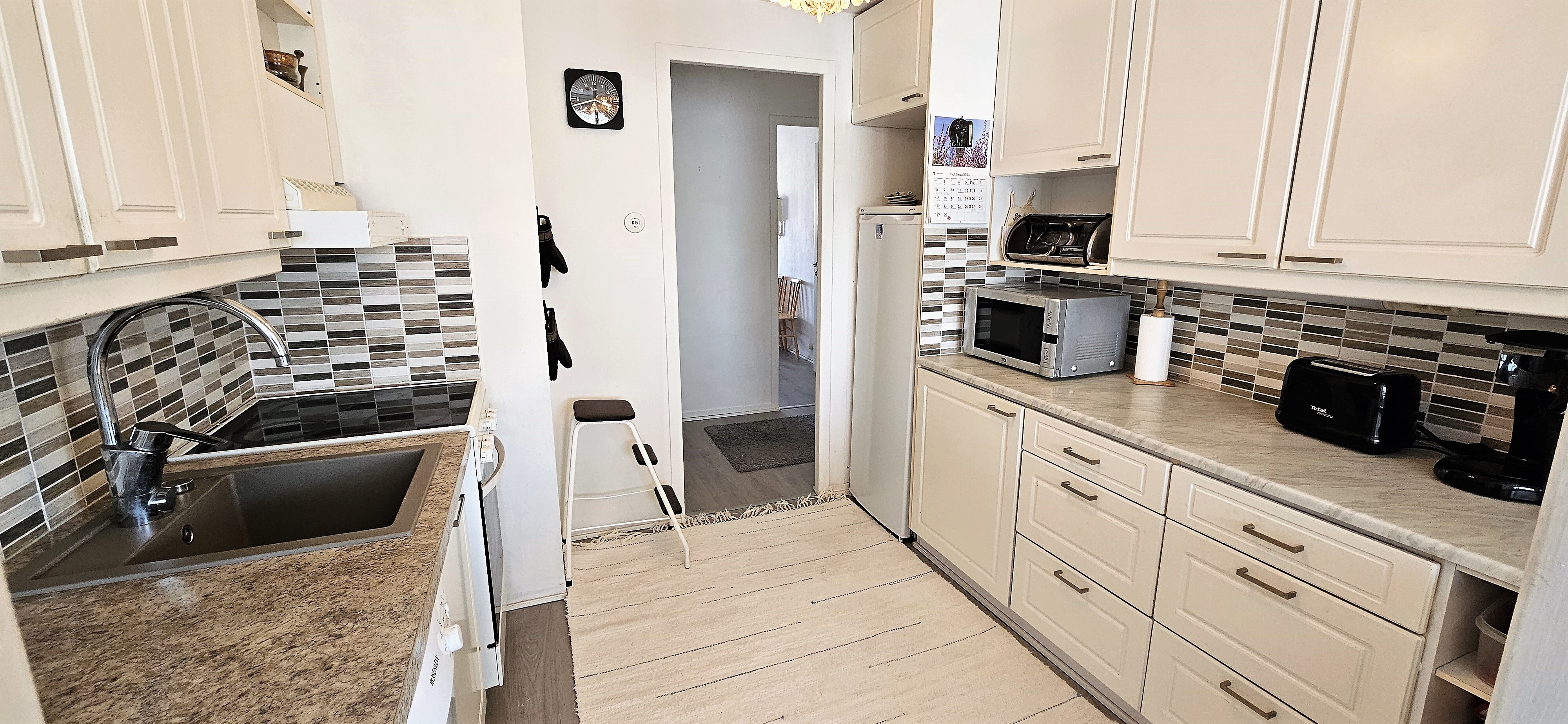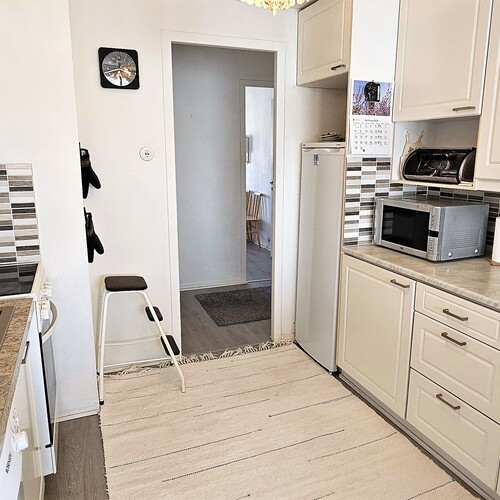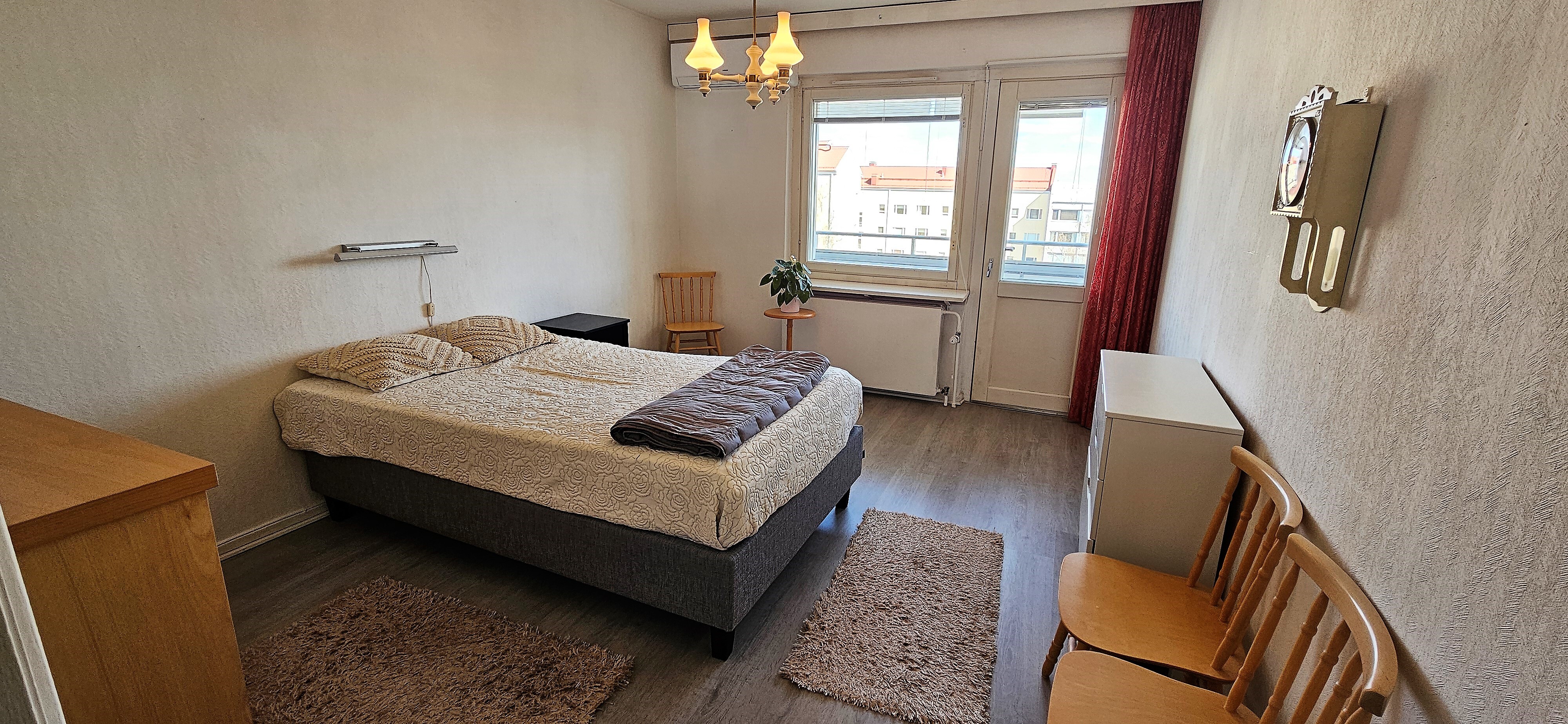 Keittiö on oma kokonaisuutensa ja tarjoaa hyvät säilytys- ja työskentelytilat. Makuuhuone on rauhallinen ja riittävän tilava, ja säilytystilaa löytyy sekä kaapistoista että huoneistokohtaisesta varastosta. Kylpyhuone on siisti ja käytännöllinen, ja kokonaisuus toimii hyvin niin yksinasuvalle kuin pariskunnallekin.