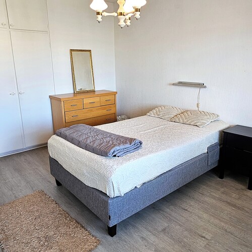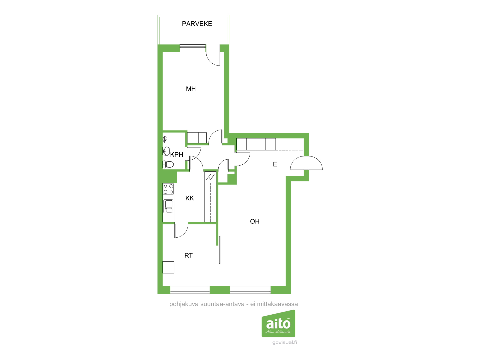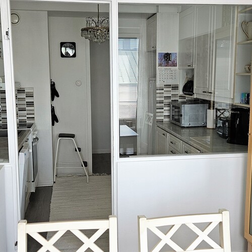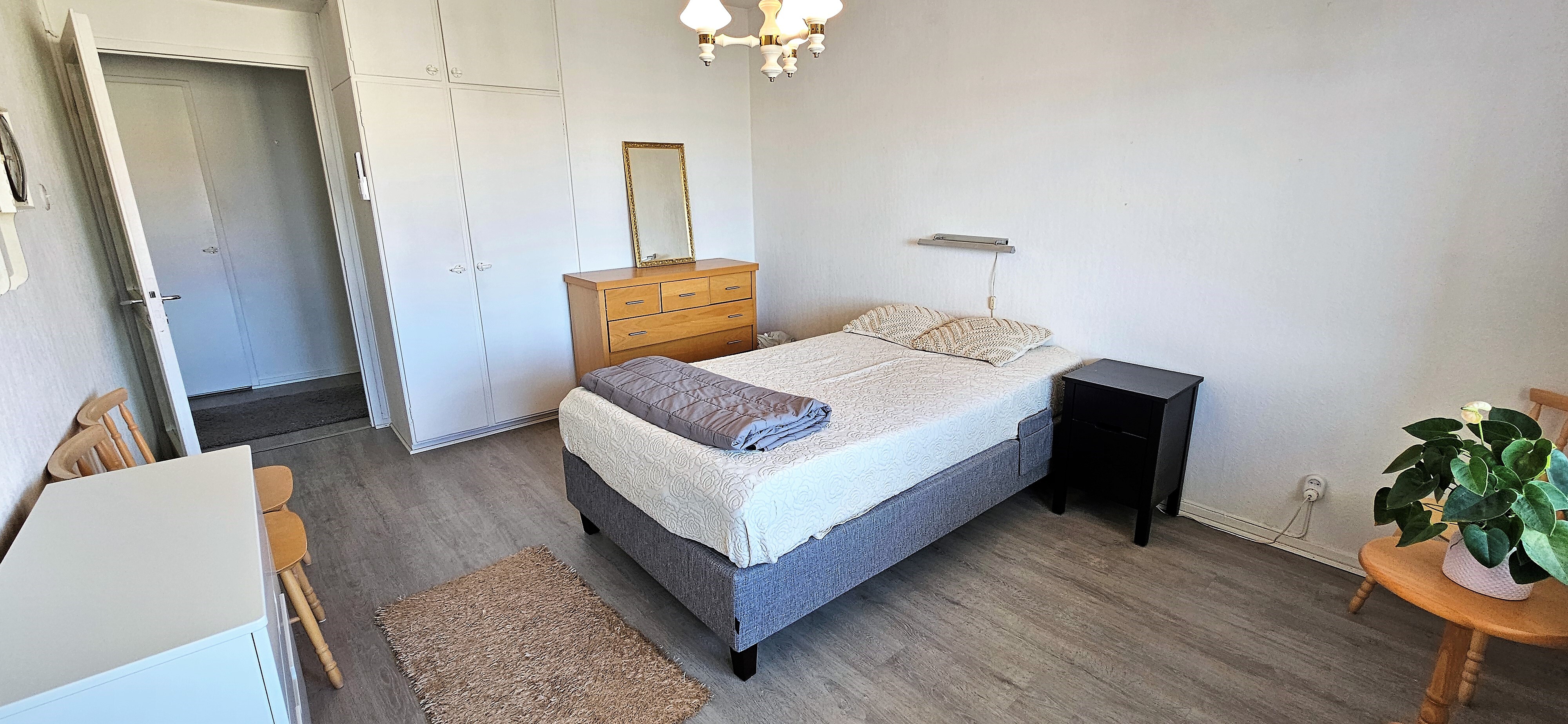 Keittiö on oma kokonaisuutensa ja tarjoaa hyvät säilytys- ja työskentelytilat. Makuuhuone on rauhallinen ja riittävän tilava, ja säilytystilaa löytyy sekä kaapistoista että huoneistokohtaisesta varastosta. Kylpyhuone on siisti ja käytännöllinen, ja kokonaisuus toimii hyvin niin yksinasuvalle kuin pariskunnallekin.