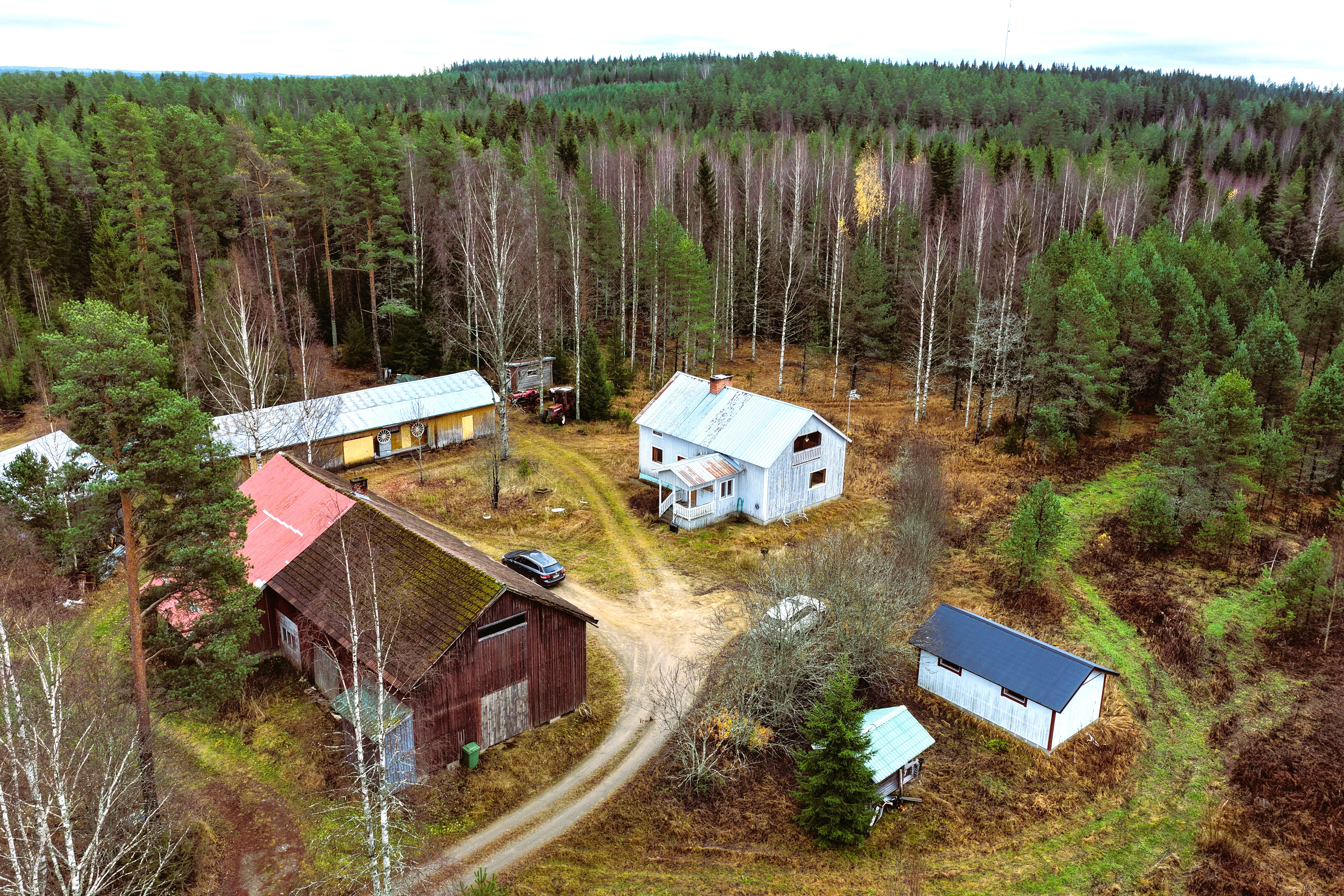 Rakennukset: asuinrakennus, useita talousrakennuksia ja työpajatilat