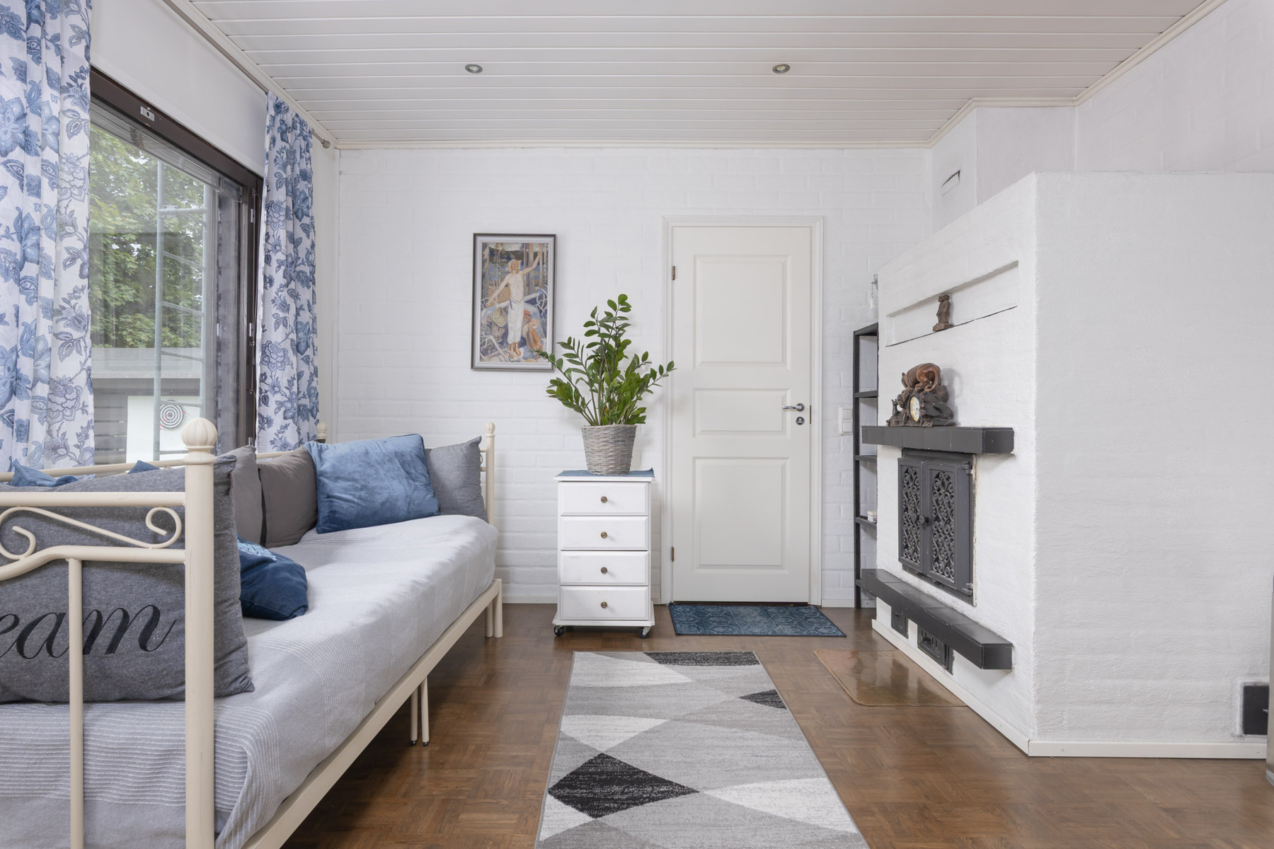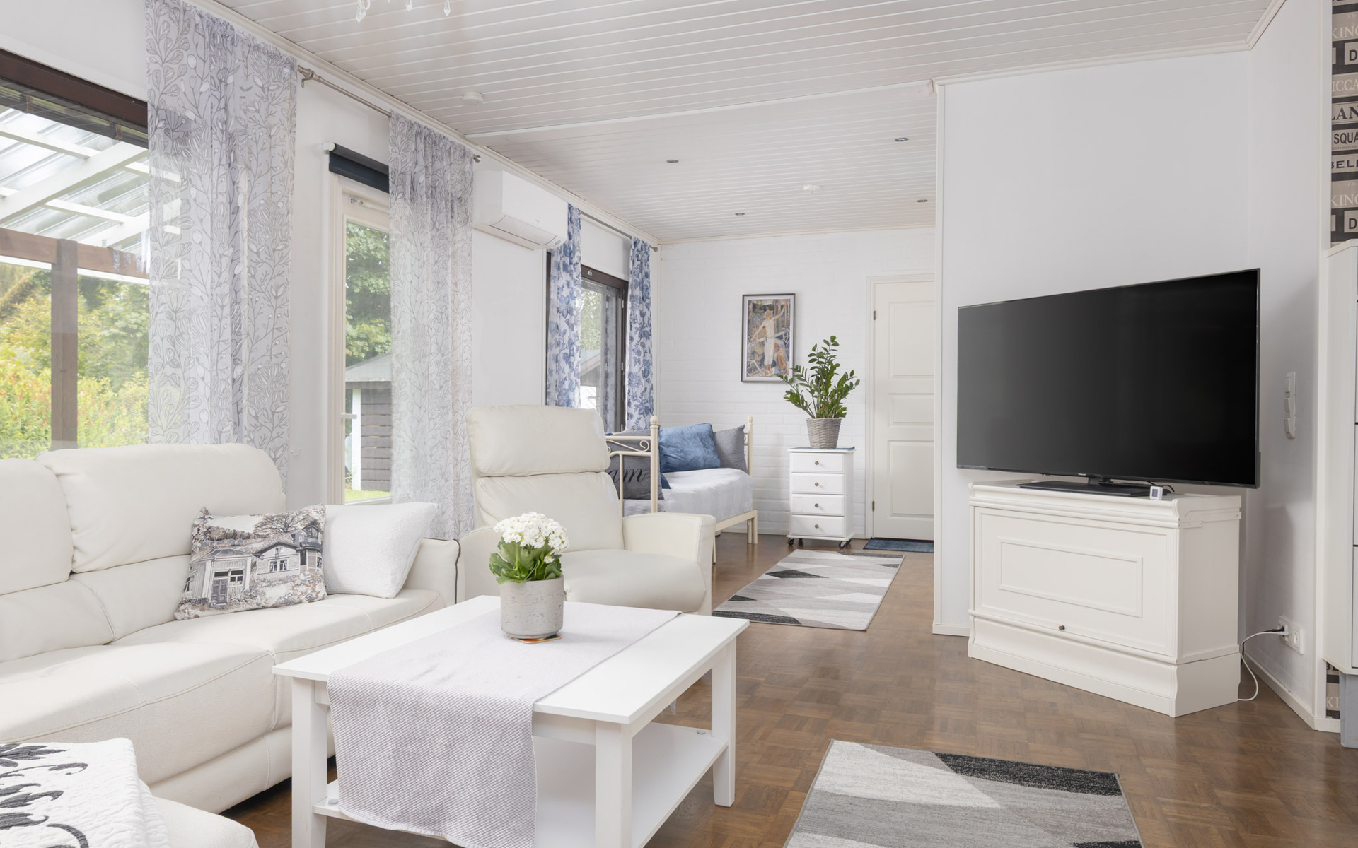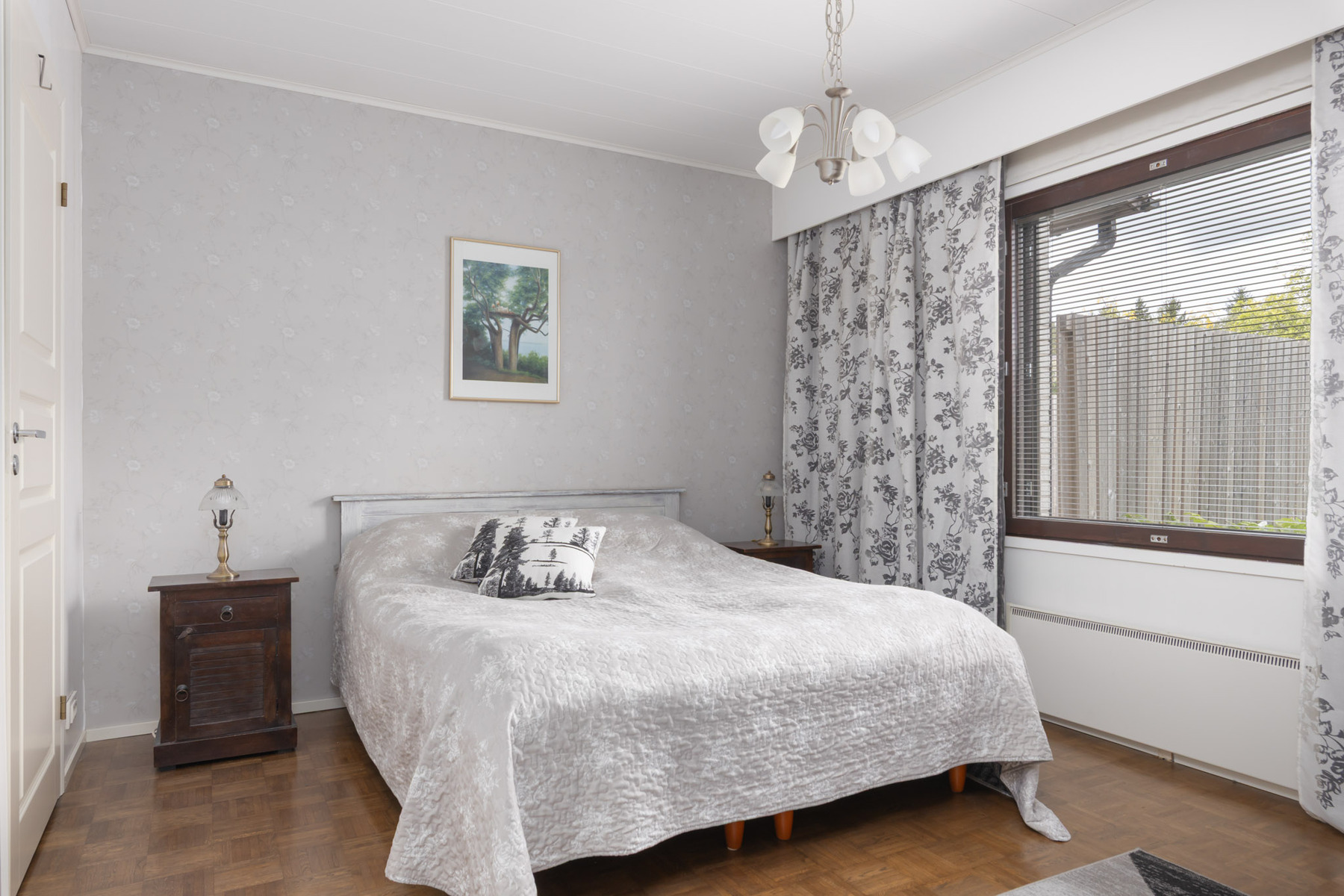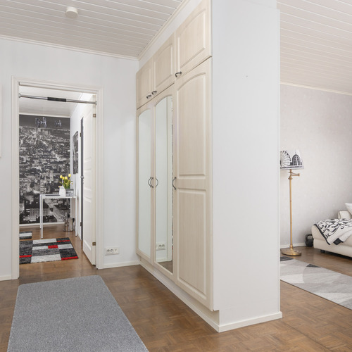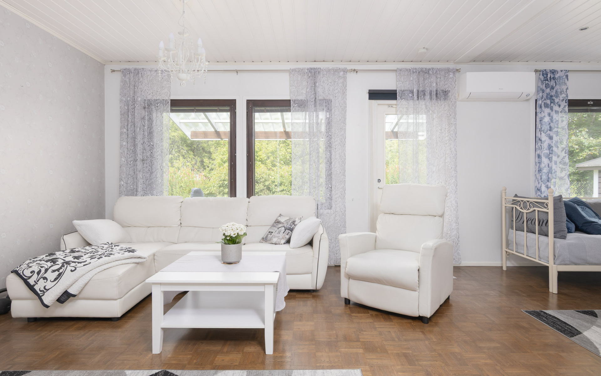 Huoneisto käsittää mm. tilavan olohuoneen, joka jatkuu takkahuoneena, kaksi makuuhuonetta vaatehuoneineen, keittiön, kodinhoitohuoneen, kylpyhuoneen, saunan, wc-tilat sekä runsaasti säilytystiloja. Olohuoneesta avautuu käynti omalle takapihalle, jossa on valokatettu terassi: ja etupihalla on viihtyisä pergola ja grilli – täydelliset puitteet rentoon oleskeluun ja yhdessäoloon.