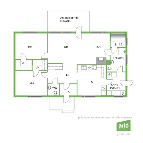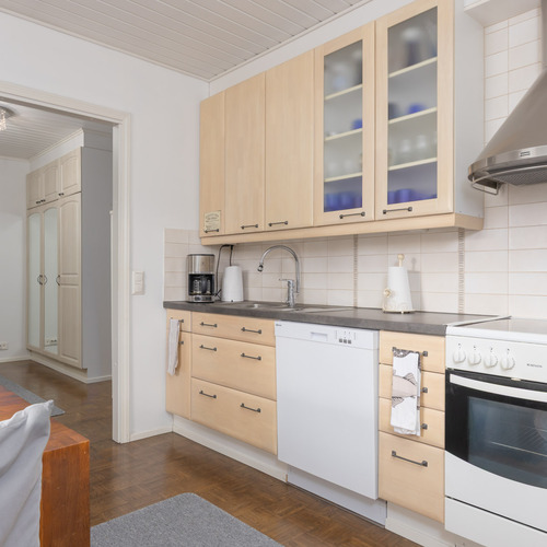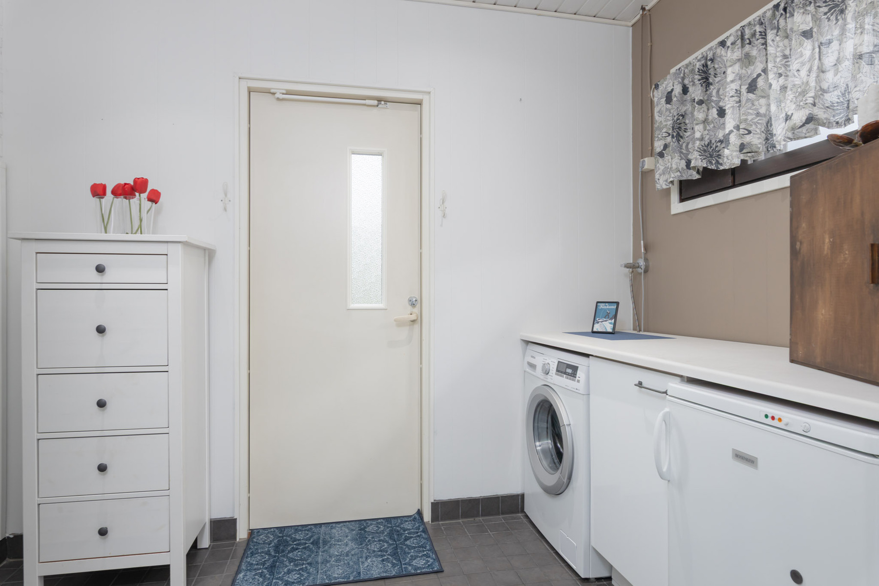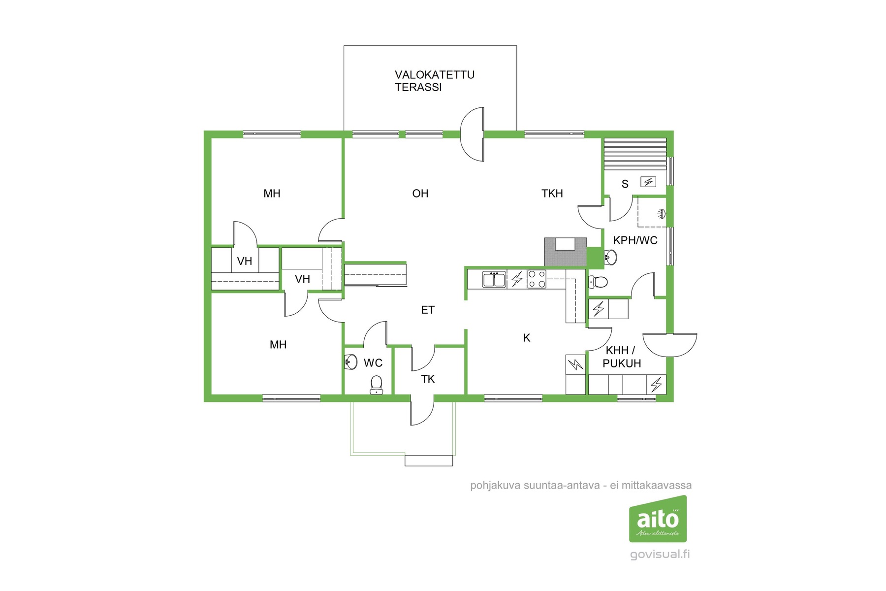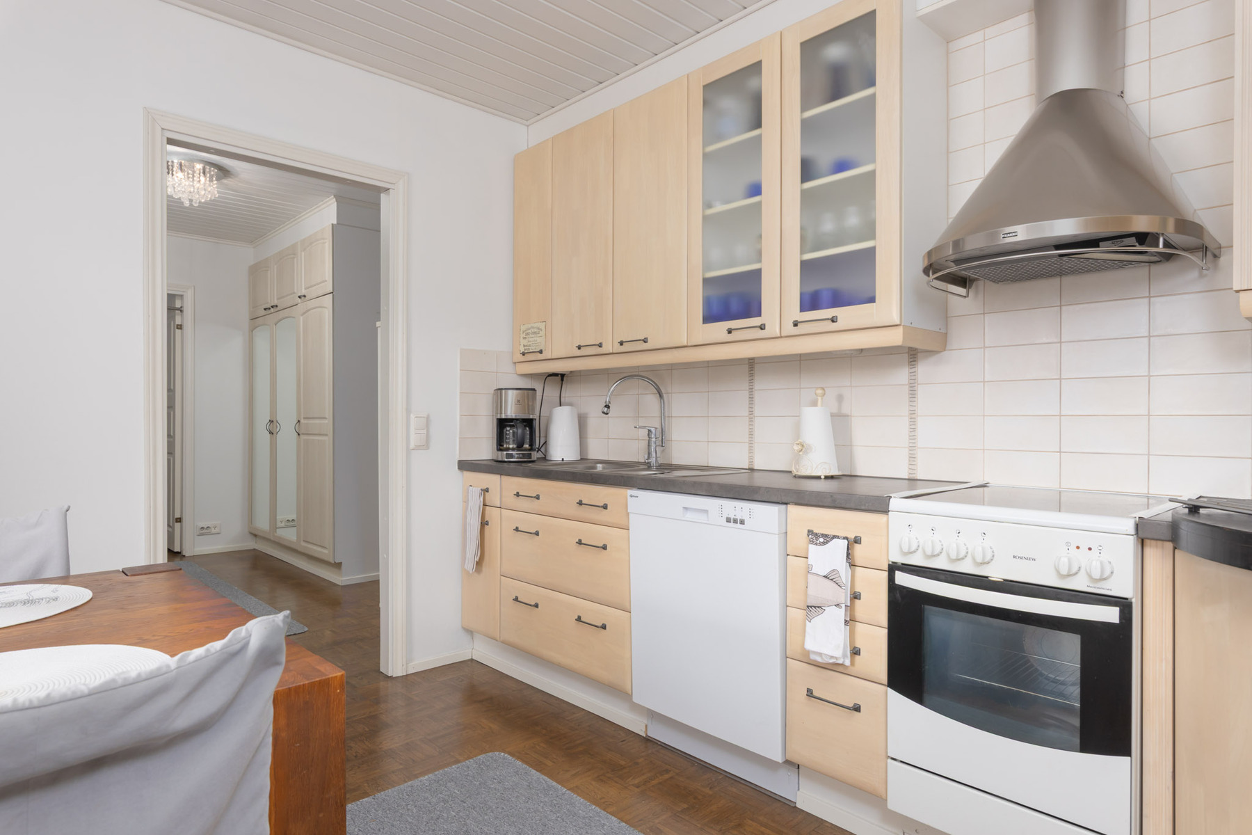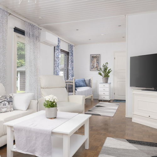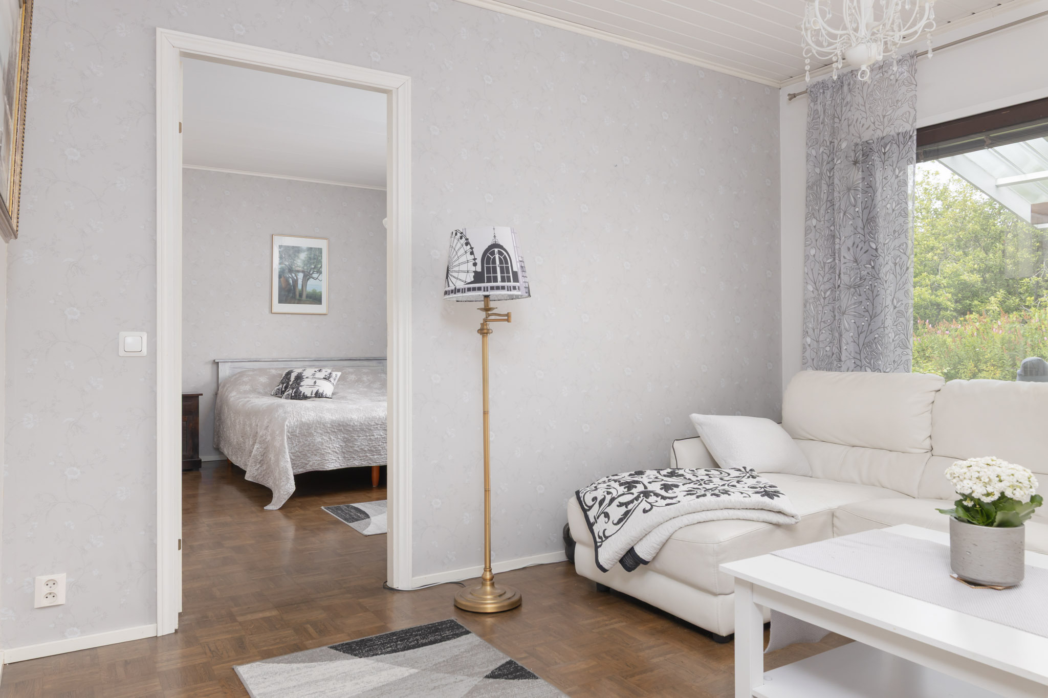 Huoneisto käsittää mm. tilavan olohuoneen, joka jatkuu takkahuoneena, kaksi makuuhuonetta vaatehuoneineen, keittiön, kodinhoitohuoneen, kylpyhuoneen, saunan, wc-tilat sekä runsaasti säilytystiloja. Olohuoneesta avautuu käynti omalle takapihalle, jossa on valokatettu terassi: ja etupihalla on viihtyisä pergola ja grilli – täydelliset puitteet rentoon oleskeluun ja yhdessäoloon.