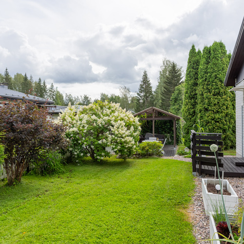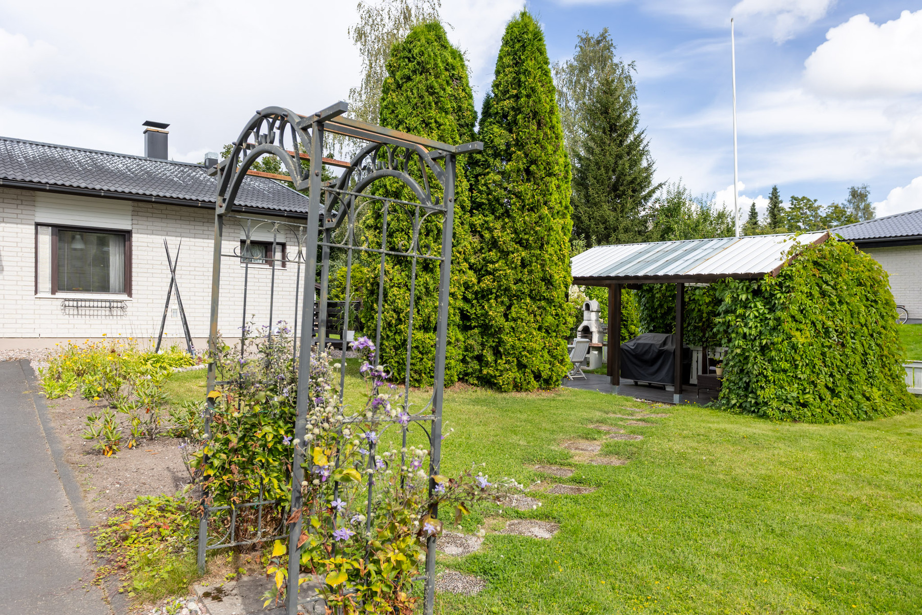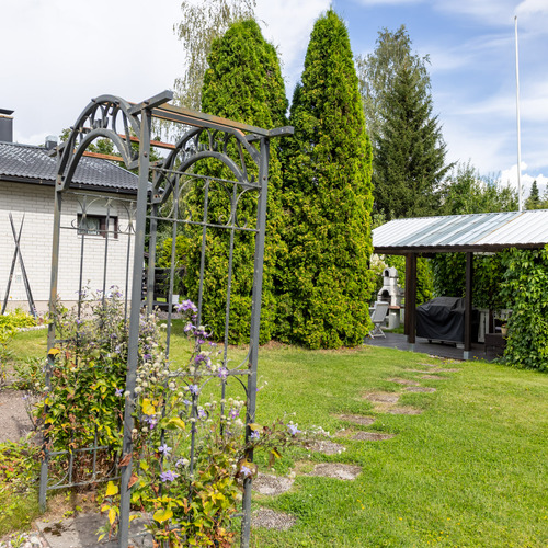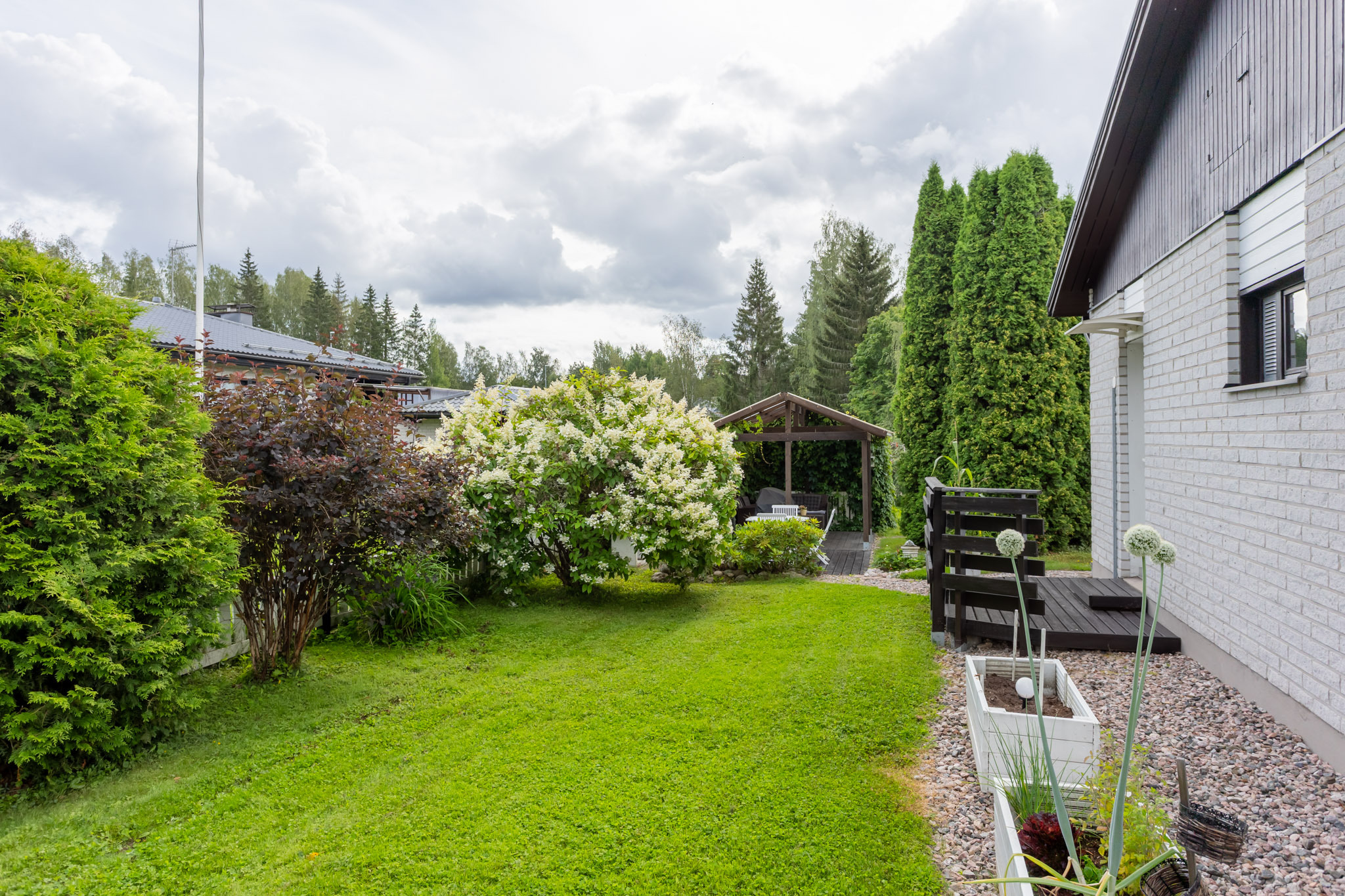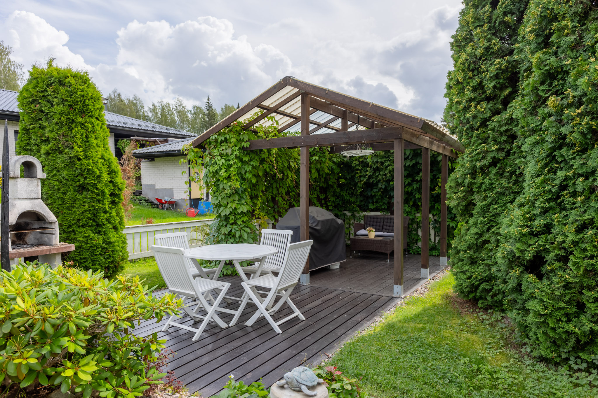 Reilunkokoinen vehreä piha-alue. Pihalla pergola ja grilli. Takapihalla valokatettu terassi. Pihalla myös puuvaja.