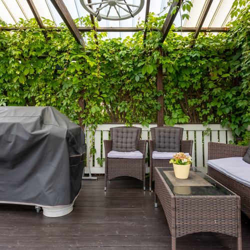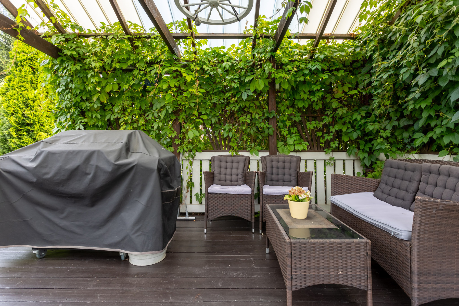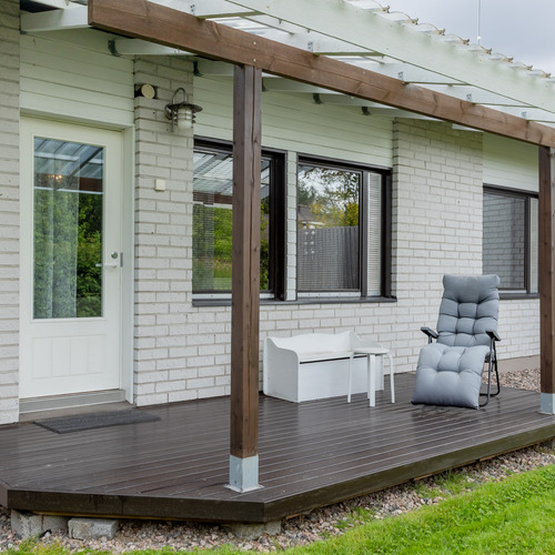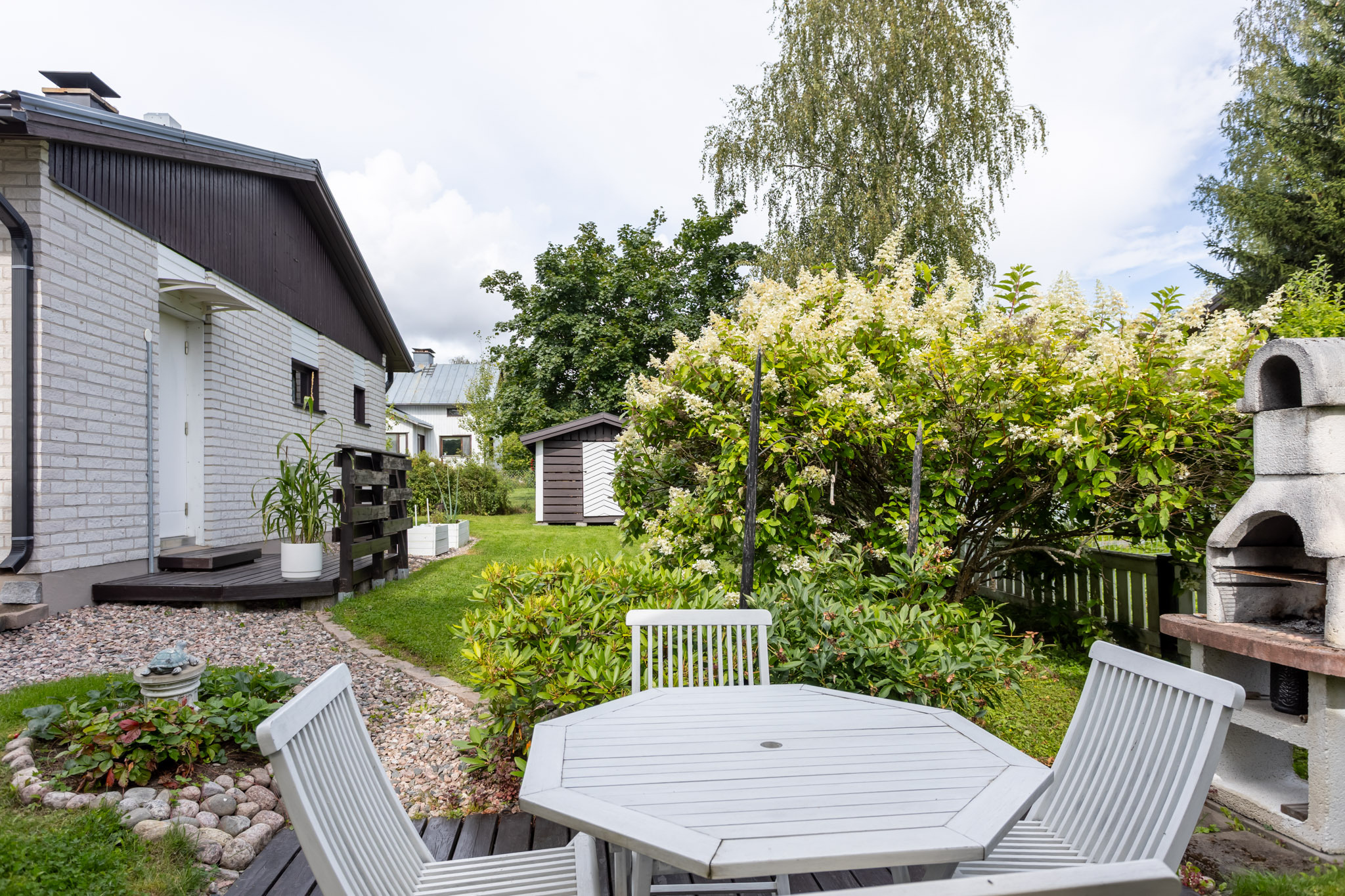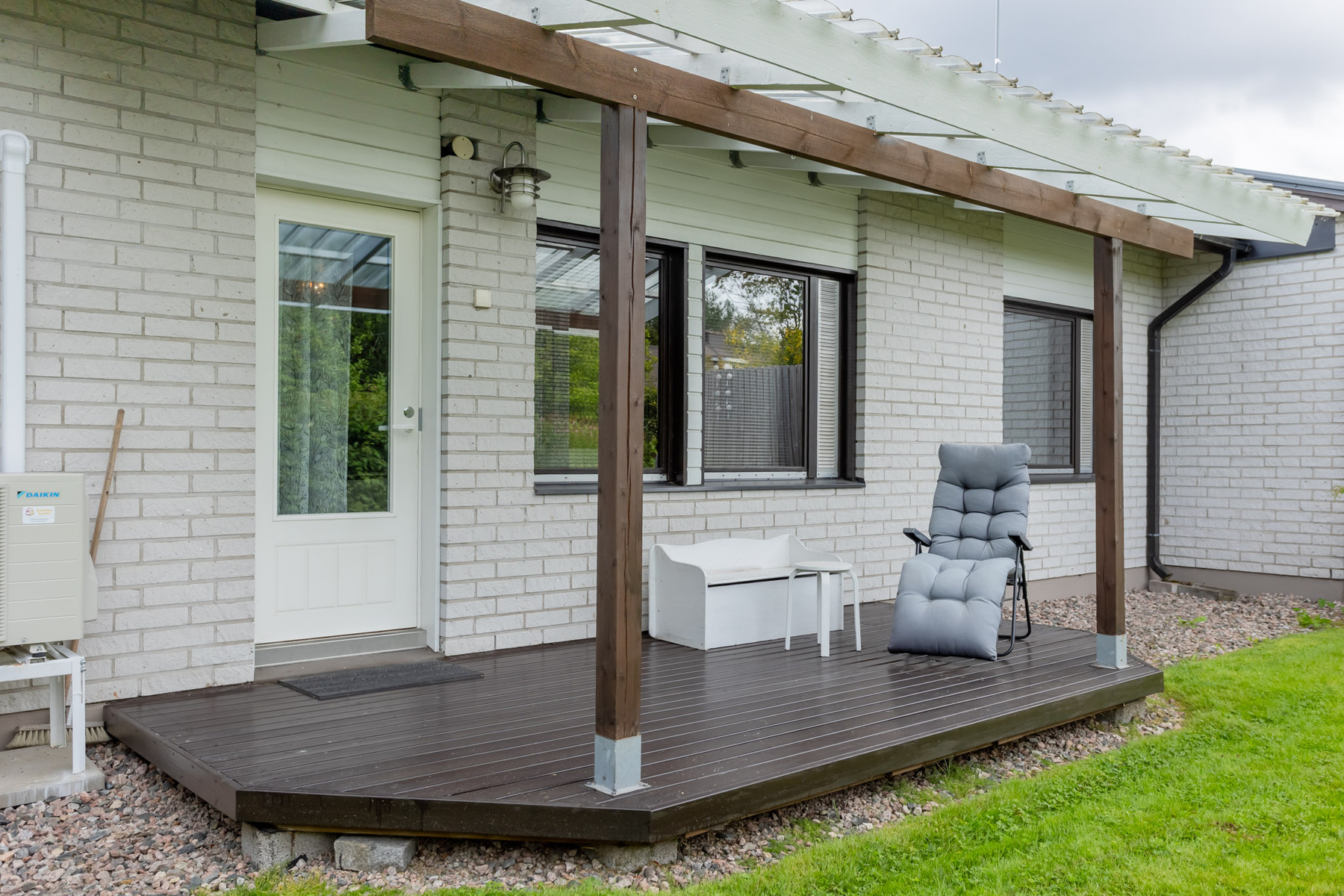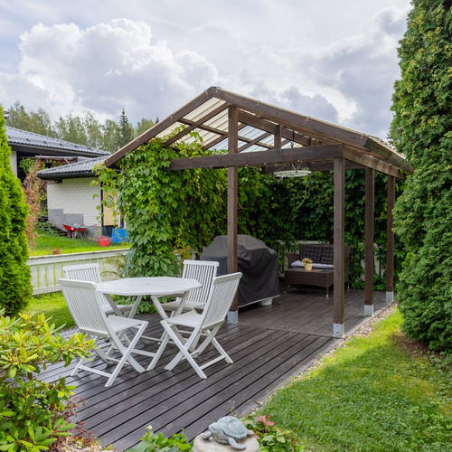 Reilunkokoinen vehreä piha-alue. Pihalla pergola ja grilli. Takapihalla valokatettu terassi. Pihalla myös puuvaja.