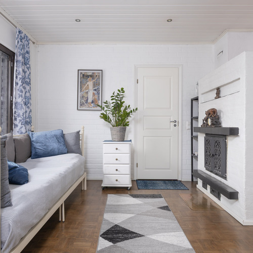 Lauteet, sähkökiuas, ikkuna. Lattiassa laatta.
