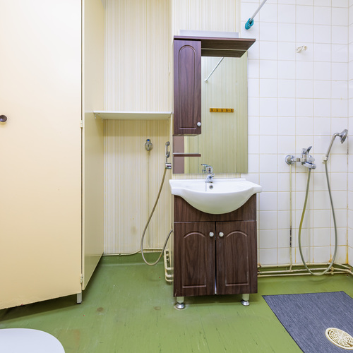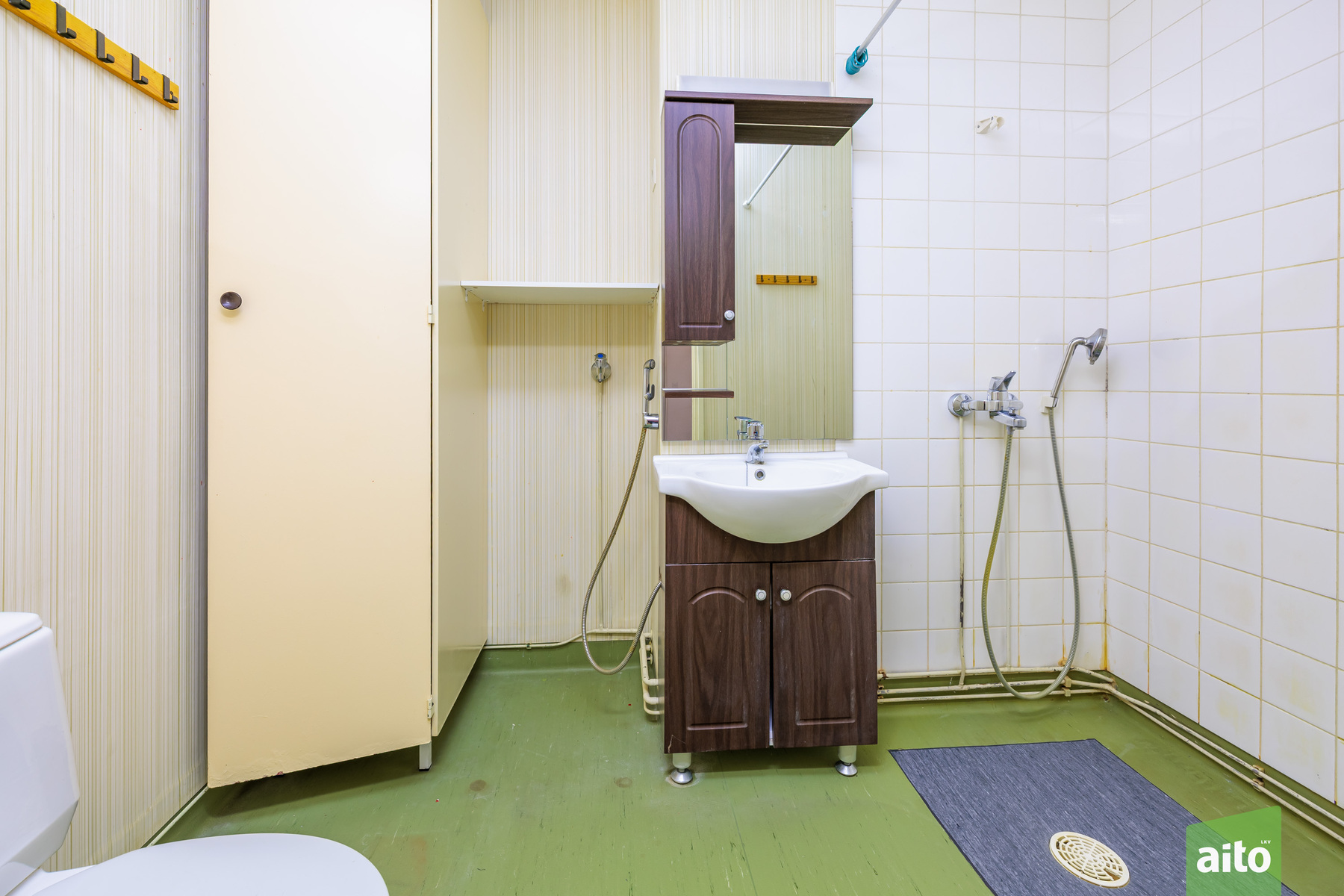 Varusteet: suihku, pesukoneliitäntä, allaskaappi, kylpyhuonekaapistot, peili