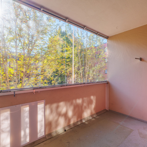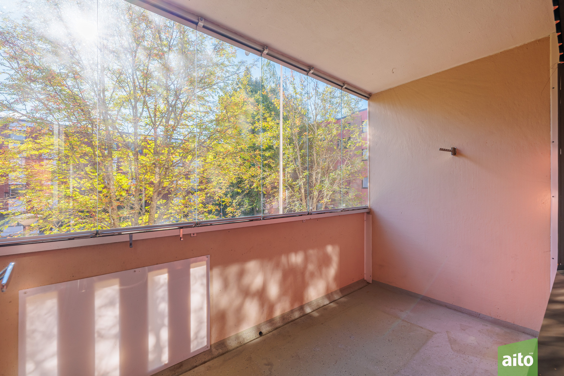 Etelään suuntautuva lasitettu tilava parveke