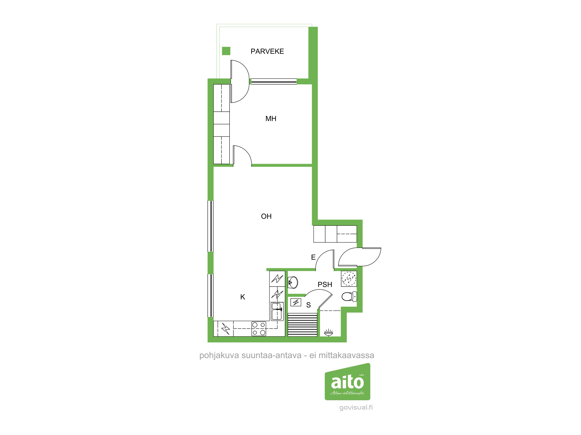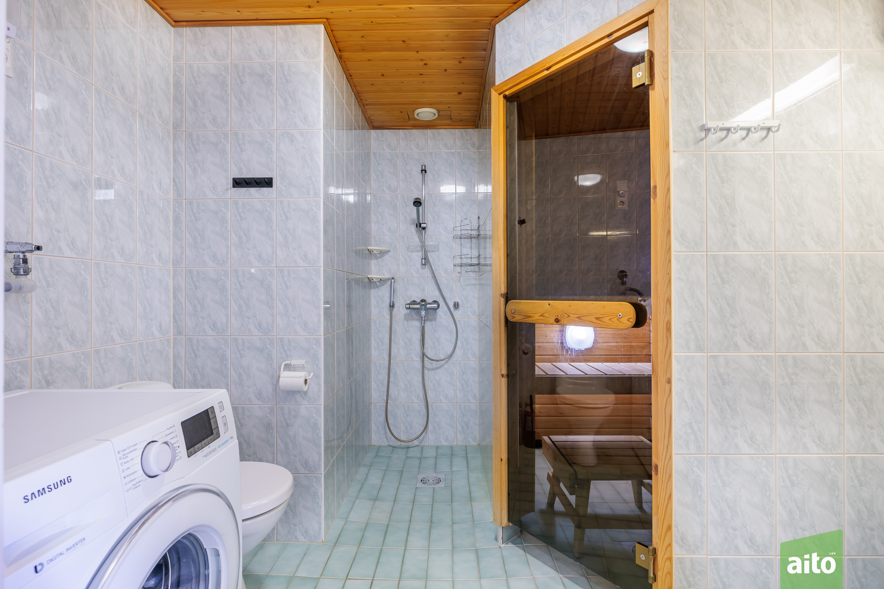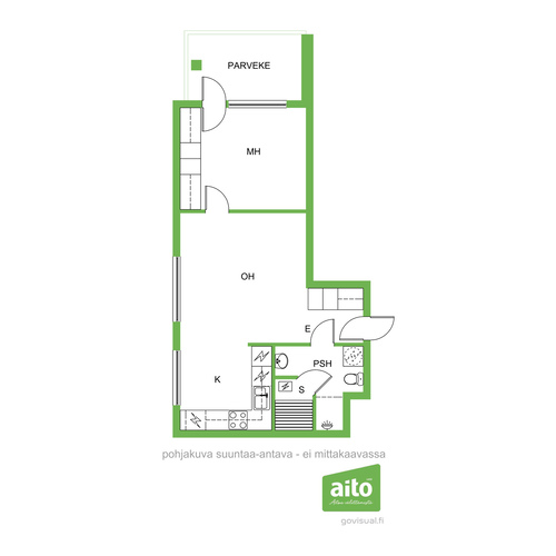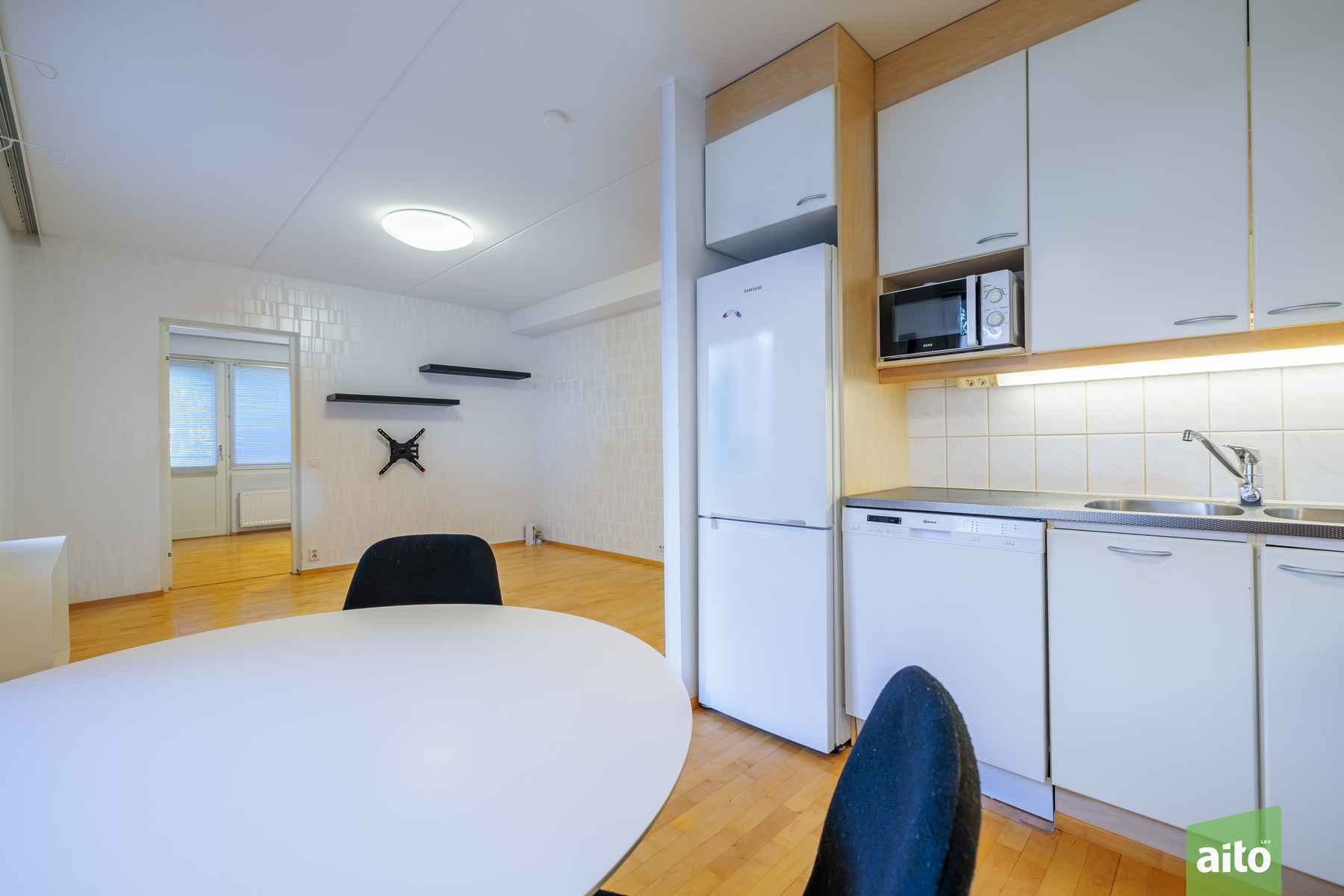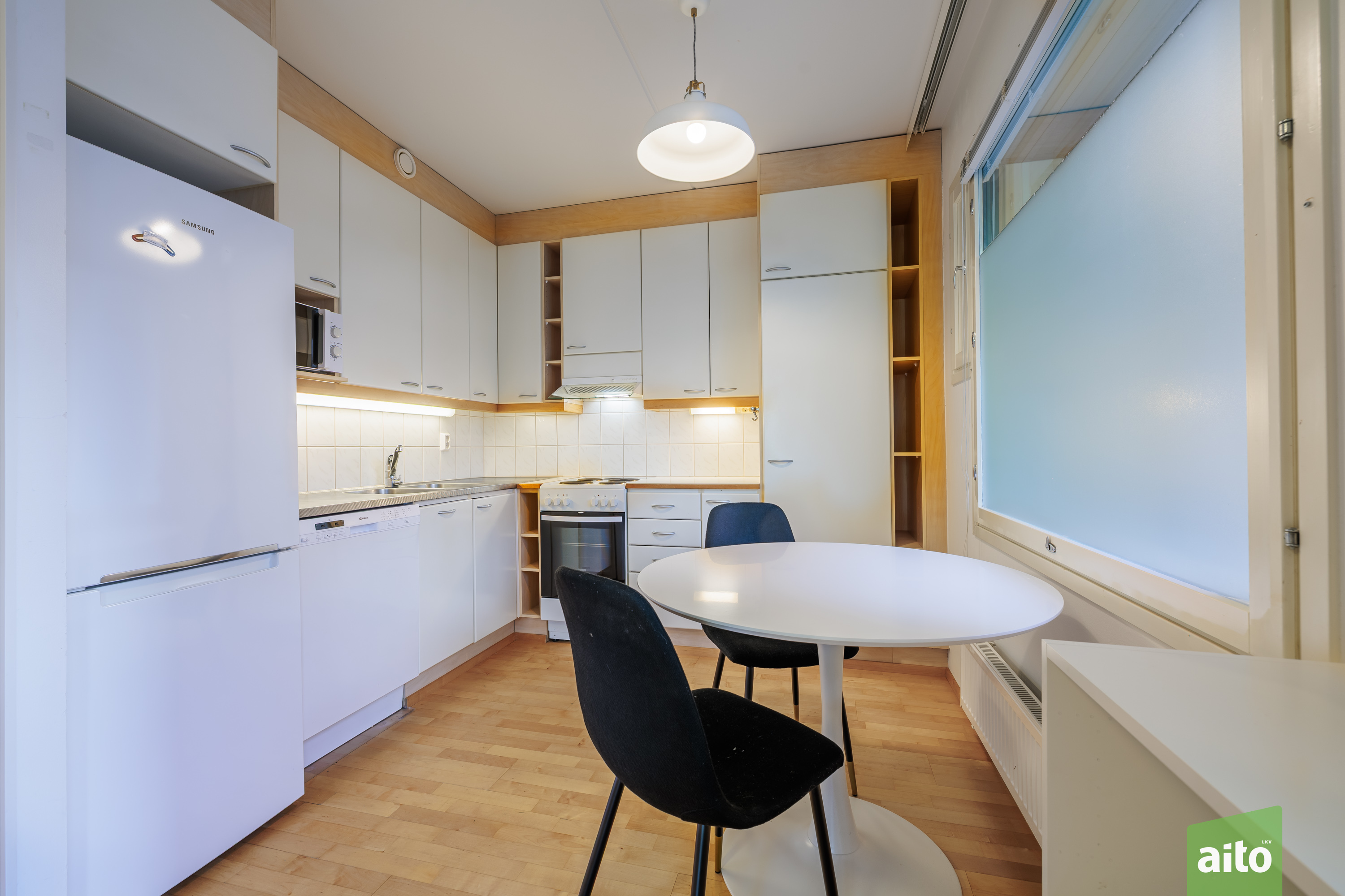 Varusteet: jääkaappipakastin, astianpesukone, mikroaaltouuni, sähköliesi, liesituuletin hormilla