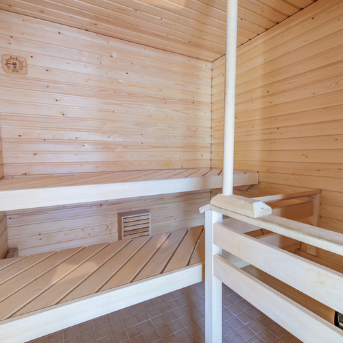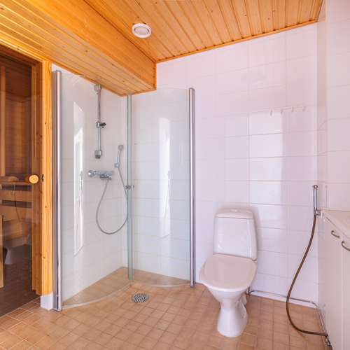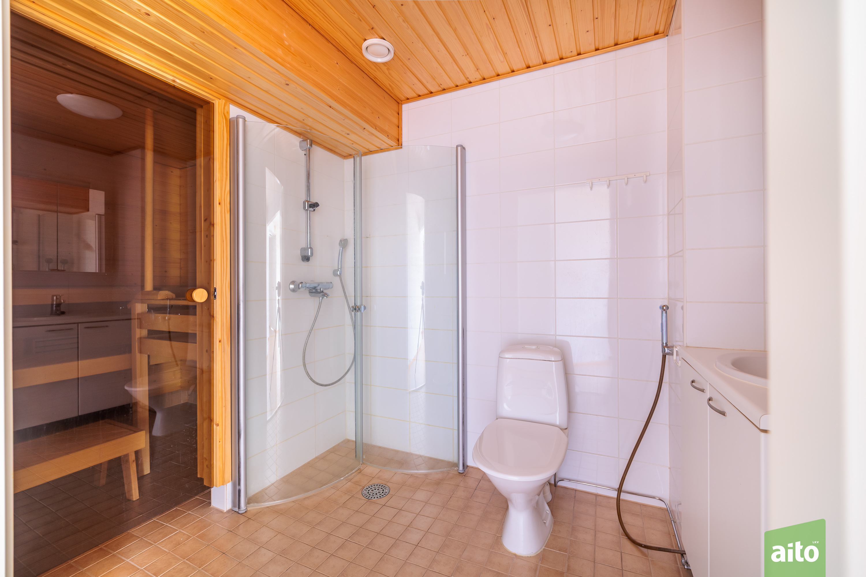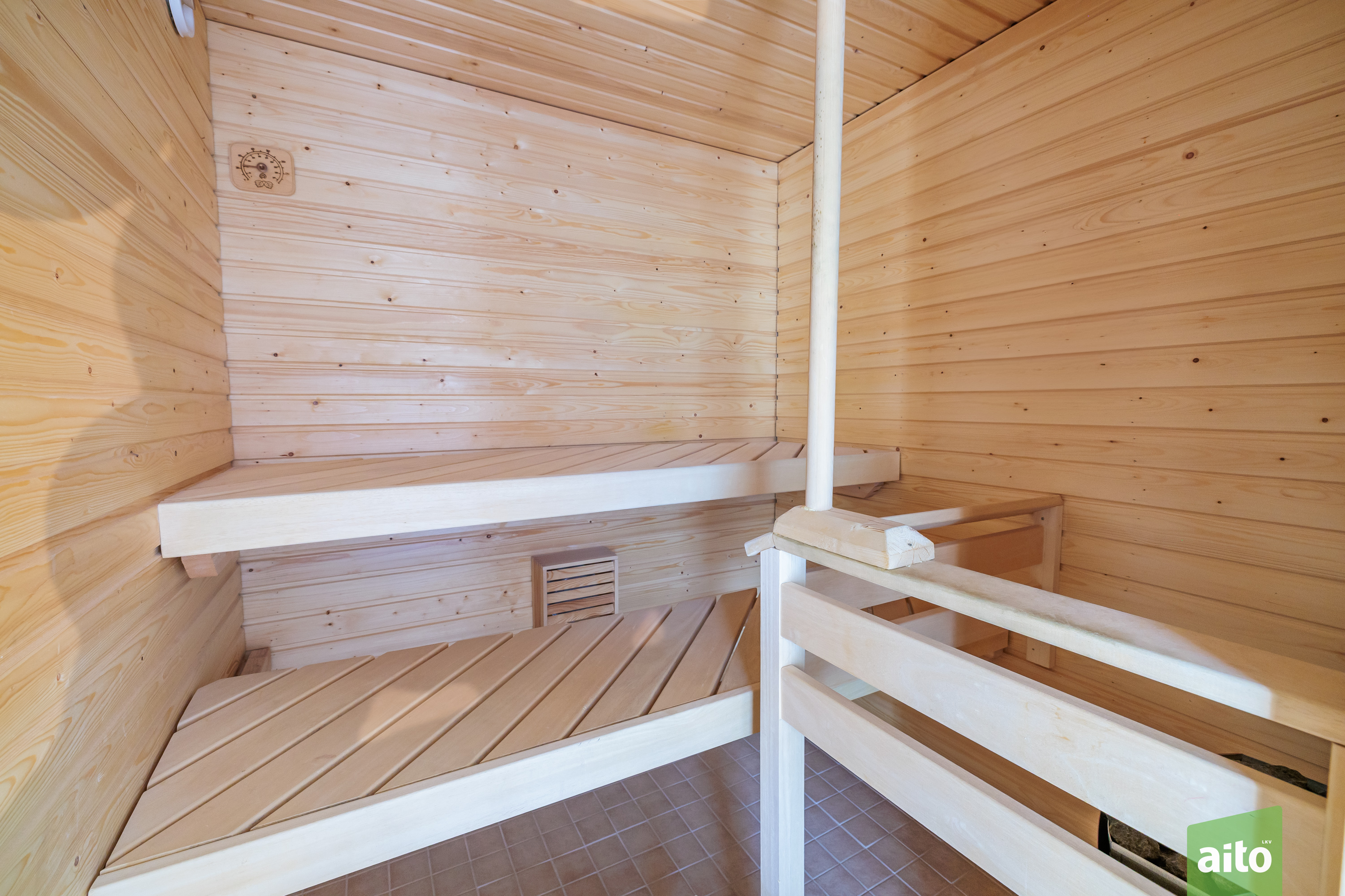 Sauna paneloitu, kokolasinen ovi. Sähkökiuas. Lattiassa laatta.